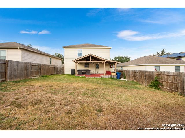 A charming home near the neighborhood park and close to Potranca Creek, this home is nestled in a quiet neighborhood with schools and access to Hwy90/Loop1604 in proximity. Less than 15 minute drive to Lackland AFB! This home boasts many upgrades and features. Garage is EV level 2 ready, kitchen has beautiful quartz counter tops, new stove, dishwasher, and microwave over cooktop. LG Fridge included is 18 months old! Water heater is less than two years old. AC is about 2 years old and is energy efficient, yielding low energy bills during those hot summer months. Ceiling fans throughout the home. The home hosts plenty of storage space including a generously sized pantry in the kitchen. Bedrooms feature walk in closets. The backyard is not to go unnoticed! A spacious covered deck perfect for entertaining, includes the wall-mounted TV shown and includes a lawn mower to maintain this space. The end of the property backs up to a green area with mature trees. Property is well maintained and more than inviting- come make this home yours today!