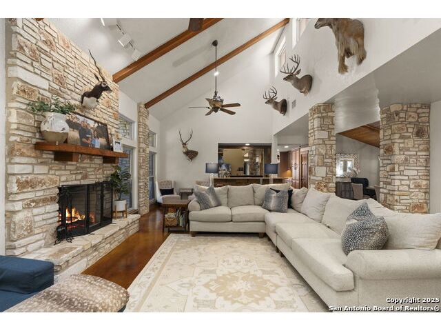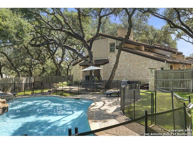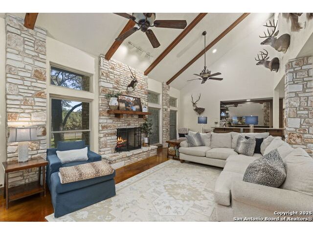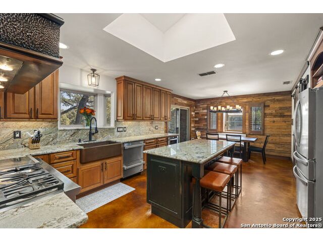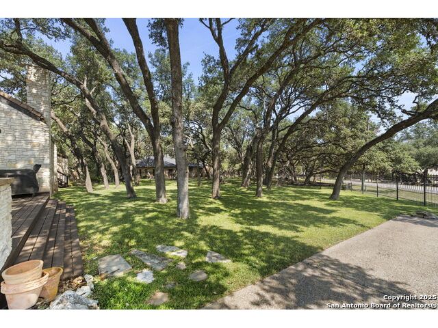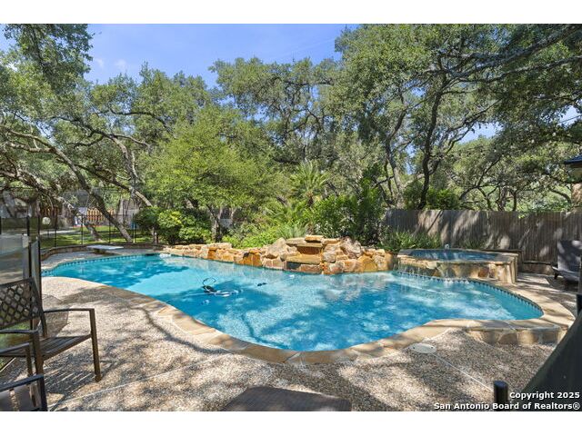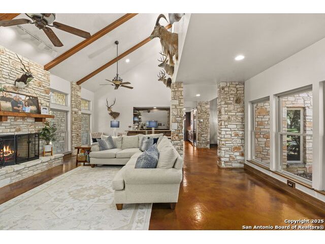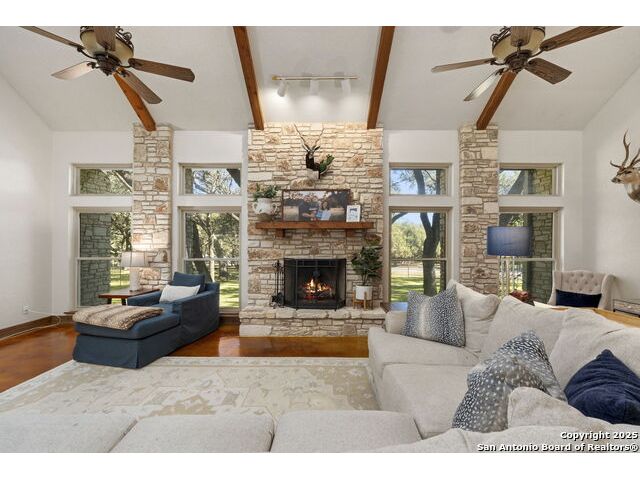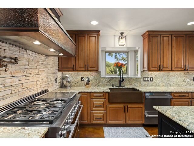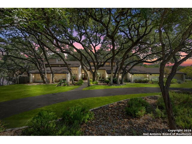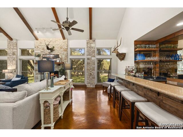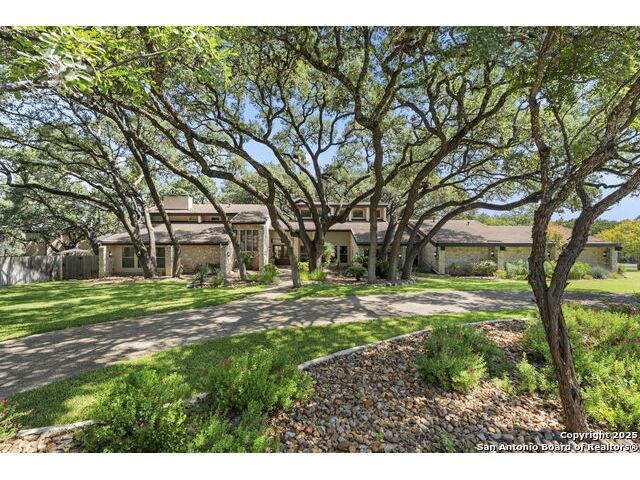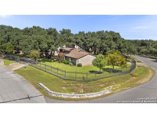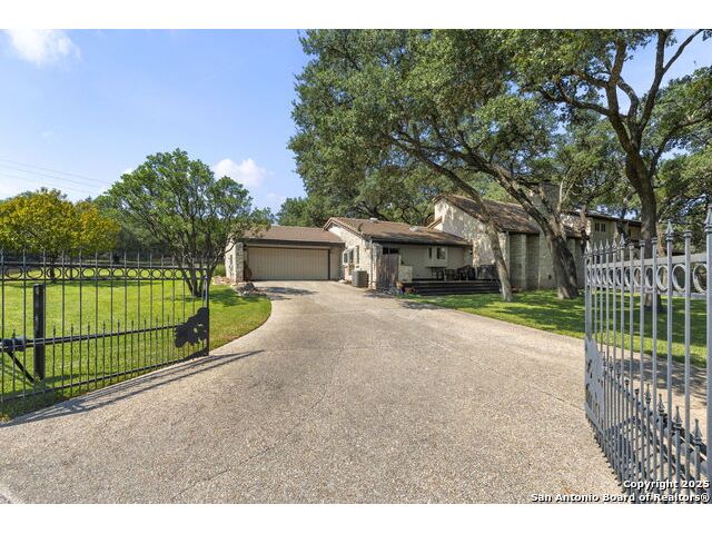 Experience Hill Country elegance at its finest in this one-of-a-kind single-story estate nestled within the prestigious guard gated community of Scenic Oaks-just minutes from Boerne and San Antonio. Perfectly positioned on a 1-acre corner lot, this 3,817-sq-ft residence delivers an unmatched blend of sophistication, functionality, and resort-style living. From the moment you arrive, the iron-fenced grounds, dual electric gates, circular driveway, and freshly landscaped lawn surrounded by 90 mature oak trees set an extraordinary tone of beauty and privacy. Step inside to discover an entertainer's dream home featuring stained concrete floors, stone fireplaces in both living areas and the primary suite, and an inviting wet bar that seamlessly connects your gathering spaces. The luxury kitchen is a true showstopper-boasting a DCS 5-burner gas range, double ovens, pot filler, custom copper vent hood, and a farmhouse sink-all designed for those who love to cook and entertain in style. The home's thoughtful floor plan offers multiple living areas, a dedicated study, gym, and a charming breakfast nook overlooking the backyard oasis. Outdoors, every detail has been perfected for leisure and entertainment-from the diving pool and spa, to the dual decks and covered patio, to the full batting cage ready for your next game night or practice session. Immaculately maintained and filled with character, this property embodies the perfect balance of luxury, privacy, and Hill Country charm. Schedule your private showing today-homes like this rarely come to market in Scenic Oaks!