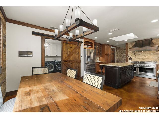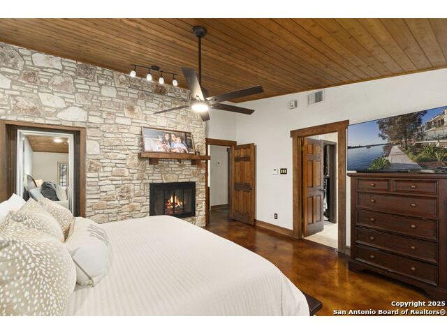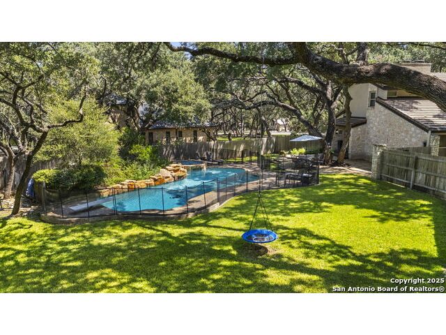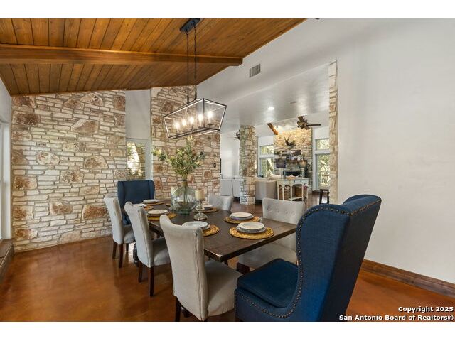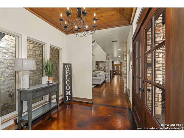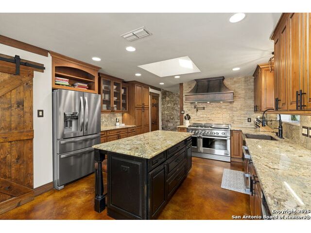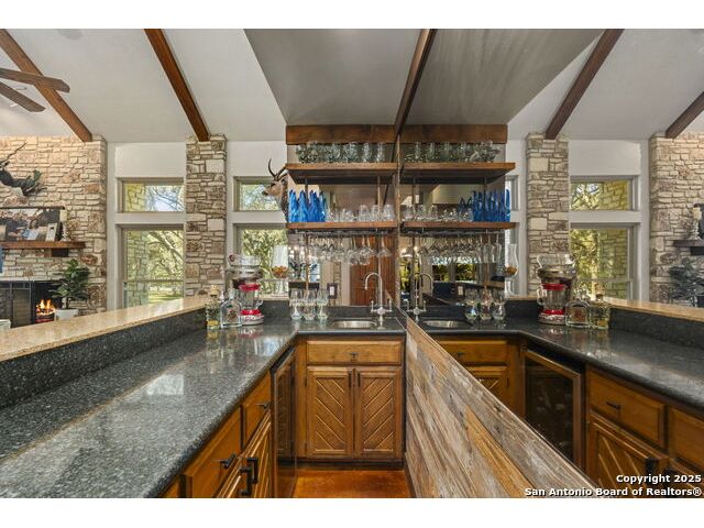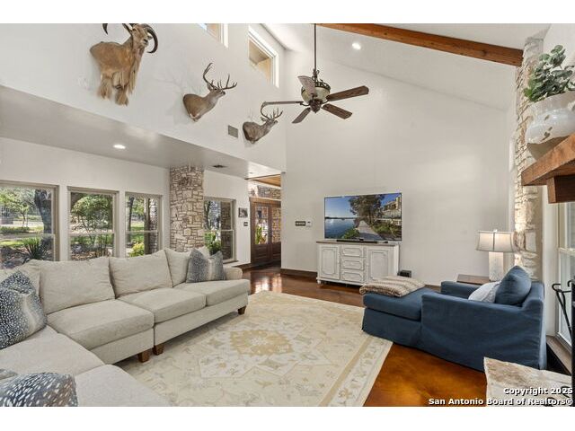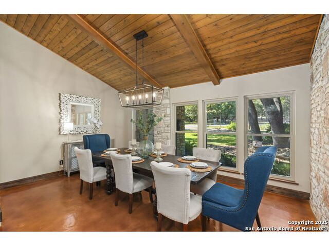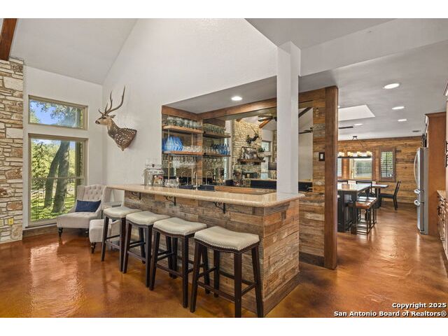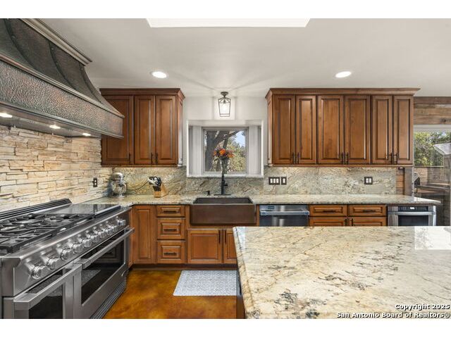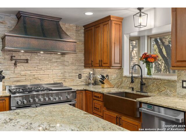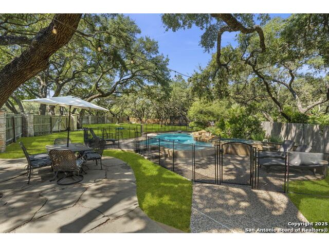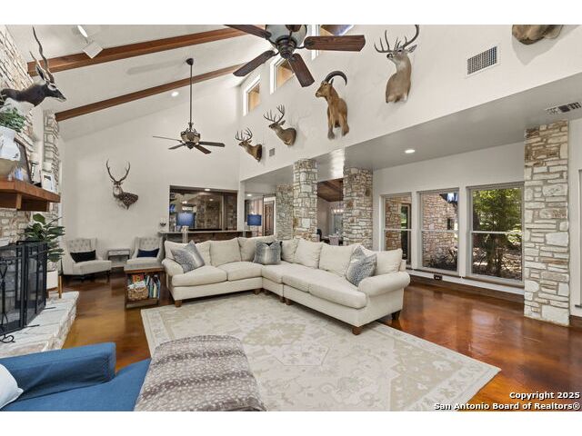Experience Hill Country elegance at its finest in this one-of-a-kind single-story estate nestled within the prestigious guard gated community of Scenic Oaks-just minutes from Boerne and San Antonio. Perfectly positioned on a 1-acre corner lot, this 3,817-sq-ft residence delivers an unmatched blend of sophistication, functionality, and resort-style living. From the moment you arrive, the iron-fenced grounds, dual electric gates, circular driveway, and freshly landscaped lawn surrounded by 90 mature oak trees set an extraordinary tone of beauty and privacy. Step inside to discover an entertainer's dream home featuring stained concrete floors, stone fireplaces in both living areas and the primary suite, and an inviting wet bar that seamlessly connects your gathering spaces. The luxury kitchen is a true showstopper-boasting a DCS 5-burner gas range, double ovens, pot filler, custom copper vent hood, and a farmhouse sink-all designed for those who love to cook and entertain in style. The home's thoughtful floor plan offers multiple living areas, a dedicated study, gym, and a charming breakfast nook overlooking the backyard oasis. Outdoors, every detail has been perfected for leisure and entertainment-from the diving pool and spa, to the dual decks and covered patio, to the full batting cage ready for your next game night or practice session. Immaculately maintained and filled with character, this property embodies the perfect balance of luxury, privacy, and Hill Country charm. Schedule your private showing today-homes like this rarely come to market in Scenic Oaks!