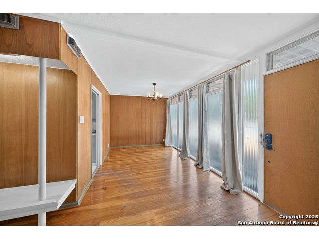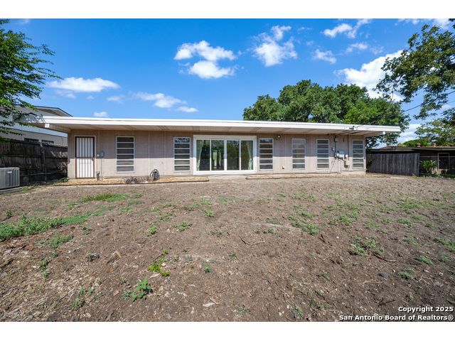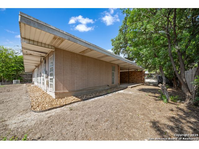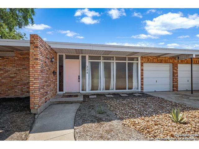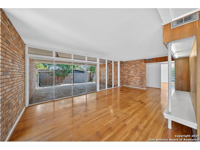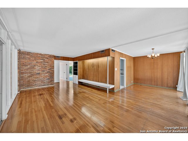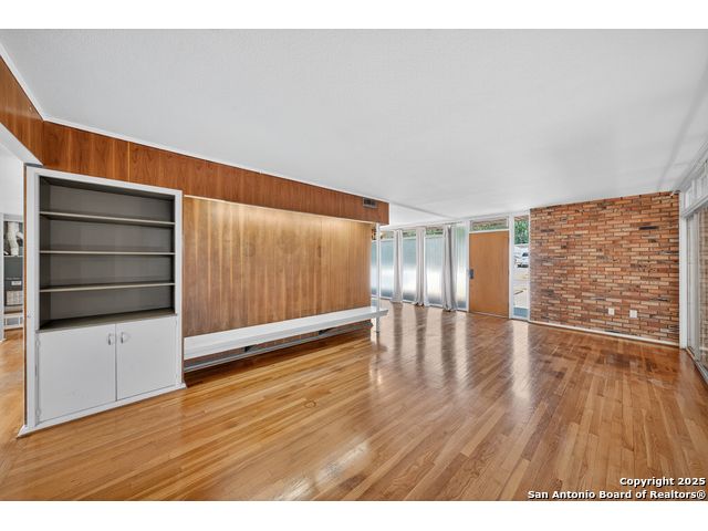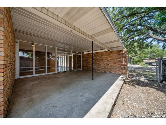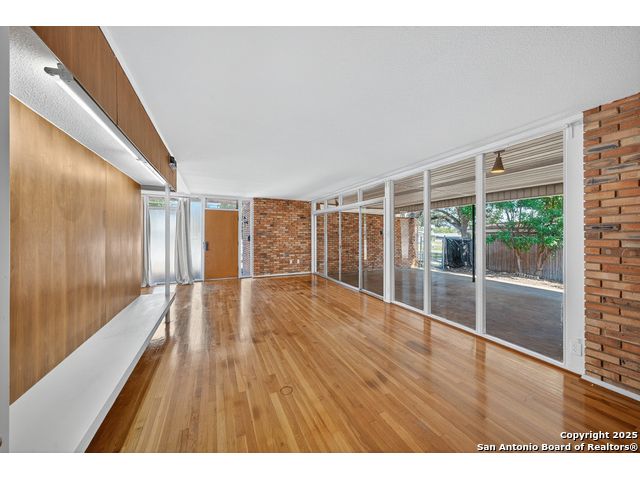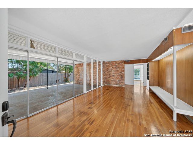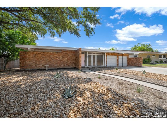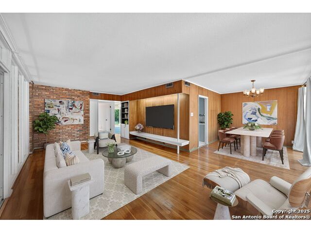 A true mid-century ranch filled with the character and nostalgia of the 1950's. The warm brick interior makes the space feel inviting and grounded, while a 20-foot stretch of floor-to-ceiling windows fills the living area with natural light and creates a beautiful connection between the indoors and the covered patio. Transfer the patio into another living area with outdoor dining, comfortable seating, and a projector for fall movie nights to spend evenings with family and friends. Inside, the original wood paneling adds texture and charm, giving the home a timeless midcentury warmth. The front room, where a 13-foot line of windows stretches across the wall filling it with natural light. Great location in the heart of San Antonio, just minutes from La Cantera, North Star, and Downtown. Wonderful neighbors that exemplify community. This house has warmth, history, and personality that make you feel at home the moment you walk in.