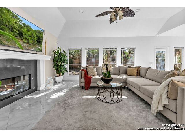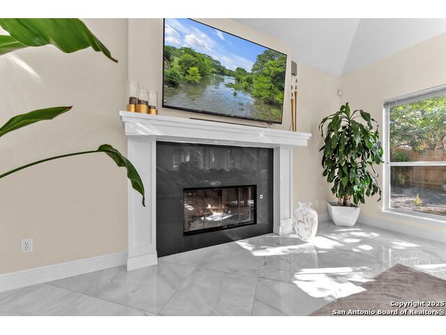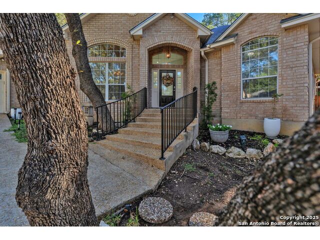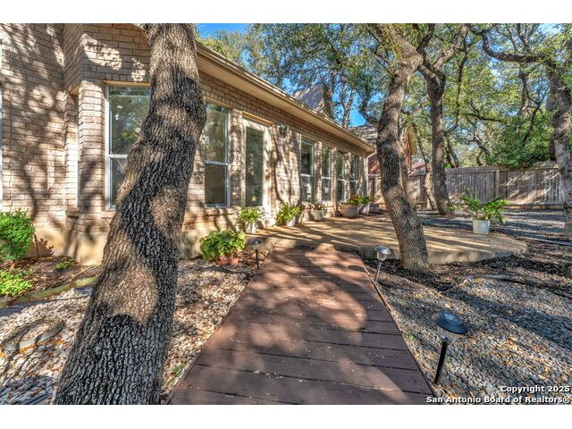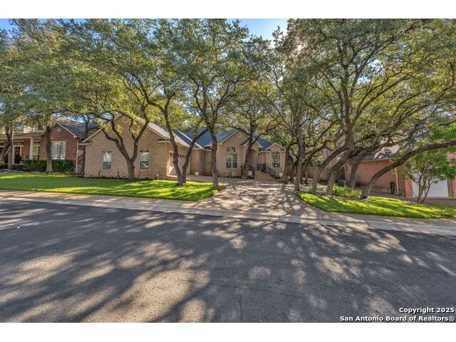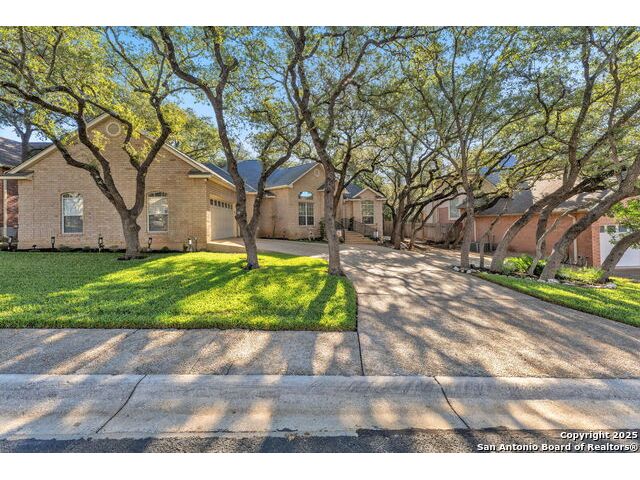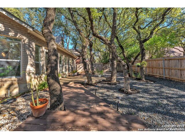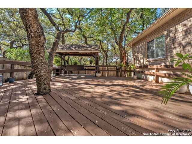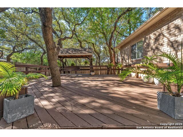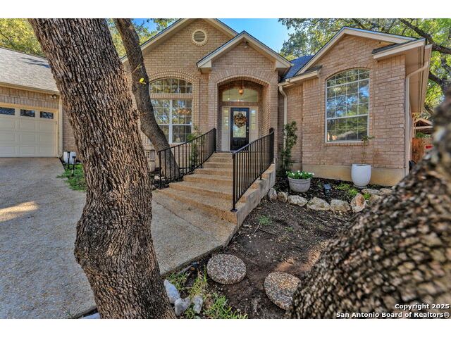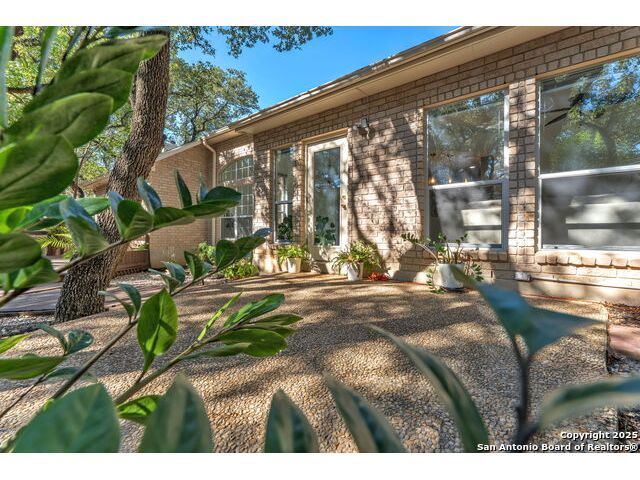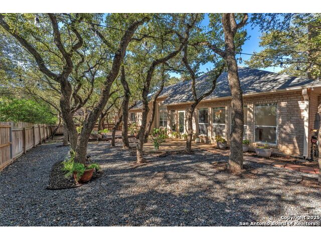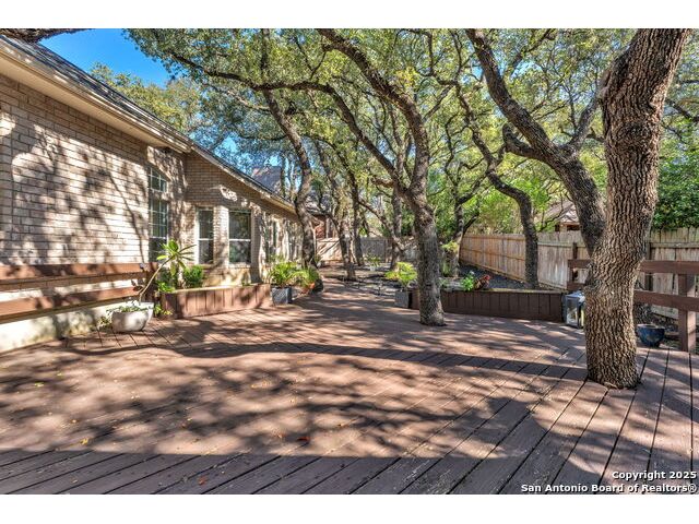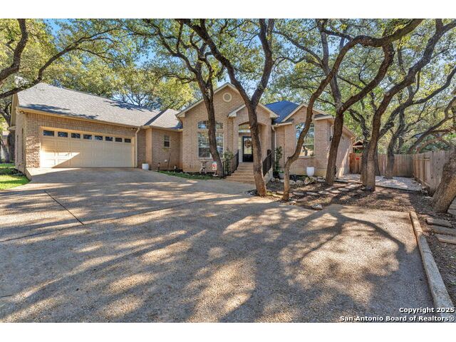 Welcome to this beautifully maintained single-story residence located in the prestigious, guard-gated community of Emerald Forest. Offering approximately 2,439 square feet of living space, this home sits on a generous, tree-shaded lot and combines timeless curb appeal with thoughtful modern updates. Inside, you'll find a spacious open floor plan designed for both everyday living and entertaining. The living area features vaulted ceilings, a cozy fireplace, and large picture windows that fill the home with natural light, creating a warm and inviting atmosphere. The kitchen has been tastefully updated with custom cabinetry, quartz countertops, and premium ceramic tile flooring, providing both style and function. Adjacent to the kitchen, the dining area offers an elegant space for family meals or gatherings with friends. The primary suite is privately situated and serves as a relaxing retreat with a large walk-in closet and a spa-inspired bath showcasing dual vanities, a soaking tub, and a separate shower. Two additional bedrooms provide flexibility for guests, a home office, or hobby space, each complemented by an updated full bath. Outside, enjoy a well-landscaped yard with mature trees and an oversized deck, perfect for outdoor dining, entertaining, or simply unwinding in the peaceful surroundings. The property has been lovingly cared for, with a newer roof, fresh exterior paint, and meticulous attention to detail throughout. Located within Emerald Forest, residents enjoy a secure, guard-gated environment and access to community amenities including a pool, tennis courts, sports courts, walking trails, and a clubhouse. The neighborhood's convenient North San Antonio location offers easy access to shopping, dining, highly rated schools, and major highways, ensuring comfort and convenience without sacrificing tranquility. Combining modern updates, classic design, and a premier location, 18210 Crystal Ridge Dr. is an exceptional opportunity to own a move-in-ready home in one of San Antonio's most desirable gated communities.