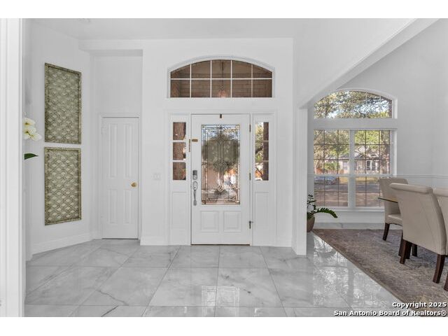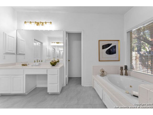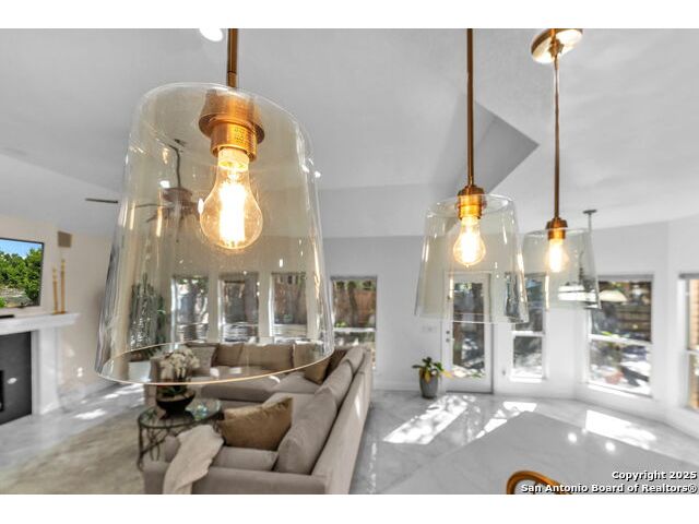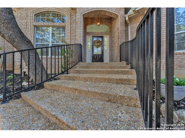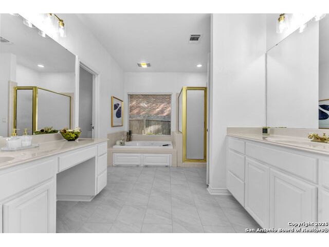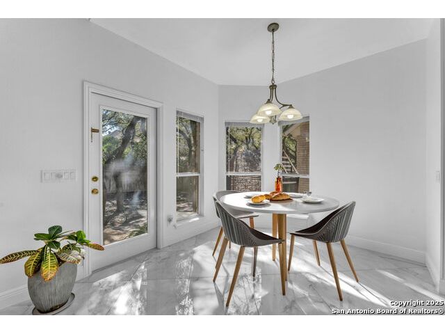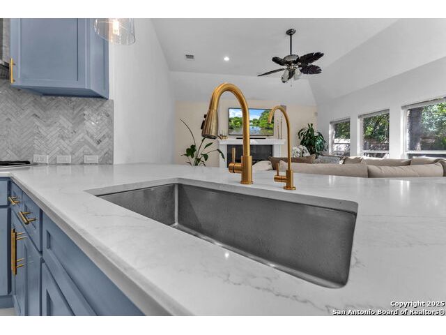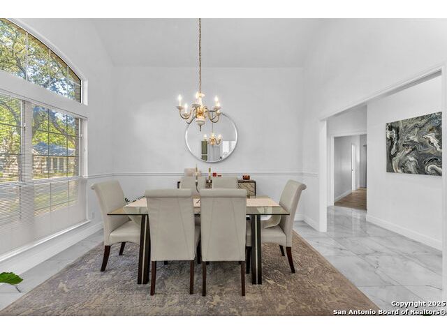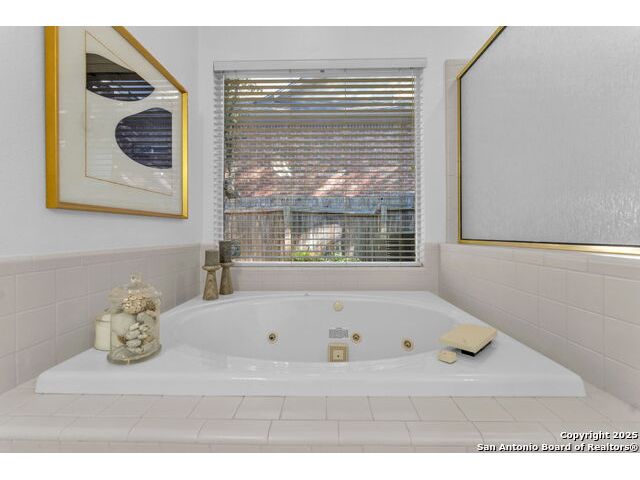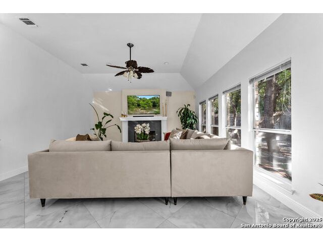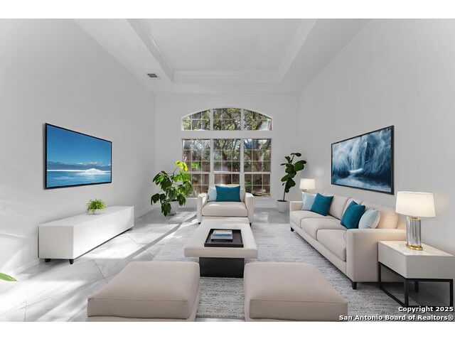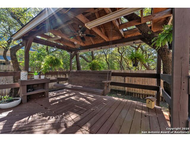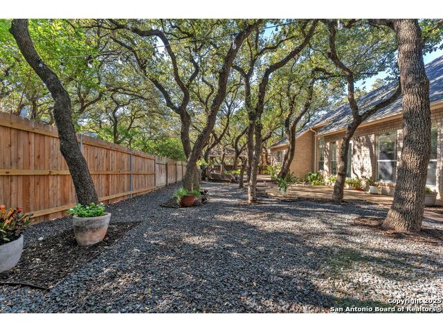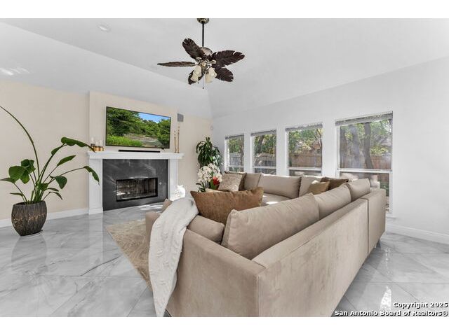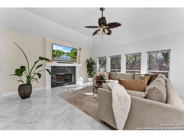 Welcome to this beautifully maintained single-story residence located in the prestigious, guard-gated community of Emerald Forest. Offering approximately 2,439 square feet of living space, this home sits on a generous, tree-shaded lot and combines timeless curb appeal with thoughtful modern updates. Inside, you'll find a spacious open floor plan designed for both everyday living and entertaining. The living area features vaulted ceilings, a cozy fireplace, and large picture windows that fill the home with natural light, creating a warm and inviting atmosphere. The kitchen has been tastefully updated with custom cabinetry, quartz countertops, and premium ceramic tile flooring, providing both style and function. Adjacent to the kitchen, the dining area offers an elegant space for family meals or gatherings with friends. The primary suite is privately situated and serves as a relaxing retreat with a large walk-in closet and a spa-inspired bath showcasing dual vanities, a soaking tub, and a separate shower. Two additional bedrooms provide flexibility for guests, a home office, or hobby space, each complemented by an updated full bath. Outside, enjoy a well-landscaped yard with mature trees and an oversized deck, perfect for outdoor dining, entertaining, or simply unwinding in the peaceful surroundings. The property has been lovingly cared for, with a newer roof, fresh exterior paint, and meticulous attention to detail throughout. Located within Emerald Forest, residents enjoy a secure, guard-gated environment and access to community amenities including a pool, tennis courts, sports courts, walking trails, and a clubhouse. The neighborhood's convenient North San Antonio location offers easy access to shopping, dining, highly rated schools, and major highways, ensuring comfort and convenience without sacrificing tranquility. Combining modern updates, classic design, and a premier location, 18210 Crystal Ridge Dr. is an exceptional opportunity to own a move-in-ready home in one of San Antonio's most desirable gated communities.