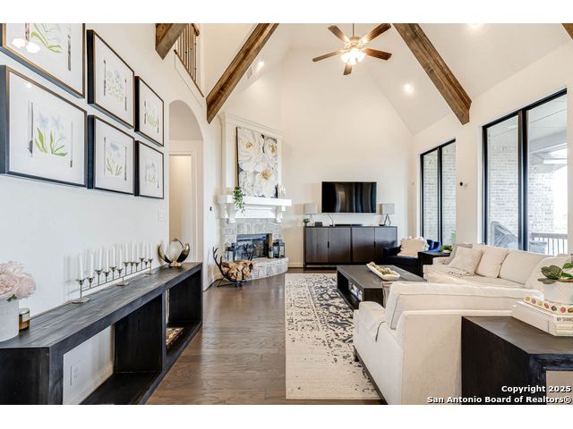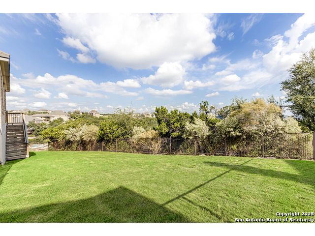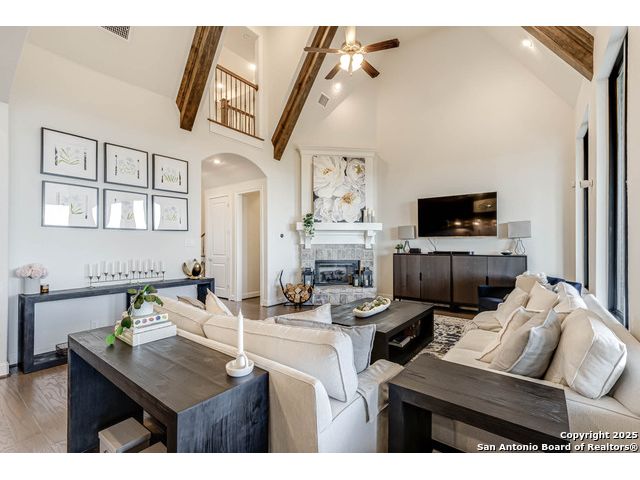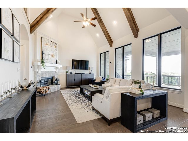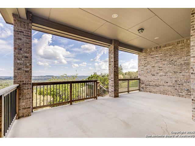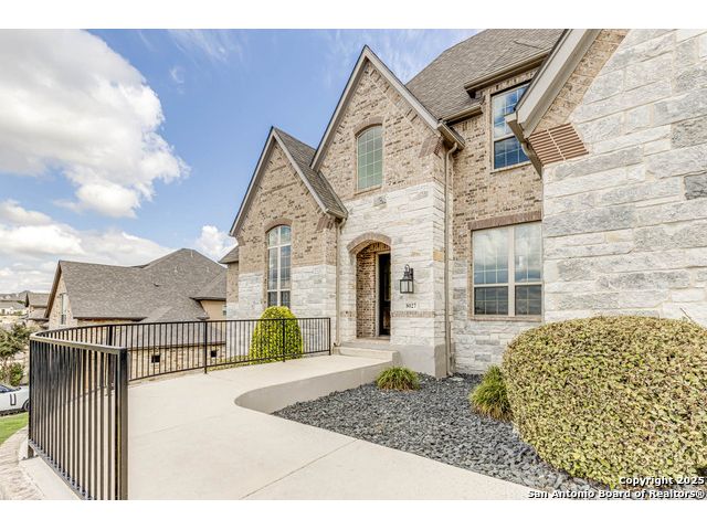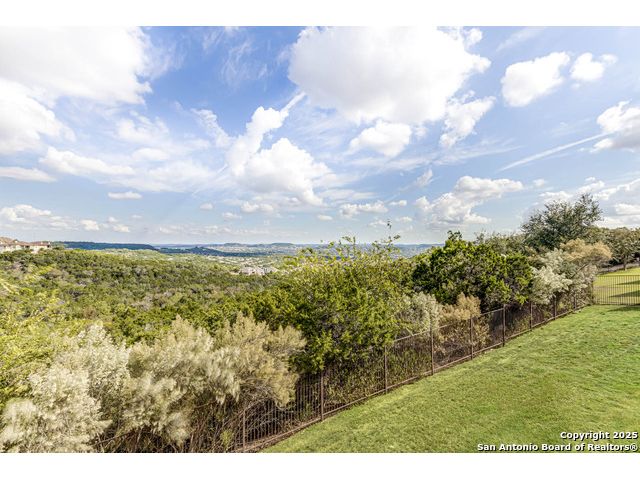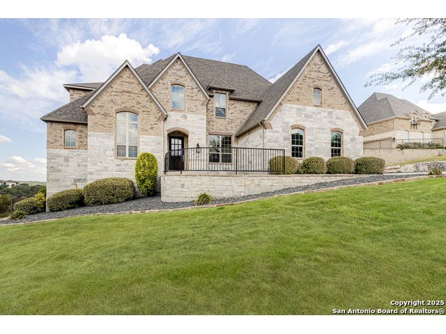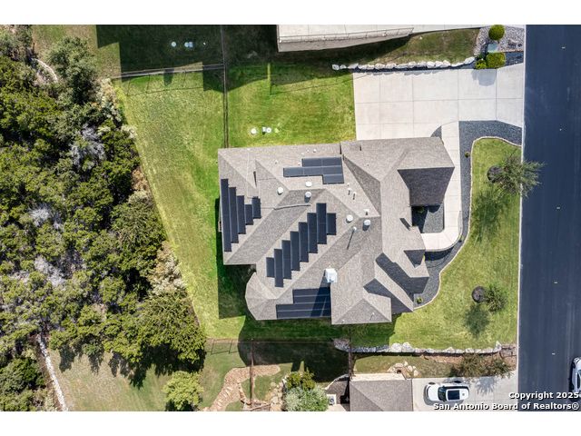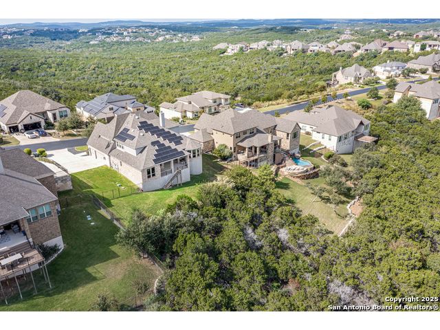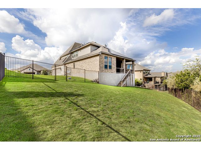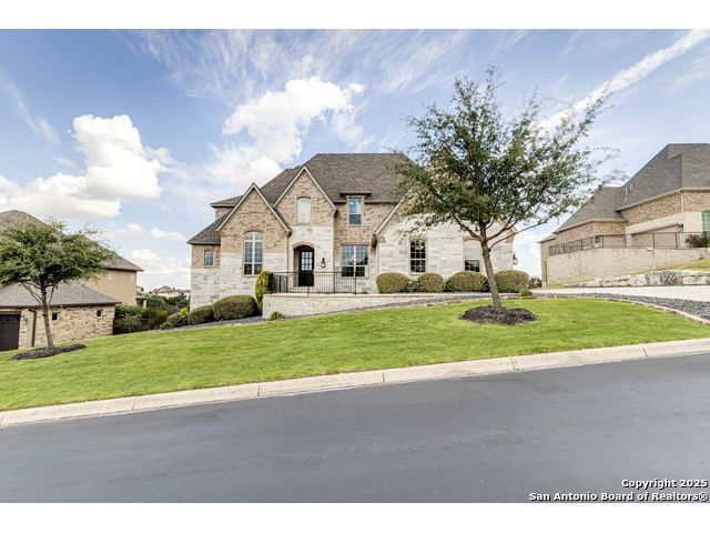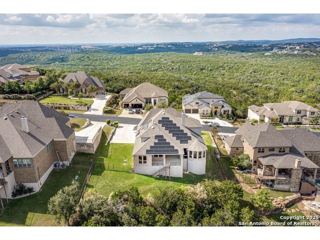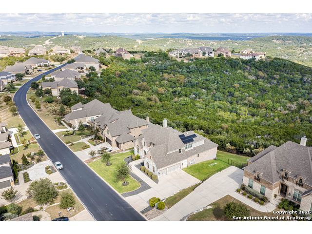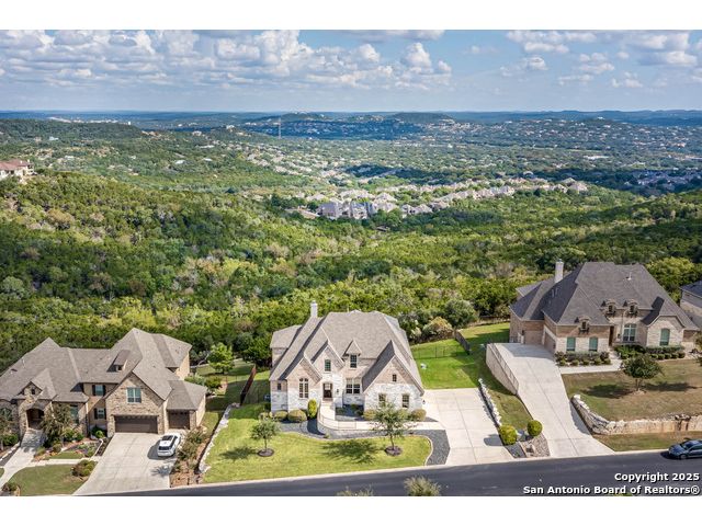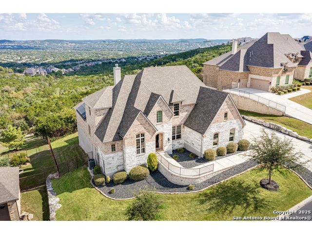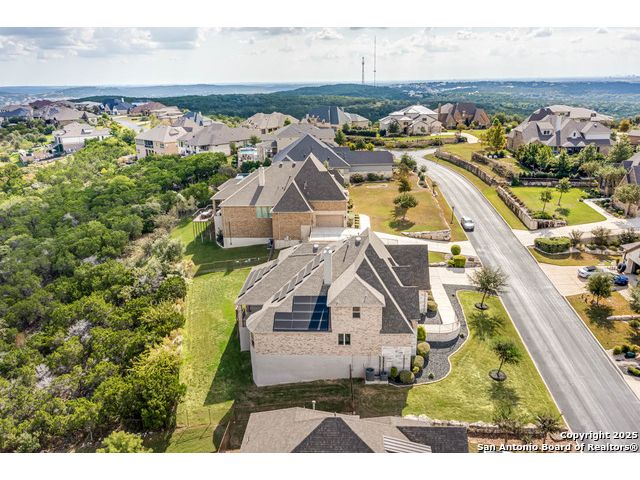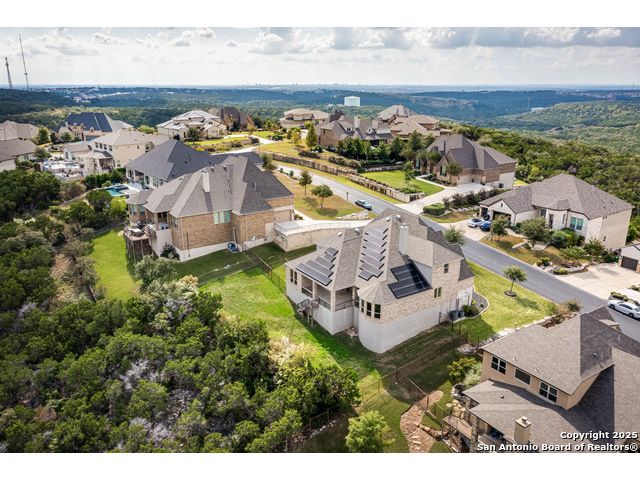 WOW! Hilltop Estate in The Overlook at Stonewall Estates with one of the best views in San Antonio! Beautiful home with 5 bedrooms plus office with wall of built-in shelves. Secondary bedroom and bathroom downstairs. Kitchen has quartz countertops and mother of pearl tile backsplash. Bosch dishwasher 2024. Family room has corner fireplace and high ceilings. Primary bedroom has sitting room with incredible views. Rechargeable battery operated blinds. Engineered hardwood floors. Built-ins. Gameroom and media room upstairs. Media equipment and media room couch can stay. Large back patio to enjoy the views. Oversized 3 car garage with epoxy floors, four power walls (if electricity goes out), and EV charger. Roof replaced 2019. Solar panels added approximately within last 3 years. Septic system pumped 2025. Back property line is beyond back fence. Gated community. Community pool, clubhouse and playground.