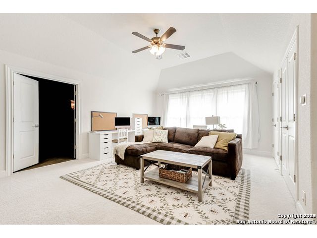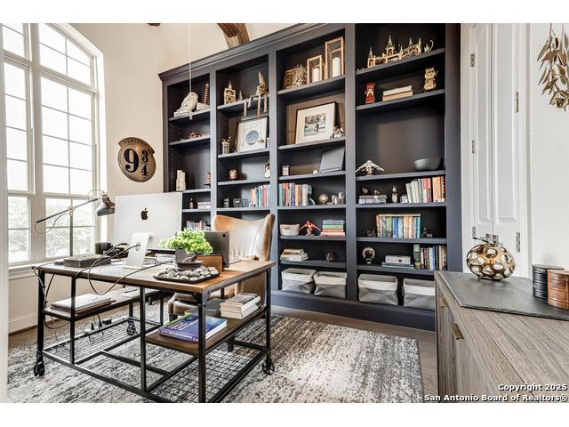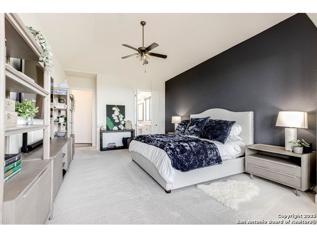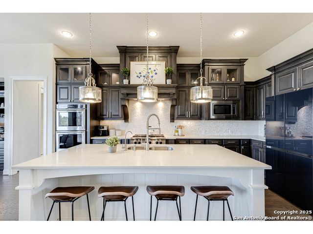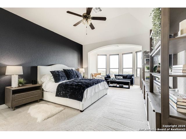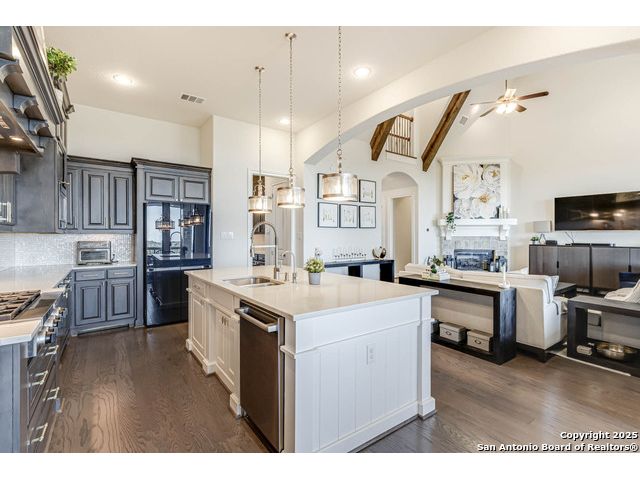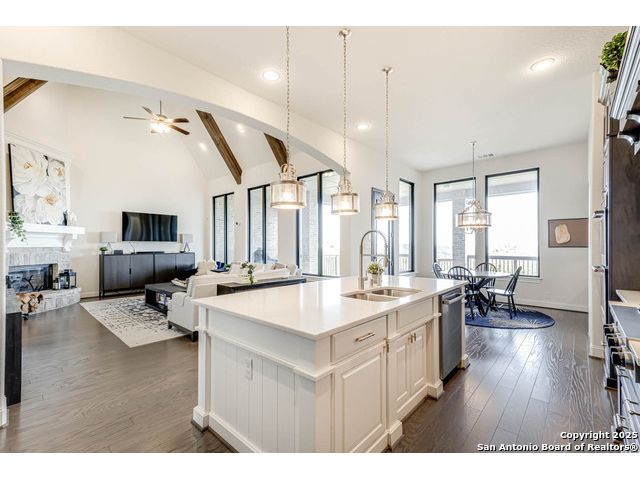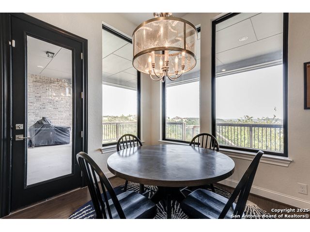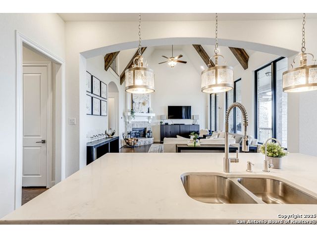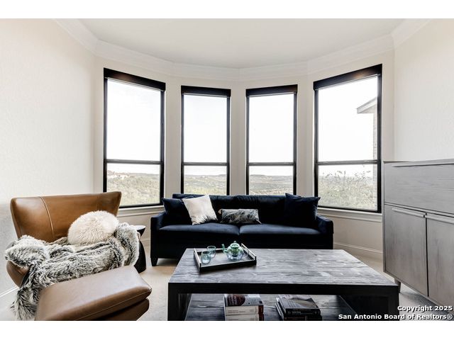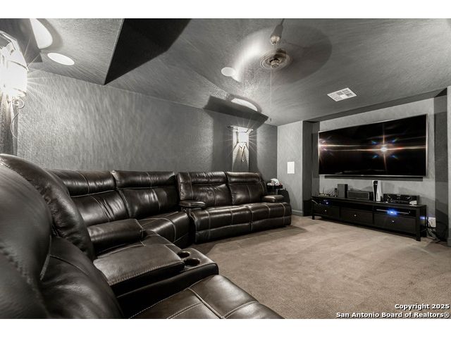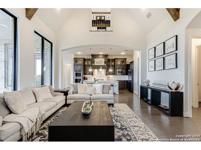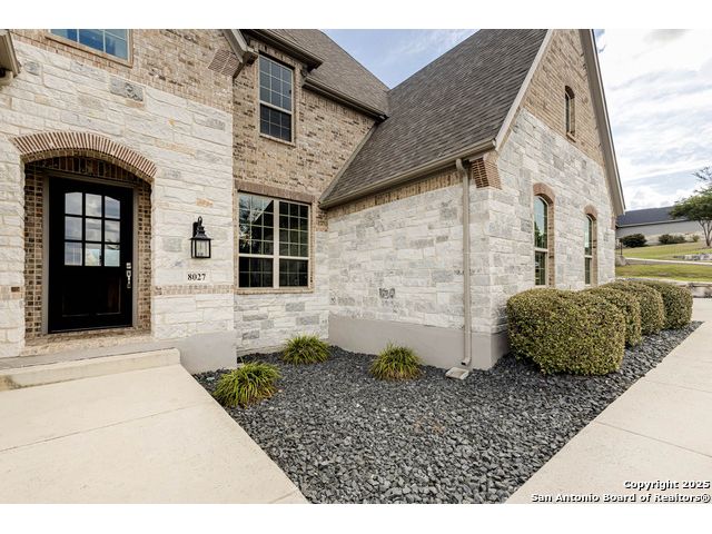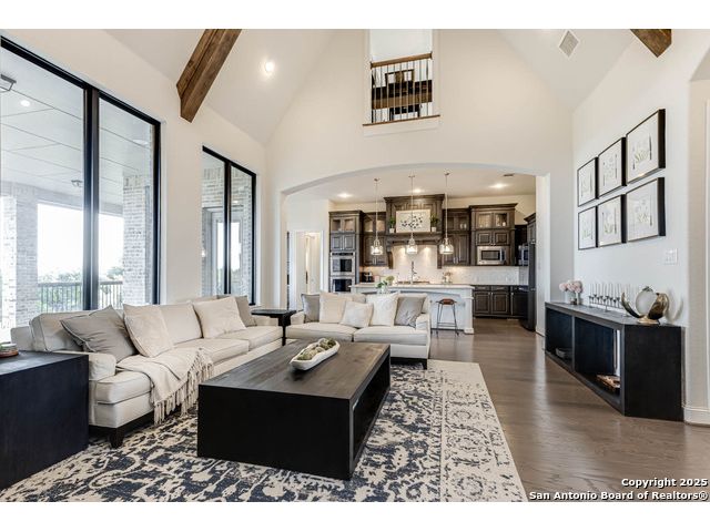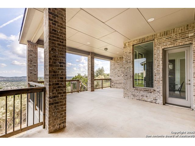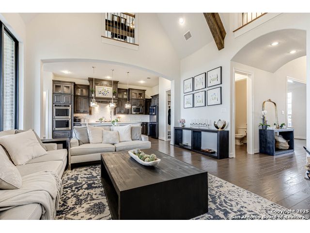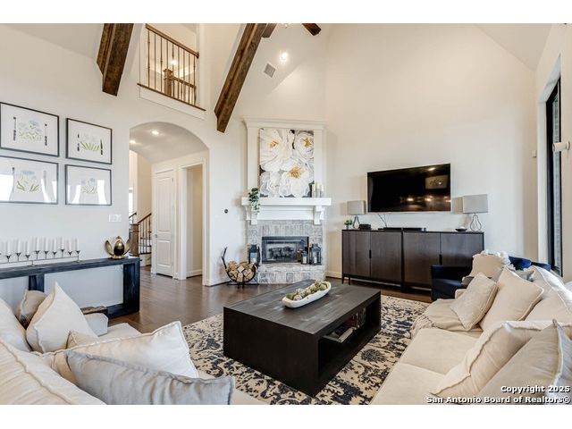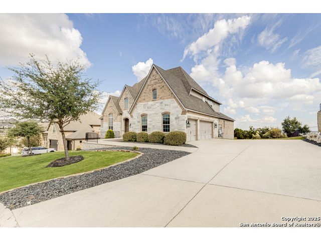 WOW! Hilltop Estate in The Overlook at Stonewall Estates with one of the best views in San Antonio! Beautiful home with 5 bedrooms plus office with wall of built-in shelves. Secondary bedroom and bathroom downstairs. Kitchen has quartz countertops and mother of pearl tile backsplash. Bosch dishwasher 2024. Family room has corner fireplace and high ceilings. Primary bedroom has sitting room with incredible views. Rechargeable battery operated blinds. Engineered hardwood floors. Built-ins. Gameroom and media room upstairs. Media equipment and media room couch can stay. Large back patio to enjoy the views. Oversized 3 car garage with epoxy floors, four power walls (if electricity goes out), and EV charger. Roof replaced 2019. Solar panels added approximately within last 3 years. Septic system pumped 2025. Back property line is beyond back fence. Gated community. Community pool, clubhouse and playground.