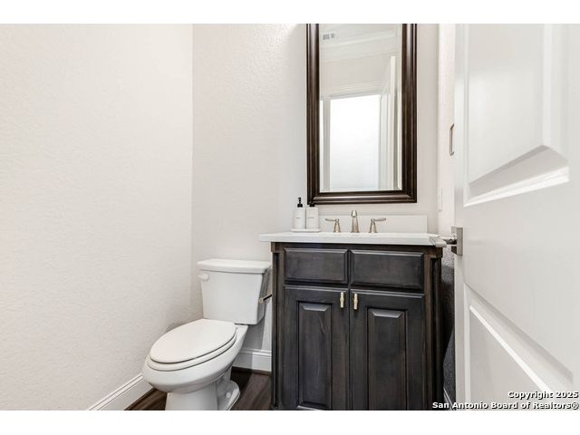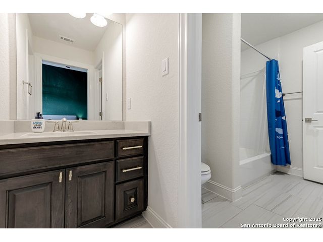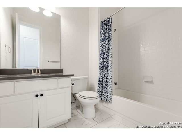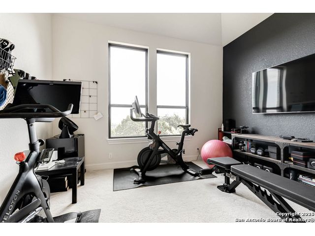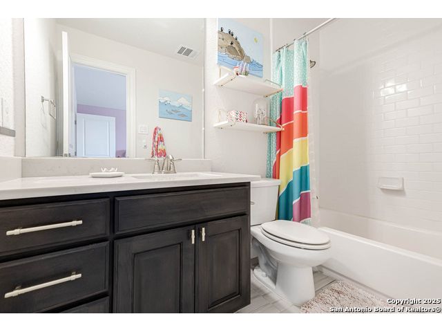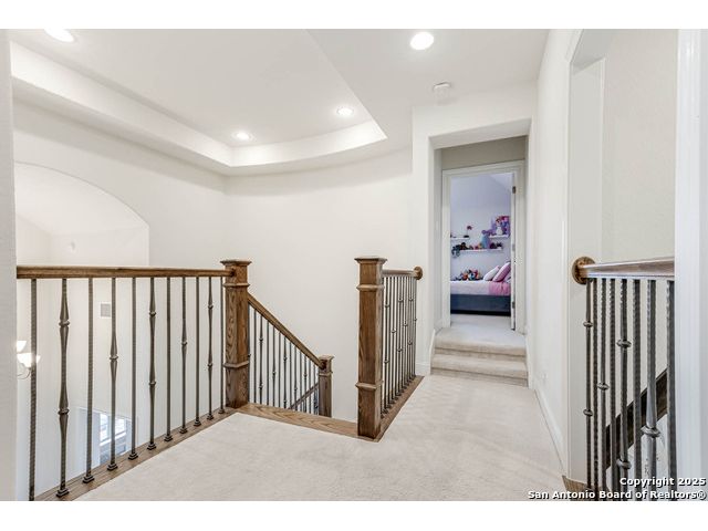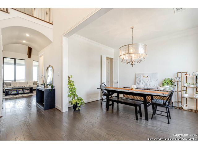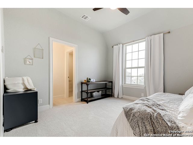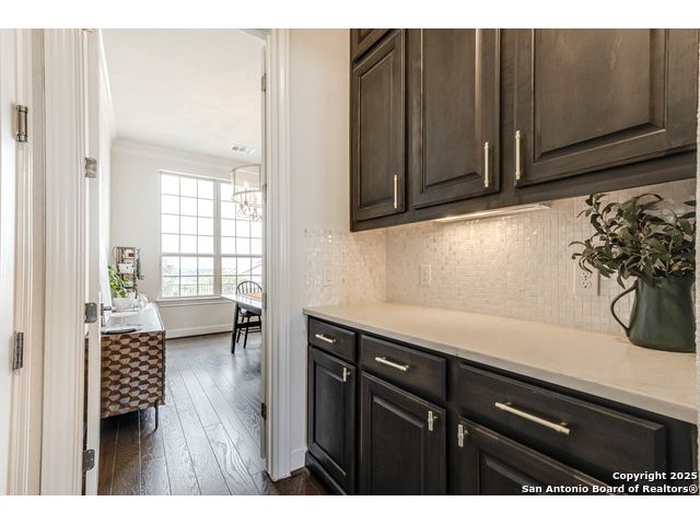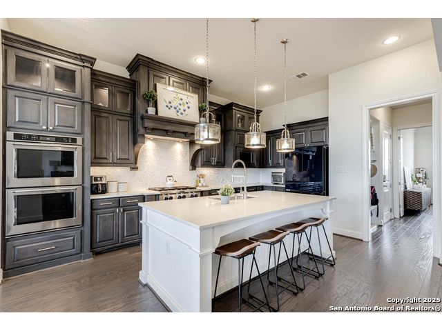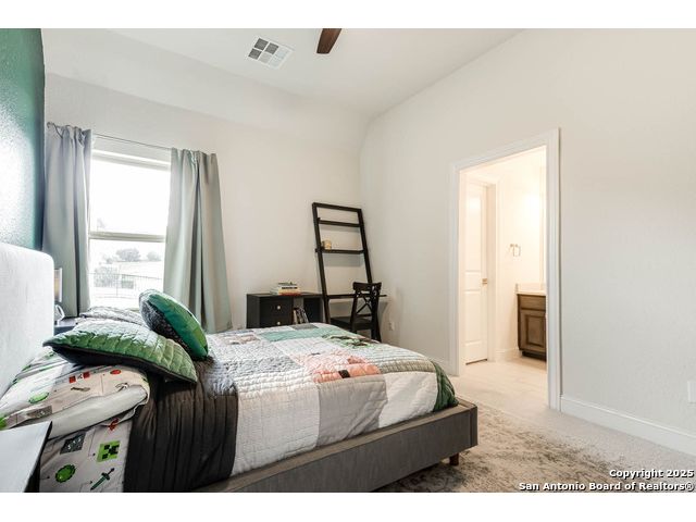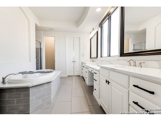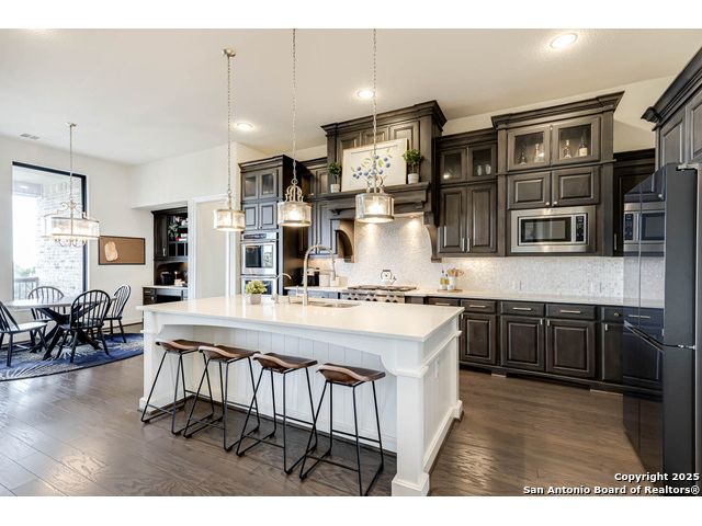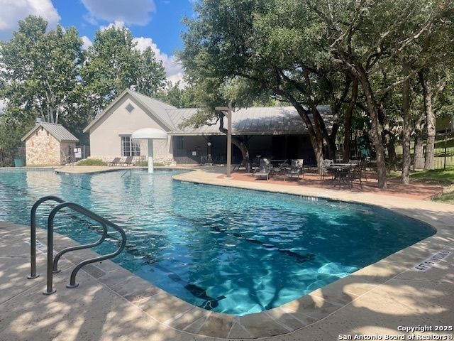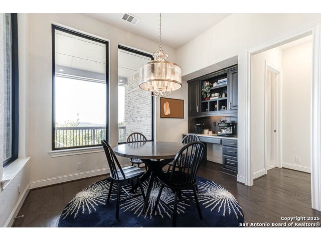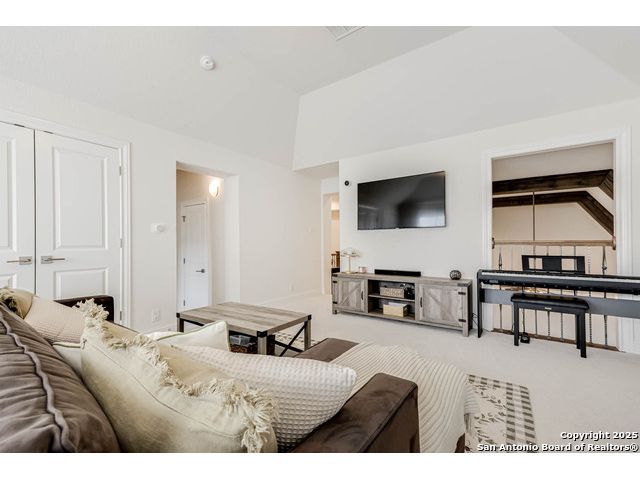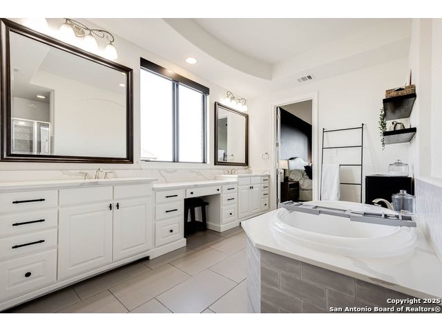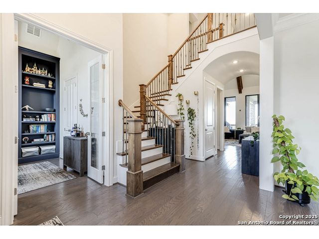 WOW! Hilltop Estate in The Overlook at Stonewall Estates with one of the best views in San Antonio! Beautiful home with 5 bedrooms plus office with wall of built-in shelves. Secondary bedroom and bathroom downstairs. Kitchen has quartz countertops and mother of pearl tile backsplash. Bosch dishwasher 2024. Family room has corner fireplace and high ceilings. Primary bedroom has sitting room with incredible views. Rechargeable battery operated blinds. Engineered hardwood floors. Built-ins. Gameroom and media room upstairs. Media equipment and media room couch can stay. Large back patio to enjoy the views. Oversized 3 car garage with epoxy floors, four power walls (if electricity goes out), and EV charger. Roof replaced 2019. Solar panels added approximately within last 3 years. Septic system pumped 2025. Back property line is beyond back fence. Gated community. Community pool, clubhouse and playground.