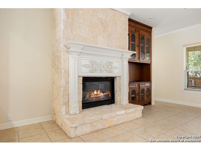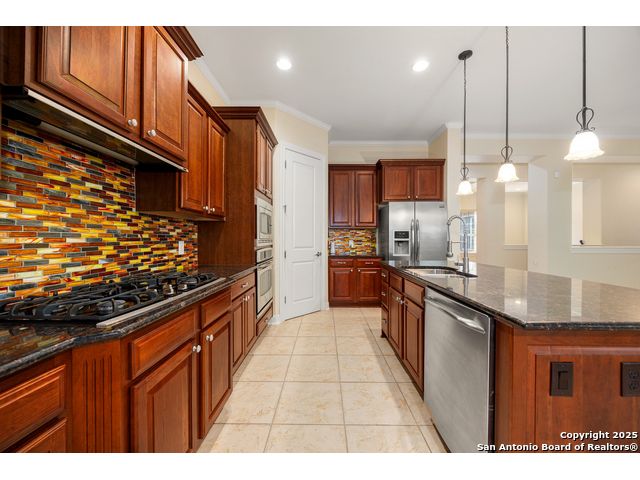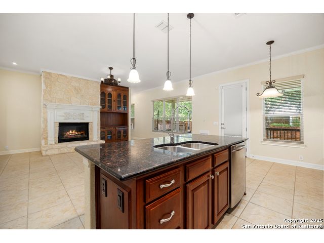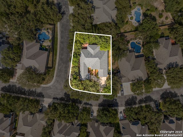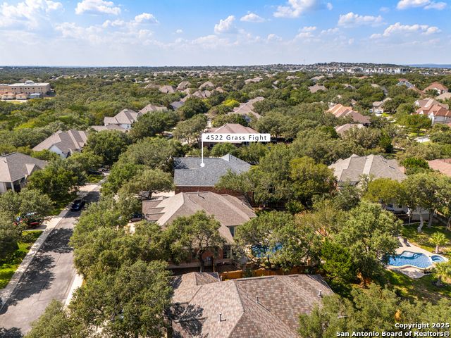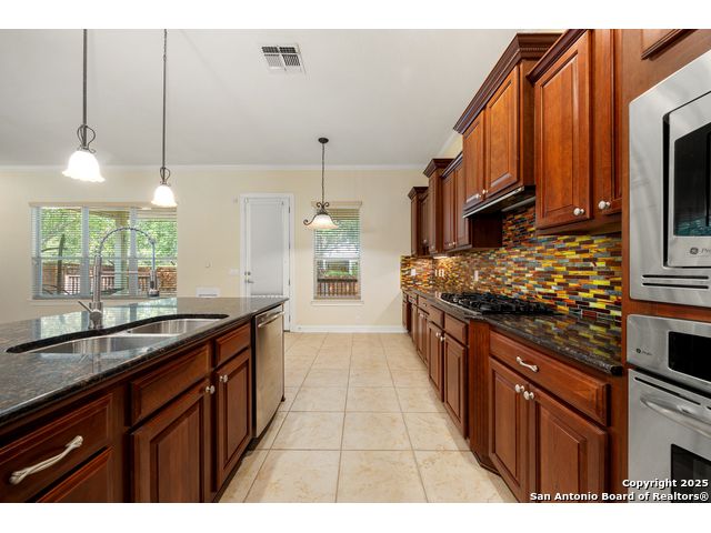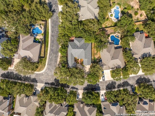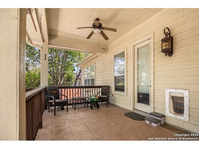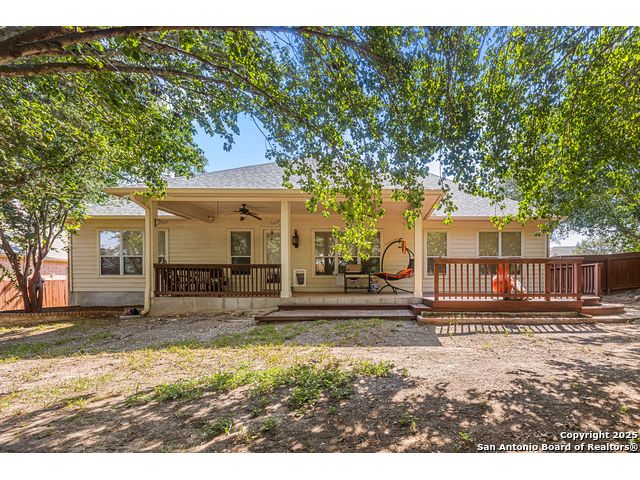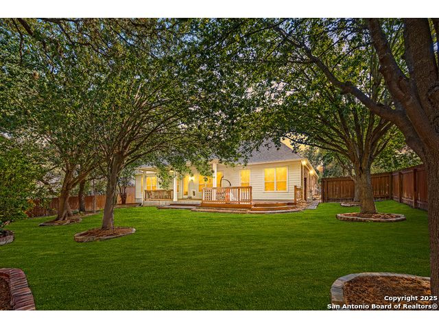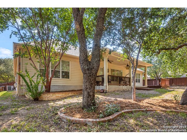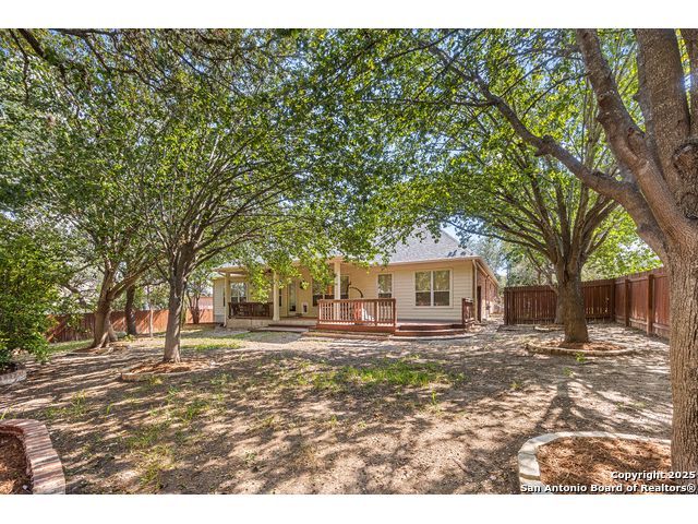 Located in the gated community of Alamo Ranch, this 4-bedroom, 3-bath home sits on a quiet cul-de-sac lot and offers a comfortable layout suited for everyday living. The open floor plan connects the living room and kitchen, creating an easy space for gathering. The living area features a fireplace and built-in cabinetry, while the kitchen includes granite countertops, 42" cabinets, stainless steel appliances, a gas cooktop, and a built-in desk. The primary suite offers generous natural light and high ceilings, giving the room a bright and open feel. It includes an ensuite bath with a soaking tub, walk-in shower, double vanity, and a large walk-in closet. Three additional bedrooms provide plenty of space for family or guests. The backyard features a covered patio, a deck, a spacious yard, and mature trees-ideal for enjoying outdoor time. A new roof was installed in May 2025 for added peace of mind, and recently added new 6" gutters with a heavy metal mesh . Community amenities include controlled access, a swimming pool, a park/playground, and more. The home is also close to shopping, John Hoffman Elementary, Dolph Briscoe Middle School, parks, and offers easy access to Loop 1604 and Alamo Parkway. Don't miss the opportunity to make this your next home, book your personal tour today!
