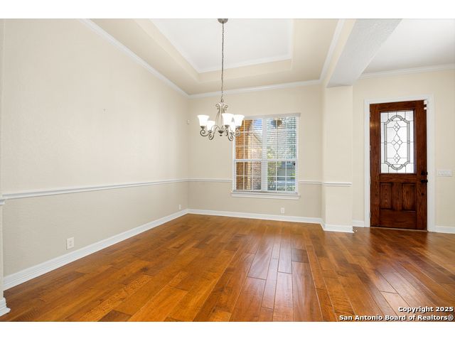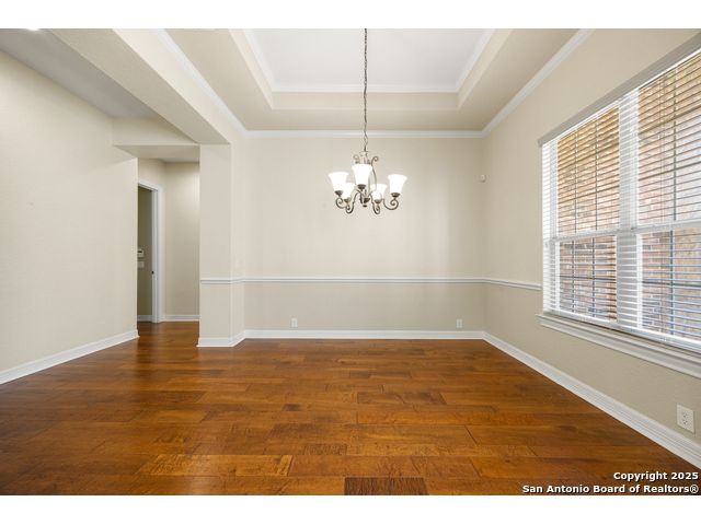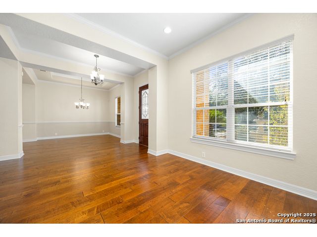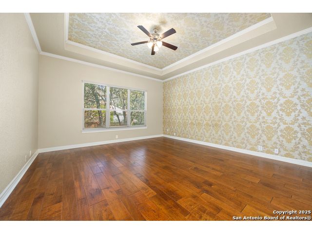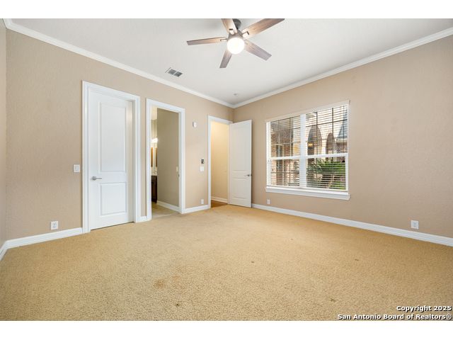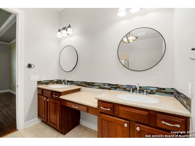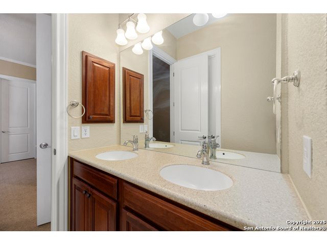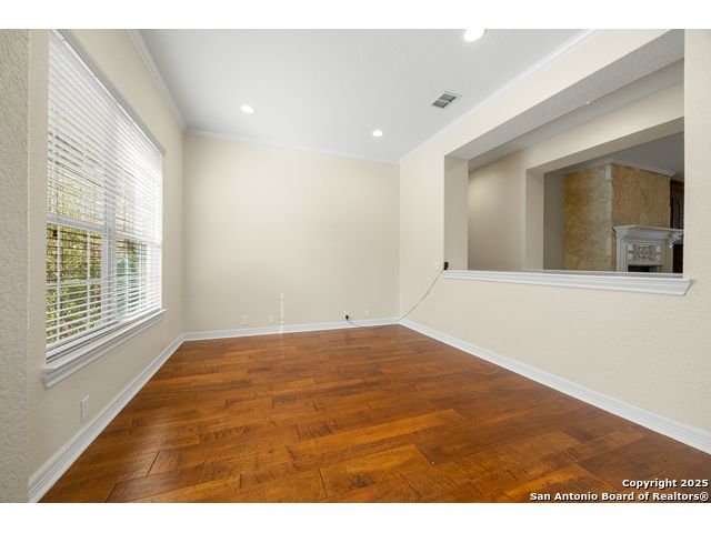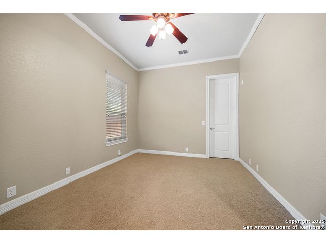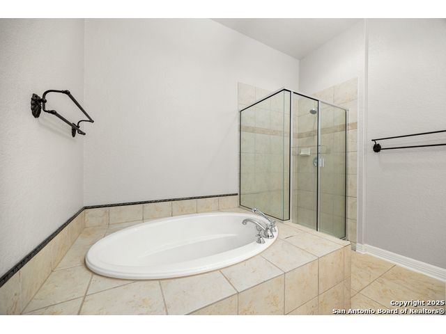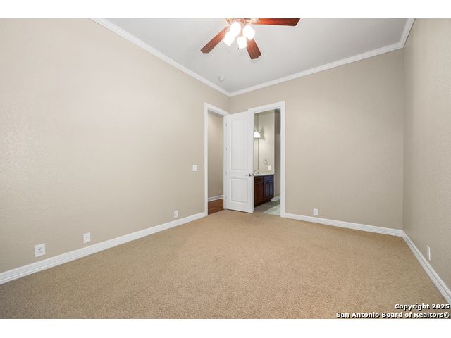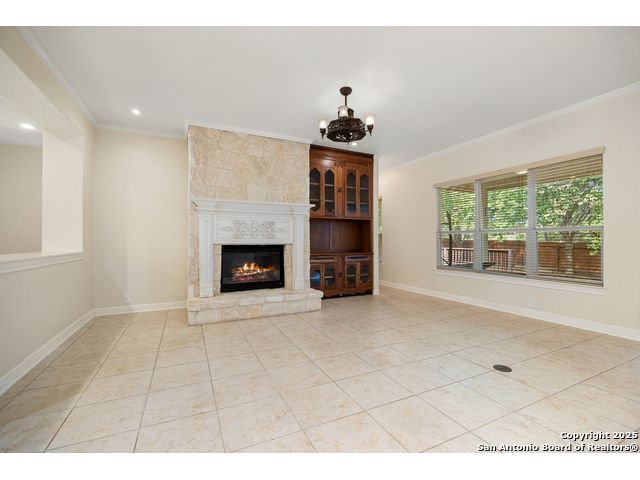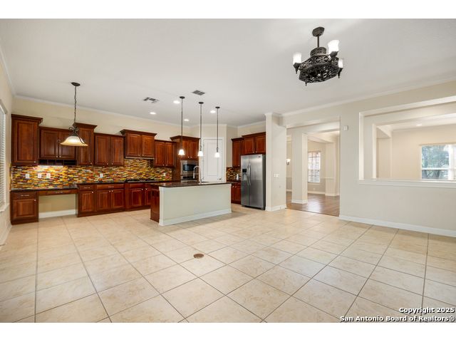 Located in the gated community of Alamo Ranch, this 4-bedroom, 3-bath home sits on a quiet cul-de-sac lot and offers a comfortable layout suited for everyday living. The open floor plan connects the living room and kitchen, creating an easy space for gathering. The living area features a fireplace and built-in cabinetry, while the kitchen includes granite countertops, 42" cabinets, stainless steel appliances, a gas cooktop, and a built-in desk. The primary suite offers generous natural light and high ceilings, giving the room a bright and open feel. It includes an ensuite bath with a soaking tub, walk-in shower, double vanity, and a large walk-in closet. Three additional bedrooms provide plenty of space for family or guests. The backyard features a covered patio, a deck, a spacious yard, and mature trees-ideal for enjoying outdoor time. A new roof was installed in May 2025 for added peace of mind, and recently added new 6" gutters with a heavy metal mesh . Community amenities include controlled access, a swimming pool, a park/playground, and more. The home is also close to shopping, John Hoffman Elementary, Dolph Briscoe Middle School, parks, and offers easy access to Loop 1604 and Alamo Parkway. Don't miss the opportunity to make this your next home, book your personal tour today!