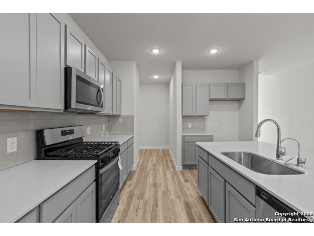 Step into modern design with the Riley floor plan! At the heart of the home is a spacious open-concept great room, which flows into a dining area and an impressive kitchen with a center island, a walk-in pantry, and access to a convenient mud room. The primary suite is also located on the main level, boasting a walk-in closet and a primary bath with dual vanities and a walk-in shower. There are three secondary bedrooms upstairs, each with a walk-in closet. A full bath, storage space, and a large loft round out the Riley. Additional home highlights and upgrades: 36"" white kitchen cabinets, quartz countertops and backsplash Luxury wood-look vinyl plank flooring in common areas Stainless-steel appliance package with gas range oven Recessed lighting throughout home Cultured marble countertops and modern rectangular sinks in bathrooms 5 bedrooms Landscape package with full sprinkler system Garage door opener with two remotes Covered patio Exceptional included features, such as our Century Home Connect smart home package and more!