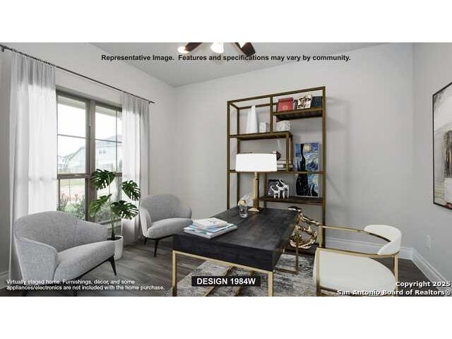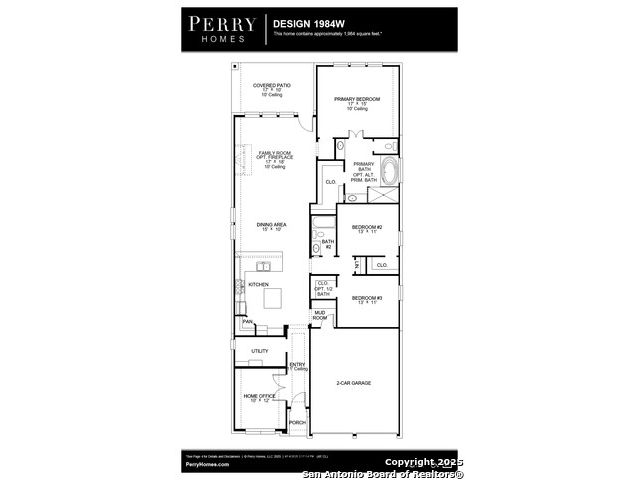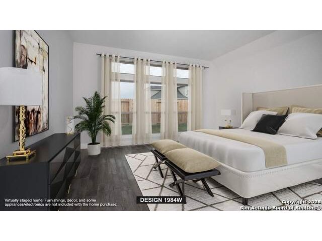 A home office with French doors and an 11-foot ceiling welcomes you at the entry. The open kitchen features a center island, 5-burner cooktop and corner walk-in pantry, flowing seamlessly into the dining area and spacious family room with a wall of windows. The private primary suite includes a bedroom featuring a wall of windows and a bath including dual vanities, a corner garden tub, separate glass-enclosed shower, and a large walk-in closet. Abundant closet space and natural light throughout the home. Outdoor living is complete with a covered backyard patio, while a convenient mud room connects to the two-car garage.
