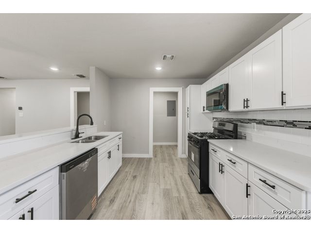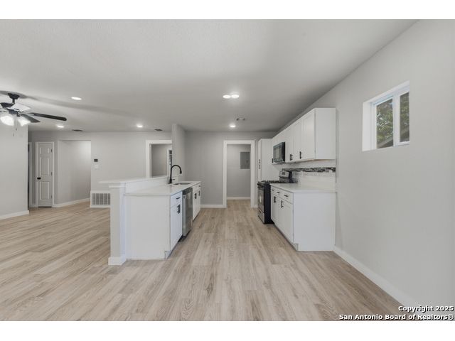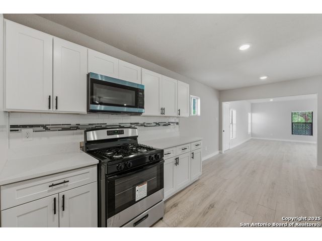 Stunning Fully Remodeled Home with Unique Charm! Welcome to this beautifully renovated 5-bedroom home that truly stands out from the rest! From the moment you arrive, the exceptional curb appeal, lush landscaping, and custom metal-covered driveway make a bold and memorable first impression. Step inside to discover a bright and open layout designed with entertaining in mind. The brand-new kitchen is the heart of the home, featuring sleek new cabinets, modern appliances, gas stove, fresh flooring, and crisp paint throughout-offering the feel of a new build in a well-established neighborhood. Each of the five spacious bedrooms provides comfort and flexibility for any lifestyle. The master suite includes a versatile little nook area, perfect for a home office, workout space, reading area, or mudroom. Both bathrooms have been completely updated with contemporary finishes and thoughtful design. Enjoy easy access with multiple entry points and an extra-long driveway offering ample parking for family and guests. The backyard is a blank canvas for your dream outdoor space-ideal for a fire pit, swing set, trampoline, or your own garden retreat. A covered patio and a handy storage building complete the outdoor amenities. Located just minutes from Loop 410, I-35, shopping, dining, and Lackland AFB, this centrally located gem offers both convenience and comfort. Don't miss your chance to own this one-of-a-kind, move-in-ready home. Schedule your tour today-you'll fall in love the moment you walk in!