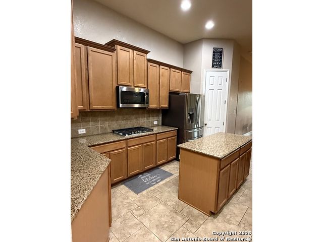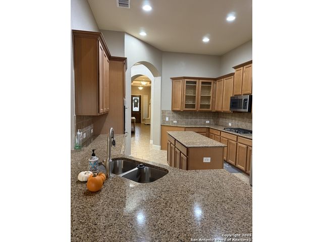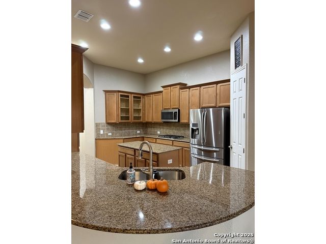Seller will contribute $10,000 towards buyers closings costs with an acceptable offer. This well maintained 4/2.5/2. 3380 sq ft home in the prestigious and gated nieghborhood of Cibolo Canyons is located on a greenbelt with no neighbors on the rear and one side of the property offering nature and serenity. This home is basically a 1-story home with only the gameroom/media room that is located upstairs. The home offers a spilt bedroom plan with the primary bedroom with multiple closets is located at the rear of the home with a study that could also be used as a nursery. Primary bath offers double vanities, separate large walk-in shower and Roman garden tub.The Island kitchen is more than ample with lots of granite countertop space, 42"cabinets,dbl ovens,gas cooktop, and ceramic tile backsplash. Kitchen opens to breakfast area and open living area that has a corner rock fireplace with gas logs. The large windows from the living area to the breakfast area allow plenty of light and beautiful views to enjoy. Formal dinning room adds a elegant touch with ceramic wood like flooring. Good size Utlility room and secondary bedrooms. Large rear deck offers beautiful views and serenity. High ceilings through out the house. As per seller, they have 533 sq ft of Impervious cover that is on record at the county.