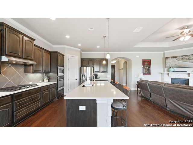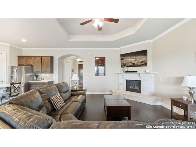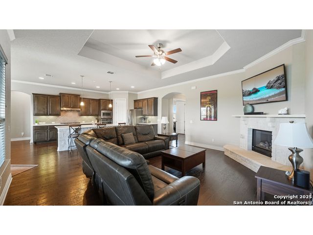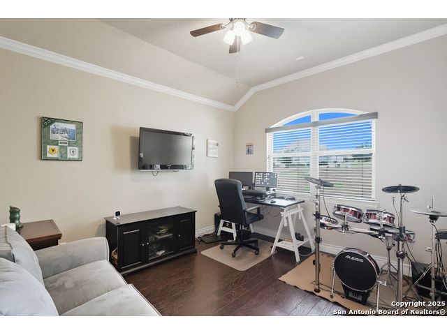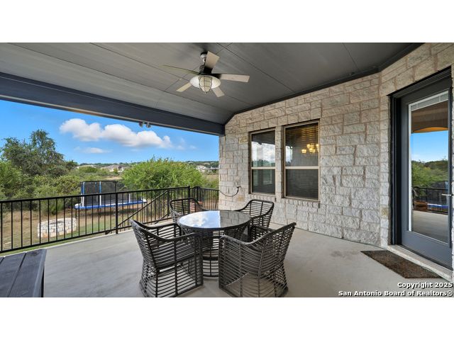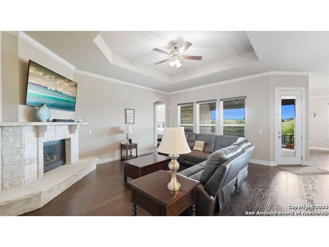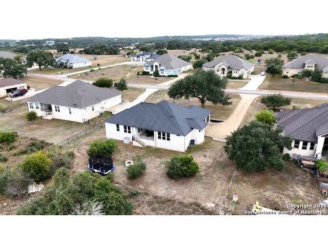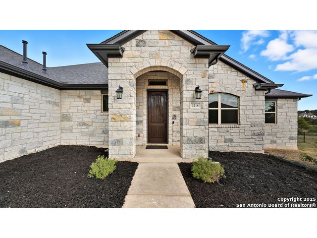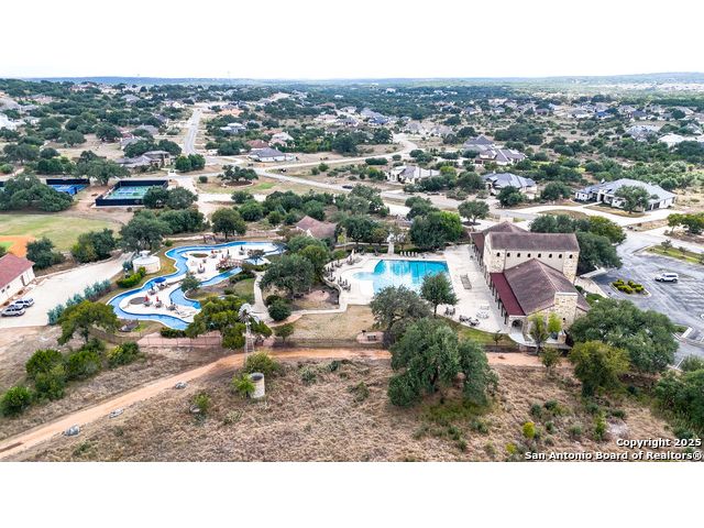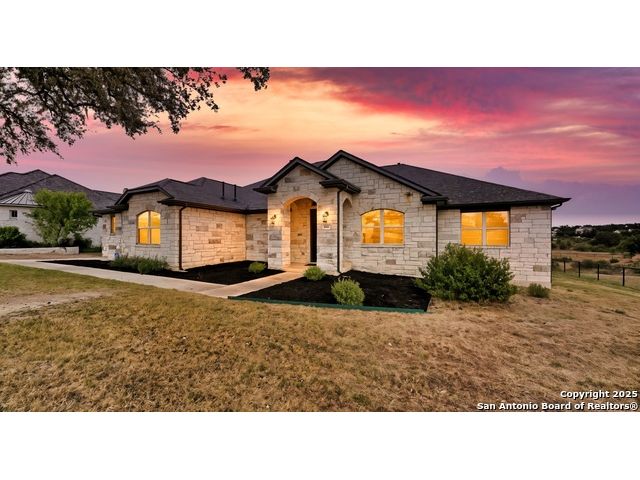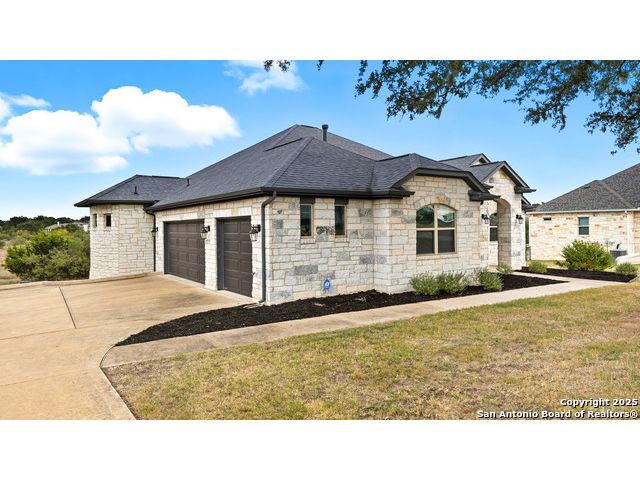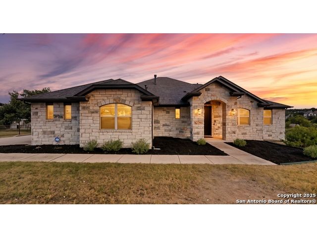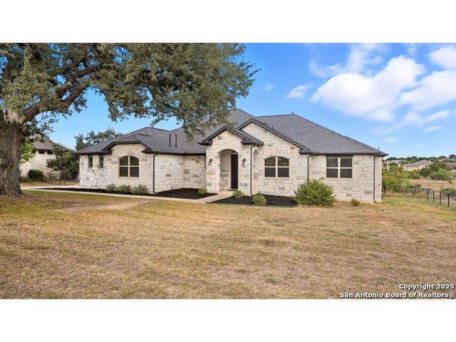 Welcome to hill country living on 1.13 acres in the highly sought-after Vintage Oaks community. Tucked away on a quiet cul-de-sac and backed by a greenbelt, this home offers privacy and space. An open-concept layout connects the main living areas, where a stone fireplace and crown molding create a warm, inviting feel. Wood flooring runs throughout most of the home, with the exception of two bedrooms, the bathrooms, and the laundry area, adding both style and continuity to the space. The kitchen features a gas stove, quartz countertops, tiled backsplash, plenty of cabinet space, and a large island accented with stone on one side; ideal for both everyday use and entertaining. The primary suite is tucked away on its own side of the home for added privacy. The bathroom includes separate his-and-hers closets, dual sinks, a large walk-in shower with a bench, a separate garden tub, and built-in shelving for extra storage. The two secondary bedrooms are connected by a Jack-and-Jill bathroom, offering convenience and functionality without sacrificing space. A dedicated office adds flexibility for working from home, school, or hobbies. A three-car garage and four-side rock exterior provide both practicality and curb appeal. The home also includes a water softener and two water heaters; one recently installed and the other being replaced. Outdoors, a spacious yard and outdoor fireplace create the perfect setting for relaxing or gathering with guests. Living in Vintage Oaks means access to resort-style amenities, including a Olympic size pool with a lazy river, clubhouse, fitness center, sports fields, walking trails, and more. Acreage, privacy, and a location that continues to hold its value. This property offers the lifestyle buyers are seeking in the Texas Hill Country.