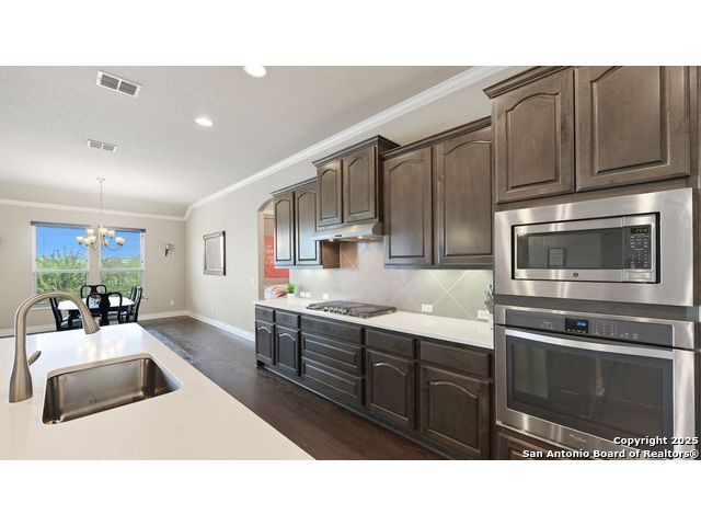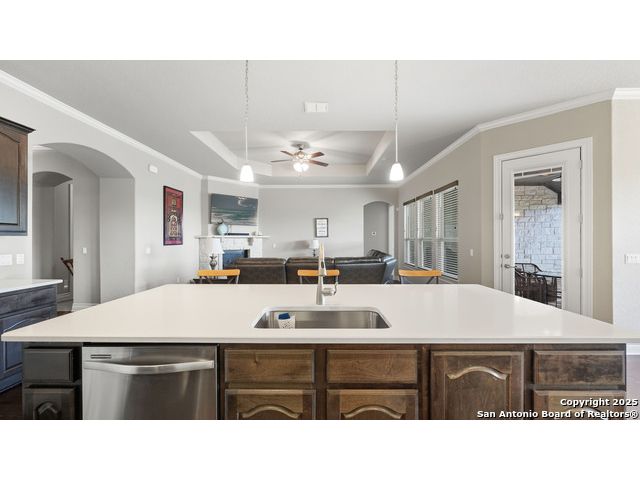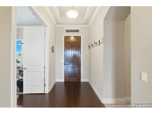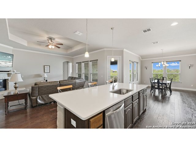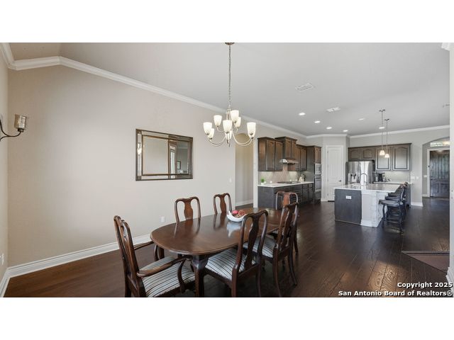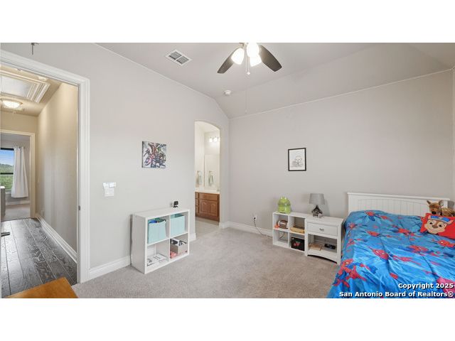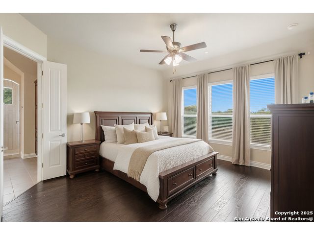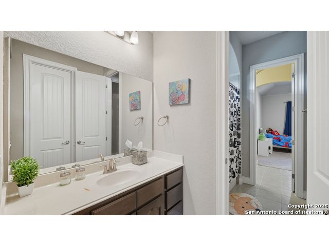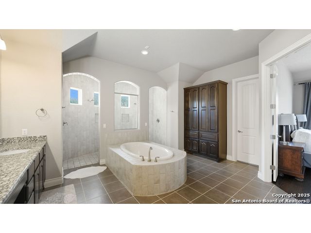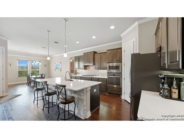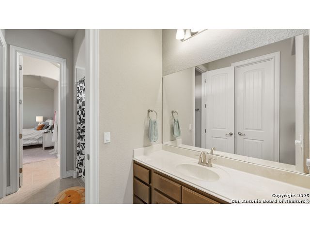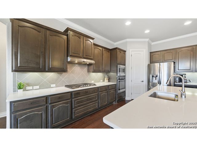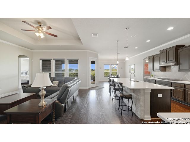 Welcome to hill country living on 1.13 acres in the highly sought-after Vintage Oaks community. Tucked away on a quiet cul-de-sac and backed by a greenbelt, this home offers privacy and space. An open-concept layout connects the main living areas, where a stone fireplace and crown molding create a warm, inviting feel. Wood flooring runs throughout most of the home, with the exception of two bedrooms, the bathrooms, and the laundry area, adding both style and continuity to the space. The kitchen features a gas stove, quartz countertops, tiled backsplash, plenty of cabinet space, and a large island accented with stone on one side; ideal for both everyday use and entertaining. The primary suite is tucked away on its own side of the home for added privacy. The bathroom includes separate his-and-hers closets, dual sinks, a large walk-in shower with a bench, a separate garden tub, and built-in shelving for extra storage. The two secondary bedrooms are connected by a Jack-and-Jill bathroom, offering convenience and functionality without sacrificing space. A dedicated office adds flexibility for working from home, school, or hobbies. A three-car garage and four-side rock exterior provide both practicality and curb appeal. The home also includes a water softener and two water heaters; one recently installed and the other being replaced. Outdoors, a spacious yard and outdoor fireplace create the perfect setting for relaxing or gathering with guests. Living in Vintage Oaks means access to resort-style amenities, including a Olympic size pool with a lazy river, clubhouse, fitness center, sports fields, walking trails, and more. Acreage, privacy, and a location that continues to hold its value. This property offers the lifestyle buyers are seeking in the Texas Hill Country.