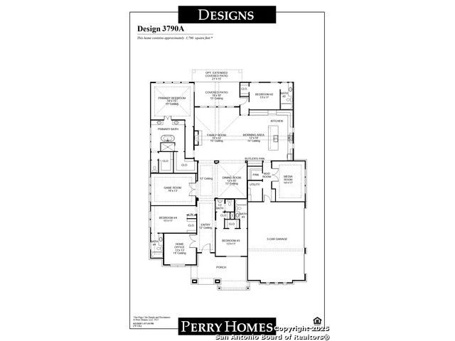 Featured on a half acre homesite. A beautiful covered front porch opens into an entryway with extended ceilings. Hardwood floors throughout living areas. French doors lead into the quiet home office located off the entry. Down the hall is the game room which is adorned by a wall of windows. Past the dining room you enter into the grand family room featuring a sliding glass door, a warming cast stone fireplace, and access to the extended covered backyard patio. The morning area connects the living space to the kitchen. An island with built-in seating, 5-burner gas cooktop, ample counter space, a butler's pantry, and walk-in pantry complete the kitchen. The primary suite has a private hallway and boasts a wall of windows, dual vanities, a freestanding tub, a glass enclosed shower, and two walk-in closets. The three secondary bedrooms come equipped with walk-in closets and private bathrooms. French doors enclose the media room off of the kitchen. The utility room and mud room are located off of the three-car garage.