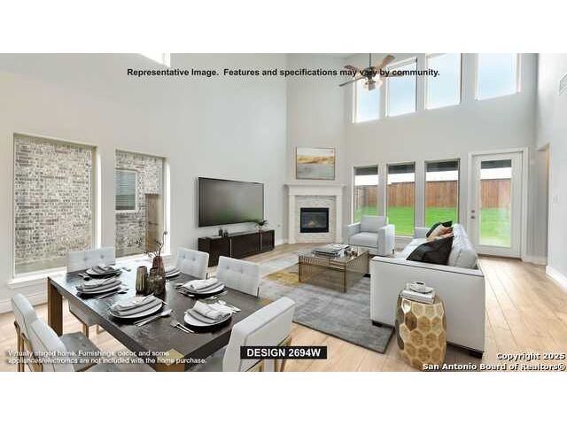 Home office with French doors and 11-foot ceiling set at two-story entry. Open kitchen features deep walk-in pantry, 5-burner gas cooktop and generous island with built-in seating space. Dining area opens to two-story family room with a wood mantel fireplace and wall of windows. Primary suite includes bedroom with 10-foot tray ceiling. Double doors lead to primary bath with dual vanity, garden tub, separate glass-enclosed shower and large walk-in closet. An additional bedroom is downstairs. Secondary bedrooms and game room with 10-foot tray ceiling are upstairs. Covered backyard patio. Mud room off two-car garage.