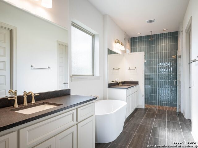 Situated on a private greenbelt lot, this newly constructed Sitterle Homes masterpiece was crafted for luxurious and effortless single-level living, offering a seamless open-concept design with no interior steps and soaring 12' ceilings that fill each space with natural light and a sense of openness. The gourmet kitchen is a true showpiece for both the avid cook and entertainer, showcasing a KitchenAid Professional Entertainer Package with a 36" six-burner gas cooktop, built-in oven and microwave, expansive island, and stunning Michael Edwards custom cabinetry. An oversized wet bar adds sophistication and convenience, making entertaining seamless. The kitchen flows into the spacious family room, anchored by a striking floor-to-ceiling stone fireplace and sliding glass doors that open to an expansive covered patio-the perfect backdrop for indoor-outdoor living overlooking the peaceful greenbelt. The primary suite is a private retreat, highlighted by a bay window, spa-inspired bath with a freestanding soaking tub, walk-in rain head shower with designer glass tile, and an oversized walk-in closet. Each secondary bedroom features its own private en-suite bath, offering comfort and privacy for family or guests. Additional highlights include a dedicated office, game room, laundry room with built-in cabinetry and space for an additional refrigerator, and an oversized three-car garage with epoxy floors. Ideally located near the Belle Oaks amenity center, residents enjoy access to resort-style amenities including a pool, clubhouse, playground, tennis and pickleball courts, and a basketball court.