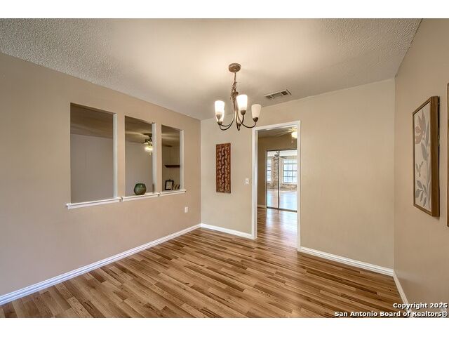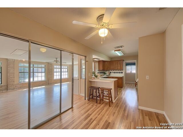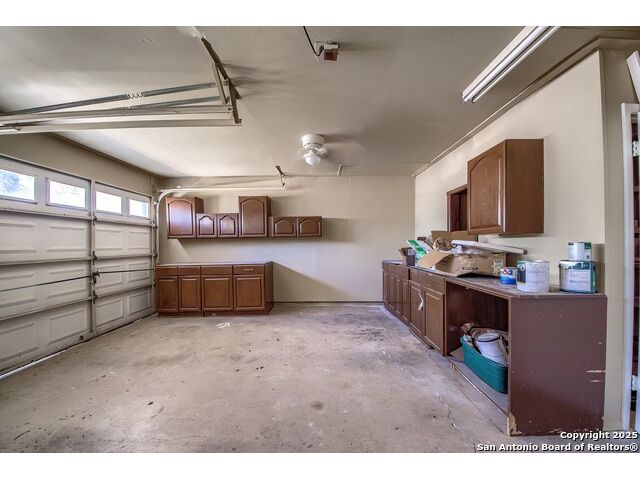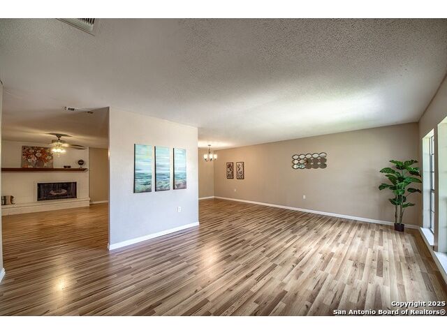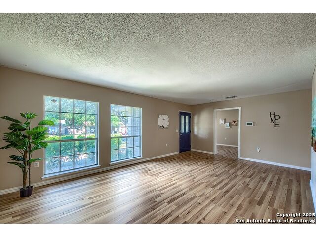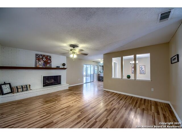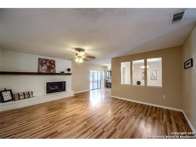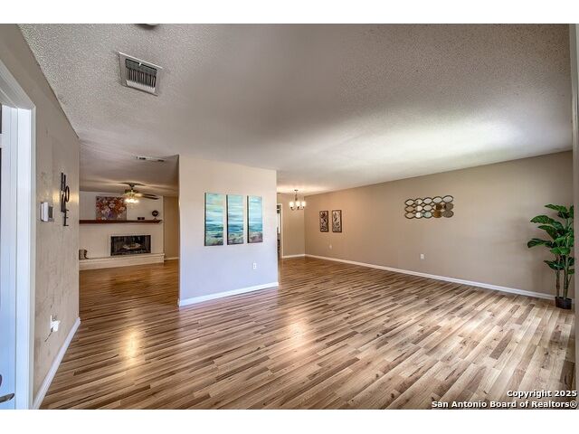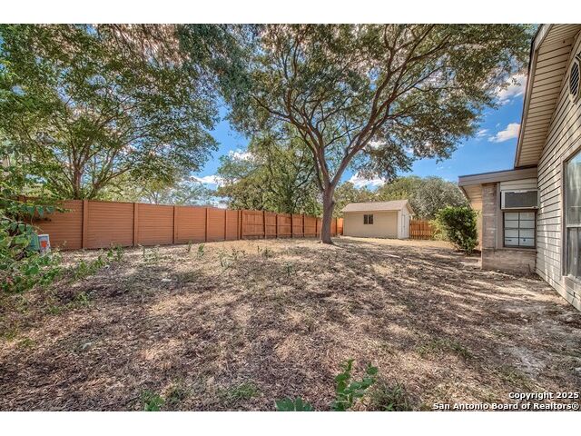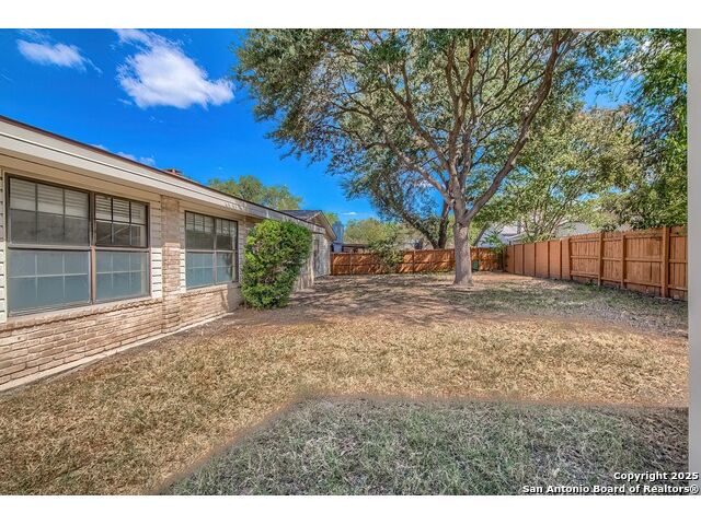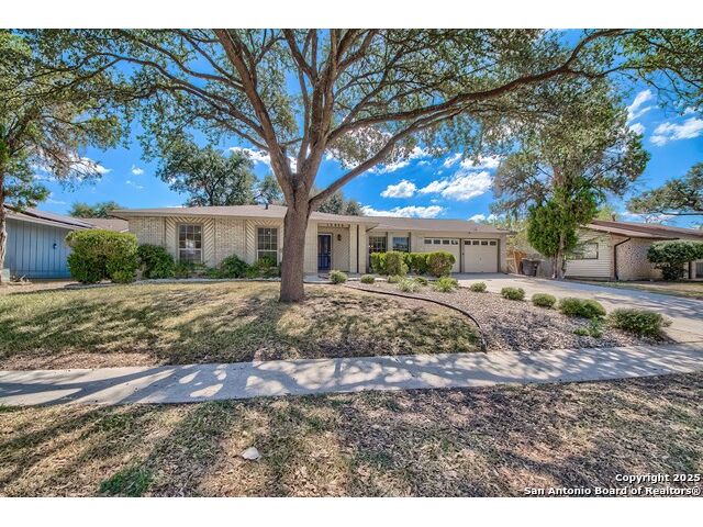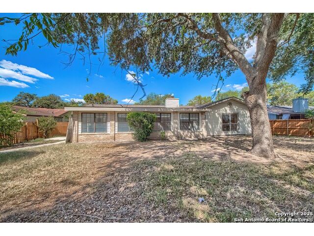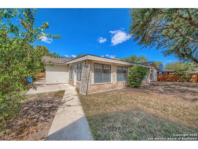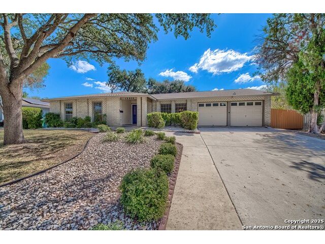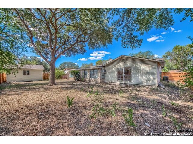 NEVER WANT FOR SPACE IN THIS AFFORDABLE SINGLE STORY BRICK RANCHER WITH NEW ROOF, FRESH PAINT, NEW LUXURY VINYL FLOORING AND A WORKSHOP! Well loved for decades by the same owners who raised their children here, this spacious single story is ready with open arms to welcome you in and turn all your possibilities into realities. Wind through the wide, tree-lined streets leading through Valley Forge and glide up to this charmer beneath mature trees and accented by smart xeriscaping and lawn. Open living is just a start to this traditional home modern comforts that offers more than you thought you could ask for at this price including a huge game room/sunroom and workshop on a slab, fully outfitted for all your projects! Step past the welcoming front porch and into the foyer to find a formal living room adjacent to a formal dining that is separate but still open to the family room and kitchen. A centerpiece, wood burning, brick fireplace with long hearth sets a cozy atmosphere in the family room that adjoins the breakfast nook. Offering original real wood cabinetry and plenty of countertop to work with, the kitchen is ready to go now or renovate to add your personal choices for upgrades. The adjacent laundry room includes cabinetry and shelving and leads into the two-car attached garage with pull-down attic access, storage cabinets and workbench. The primary suite is quite the production with one large room that hosts the adjacent ensuite bath, accessible with spacious walk-in shower with grab bars and no lip. But that's not all! Another doorway leads into the real retreat with beamed vaulted ceiling, two closets and tons of space for a third living area. Or, vice versa, use the first space as an office, exercise room or hobby room and this private enclave as your palatial bedroom. The secondary bedrooms share a guest bath in the hallway leading back to the rest of the house. Just off the family room is a giant air conditioned space to use as you will -- imagine entertaining with the outfitted bar with long counter top, wine nooks and glass shelves or work a business from this room as the owners did both over the years. Outside find a concrete walkway leading to the 18X13 workshop, on a slab, with electricity and work tables. Just add tools and get busy or turn into an office with exterior access if that is what you need! The owner added a concrete walkway from the gate to the shop for ease of use. The nice sized, level yard shaded by mature trees offers enough space for outdoor activities including gardening and playscape. Or, add a swimming pool and make this a real all-encompassing live, relax and work place you'd never have to leave! Located in an ultra-convenient, well established neighborhood -- right off I-35 at O'Connor near 1604 in NE San Antonio -- an easy commute to military bases to include RAFB, SAMMC and Fort Sam as well as all the cool things to do downtown at the Riverwalk. Shopping and restaurants are just minutes away as are the NEISD schools the home is zoned to attend. If you work from home and/or run a business from home, or if multi-generational living is what you need, this property checks every box. There is no HOA to worry about, just city regulations, so feel free to have chickens and other options usually governed by HOAs. The new architectural shingle roof with 30 year shingles will help keep your property insurance costs lower than other homes. Don't wait for another opportunity like this to come along, run and see this one and make it your own.