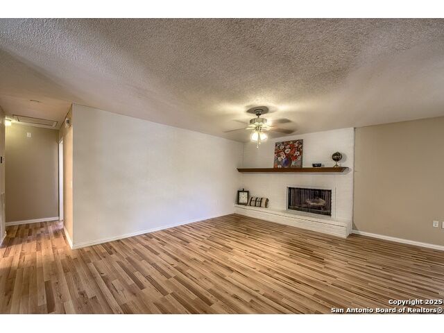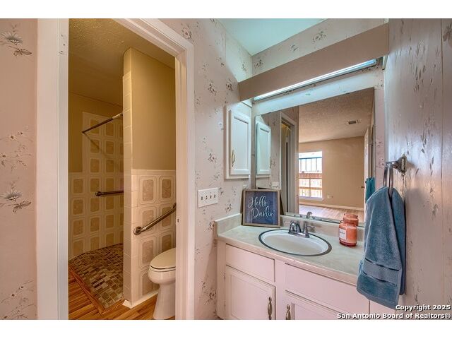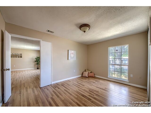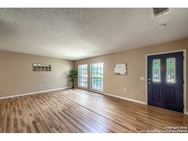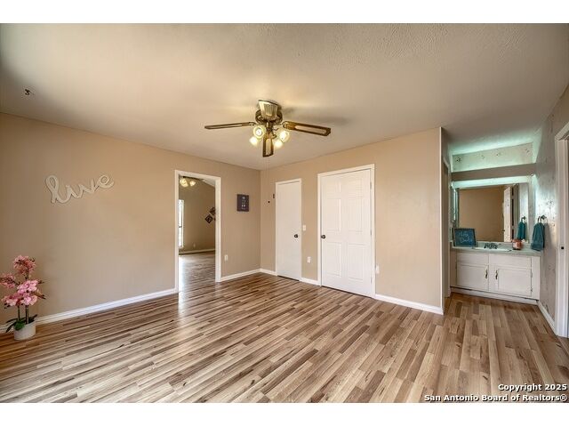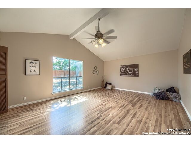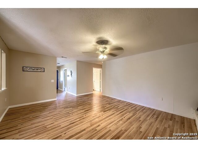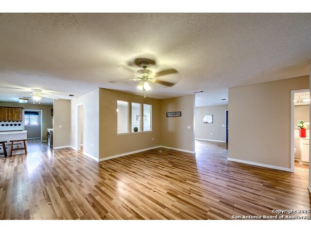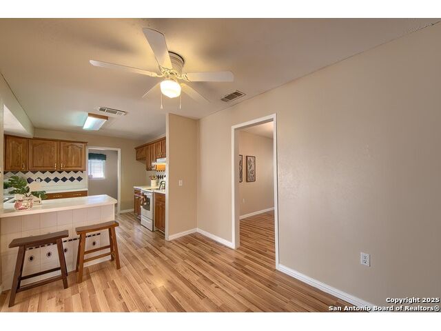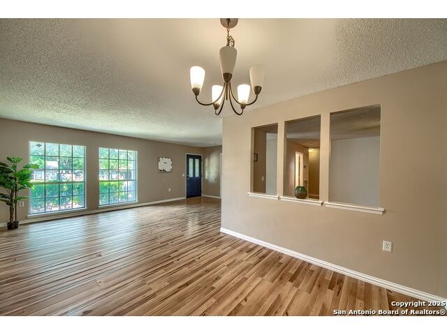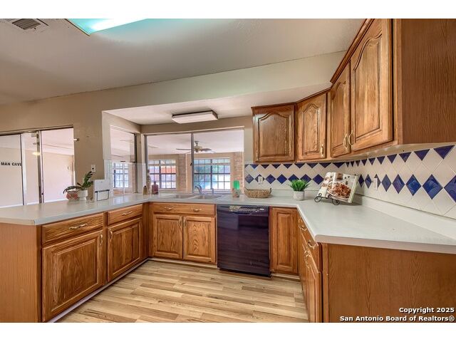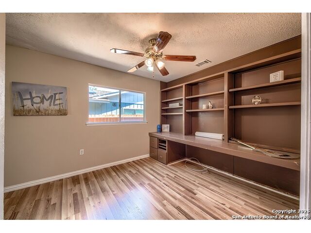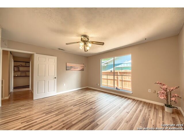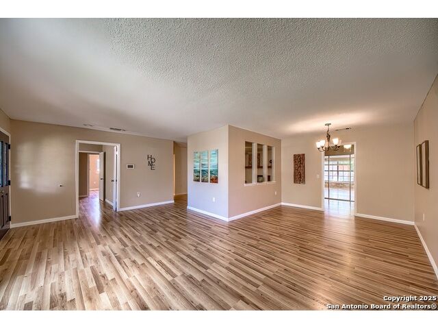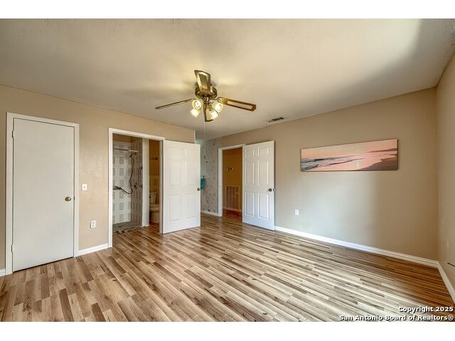 NEVER WANT FOR SPACE IN THIS AFFORDABLE SINGLE STORY BRICK RANCHER WITH NEW ROOF, FRESH PAINT, NEW LUXURY VINYL FLOORING AND A WORKSHOP! Well loved for decades by the same owners who raised their children here, this spacious single story is ready with open arms to welcome you in and turn all your possibilities into realities. Wind through the wide, tree-lined streets leading through Valley Forge and glide up to this charmer beneath mature trees and accented by smart xeriscaping and lawn. Open living is just a start to this traditional home modern comforts that offers more than you thought you could ask for at this price including a huge game room/sunroom and workshop on a slab, fully outfitted for all your projects! Step past the welcoming front porch and into the foyer to find a formal living room adjacent to a formal dining that is separate but still open to the family room and kitchen. A centerpiece, wood burning, brick fireplace with long hearth sets a cozy atmosphere in the family room that adjoins the breakfast nook. Offering original real wood cabinetry and plenty of countertop to work with, the kitchen is ready to go now or renovate to add your personal choices for upgrades. The adjacent laundry room includes cabinetry and shelving and leads into the two-car attached garage with pull-down attic access, storage cabinets and workbench. The primary suite is quite the production with one large room that hosts the adjacent ensuite bath, accessible with spacious walk-in shower with grab bars and no lip. But that's not all! Another doorway leads into the real retreat with beamed vaulted ceiling, two closets and tons of space for a third living area. Or, vice versa, use the first space as an office, exercise room or hobby room and this private enclave as your palatial bedroom. The secondary bedrooms share a guest bath in the hallway leading back to the rest of the house. Just off the family room is a giant air conditioned space to use as you will -- imagine entertaining with the outfitted bar with long counter top, wine nooks and glass shelves or work a business from this room as the owners did both over the years. Outside find a concrete walkway leading to the 18X13 workshop, on a slab, with electricity and work tables. Just add tools and get busy or turn into an office with exterior access if that is what you need! The owner added a concrete walkway from the gate to the shop for ease of use. The nice sized, level yard shaded by mature trees offers enough space for outdoor activities including gardening and playscape. Or, add a swimming pool and make this a real all-encompassing live, relax and work place you'd never have to leave! Located in an ultra-convenient, well established neighborhood -- right off I-35 at O'Connor near 1604 in NE San Antonio -- an easy commute to military bases to include RAFB, SAMMC and Fort Sam as well as all the cool things to do downtown at the Riverwalk. Shopping and restaurants are just minutes away as are the NEISD schools the home is zoned to attend. If you work from home and/or run a business from home, or if multi-generational living is what you need, this property checks every box. There is no HOA to worry about, just city regulations, so feel free to have chickens and other options usually governed by HOAs. The new architectural shingle roof with 30 year shingles will help keep your property insurance costs lower than other homes. Don't wait for another opportunity like this to come along, run and see this one and make it your own.