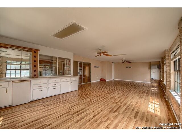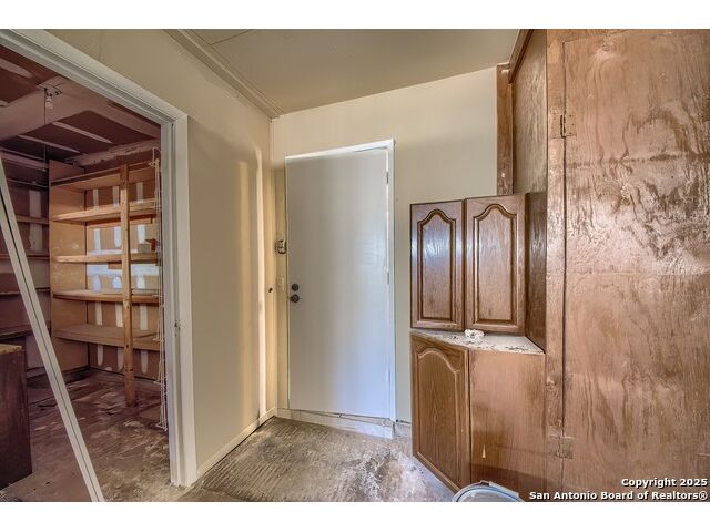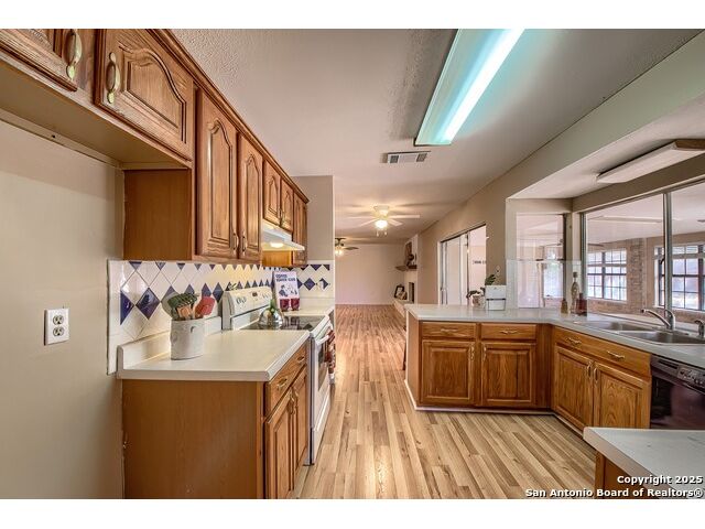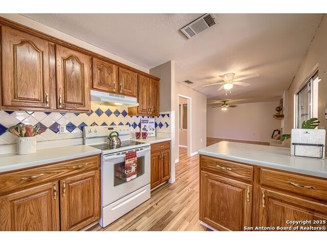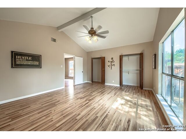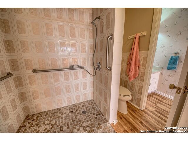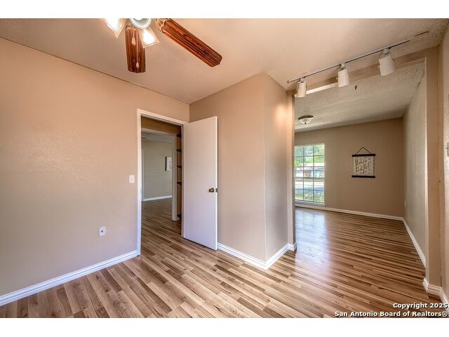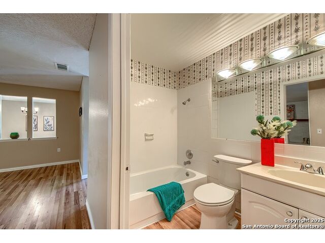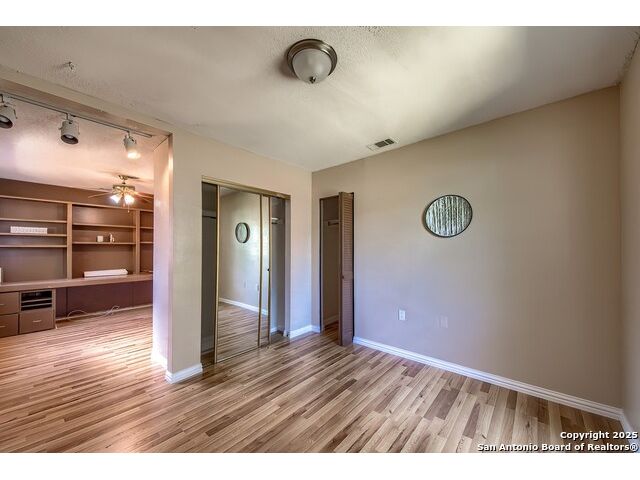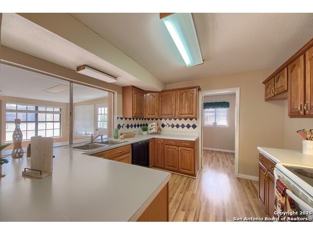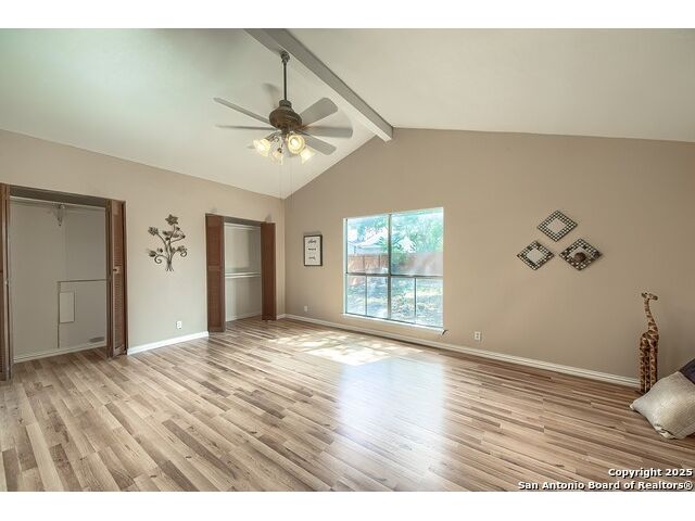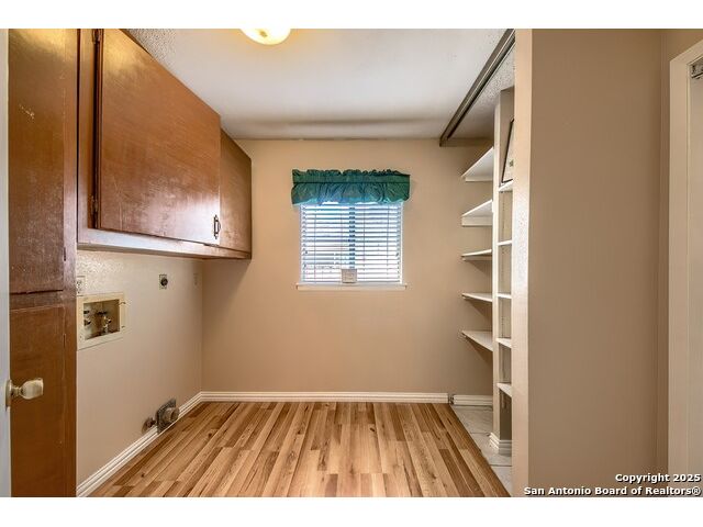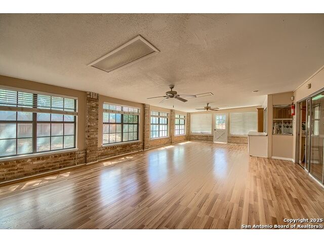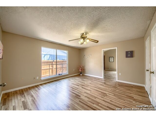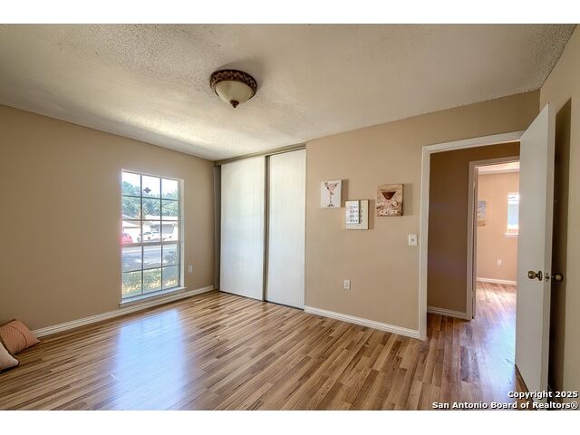 NEVER WANT FOR SPACE IN THIS AFFORDABLE SINGLE STORY BRICK RANCHER WITH NEW ROOF, FRESH PAINT, NEW LUXURY VINYL FLOORING AND A WORKSHOP! Well loved for decades by the same owners who raised their children here, this spacious single story is ready with open arms to welcome you in and turn all your possibilities into realities. Wind through the wide, tree-lined streets leading through Valley Forge and glide up to this charmer beneath mature trees and accented by smart xeriscaping and lawn. Open living is just a start to this traditional home modern comforts that offers more than you thought you could ask for at this price including a huge game room/sunroom and workshop on a slab, fully outfitted for all your projects! Step past the welcoming front porch and into the foyer to find a formal living room adjacent to a formal dining that is separate but still open to the family room and kitchen. A centerpiece, wood burning, brick fireplace with long hearth sets a cozy atmosphere in the family room that adjoins the breakfast nook. Offering original real wood cabinetry and plenty of countertop to work with, the kitchen is ready to go now or renovate to add your personal choices for upgrades. The adjacent laundry room includes cabinetry and shelving and leads into the two-car attached garage with pull-down attic access, storage cabinets and workbench. The primary suite is quite the production with one large room that hosts the adjacent ensuite bath, accessible with spacious walk-in shower with grab bars and no lip. But that's not all! Another doorway leads into the real retreat with beamed vaulted ceiling, two closets and tons of space for a third living area. Or, vice versa, use the first space as an office, exercise room or hobby room and this private enclave as your palatial bedroom. The secondary bedrooms share a guest bath in the hallway leading back to the rest of the house. Just off the family room is a giant air conditioned space to use as you will -- imagine entertaining with the outfitted bar with long counter top, wine nooks and glass shelves or work a business from this room as the owners did both over the years. Outside find a concrete walkway leading to the 18X13 workshop, on a slab, with electricity and work tables. Just add tools and get busy or turn into an office with exterior access if that is what you need! The owner added a concrete walkway from the gate to the shop for ease of use. The nice sized, level yard shaded by mature trees offers enough space for outdoor activities including gardening and playscape. Or, add a swimming pool and make this a real all-encompassing live, relax and work place you'd never have to leave! Located in an ultra-convenient, well established neighborhood -- right off I-35 at O'Connor near 1604 in NE San Antonio -- an easy commute to military bases to include RAFB, SAMMC and Fort Sam as well as all the cool things to do downtown at the Riverwalk. Shopping and restaurants are just minutes away as are the NEISD schools the home is zoned to attend. If you work from home and/or run a business from home, or if multi-generational living is what you need, this property checks every box. There is no HOA to worry about, just city regulations, so feel free to have chickens and other options usually governed by HOAs. The new architectural shingle roof with 30 year shingles will help keep your property insurance costs lower than other homes. Don't wait for another opportunity like this to come along, run and see this one and make it your own.