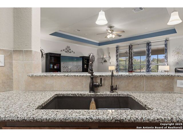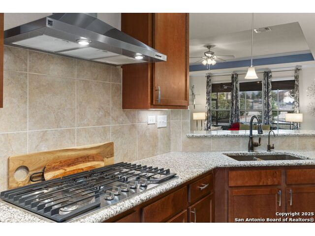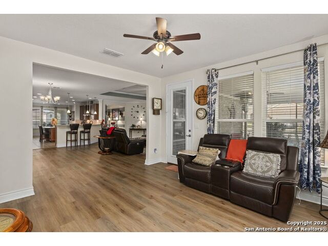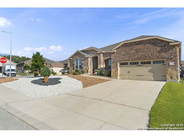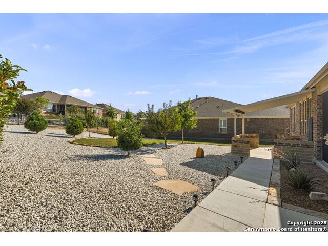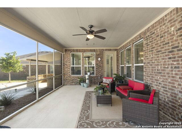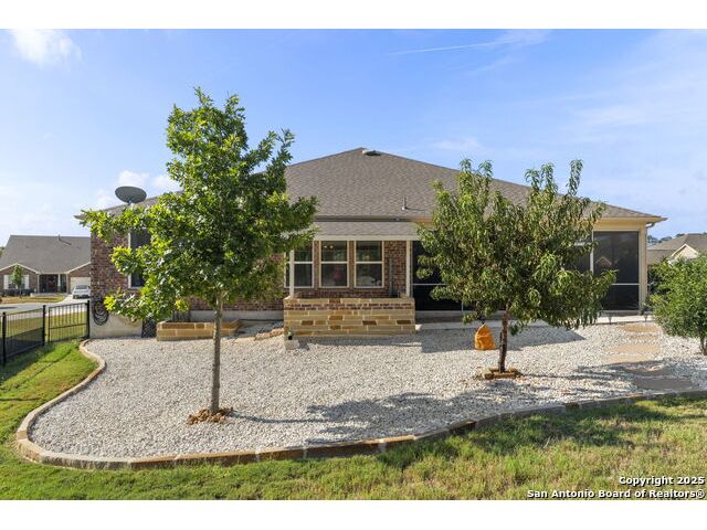 Set on a beautifully xeriscaped corner lot in the desirable Hill Country Retreat by Del Webb 55+ community, this 3 bedroom, 2 bathroom home offers a perfect blend of style, comfort, and low-maintenance living. The inviting curb appeal features a covered front porch that leads into a formal dining or living area and a dedicated office space. An open layout connects the spacious kitchen-complete with stainless steel appliances, an island with seating, abundant cabinetry, generous counter space, and a breakfast nook-to the living room, ideal for entertaining or relaxed daily living. A versatile flex space off the main area provides room for hobbies or reading. The primary suite includes a walk-in closet and a private en suite bathroom with a large dual vanity, while additional bedrooms offer comfort and flexibility for guests. A large enclosed covered patio provides a tranquil setting for enjoying morning coffee or evening breezes. Residents of Hill Country Retreat enjoy access to exceptional amenities, including pools, walking trails, fitness facilities, and social activities, all within minutes of Alamo Ranch shopping and dining.