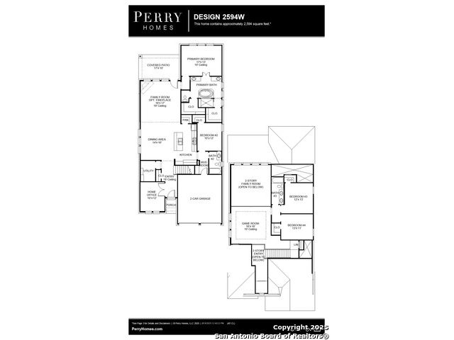 Home office with French doors set at two-story entry. Dining area opens to kitchen and adjacent two-story family room. Kitchen features walk-in pantry, 5-burner gas cooktop and generous island with built-in seating space. Family room features wall of windows. First-floor primary suite includes primary bath with dual vanity, garden tub, separate glass-enclosed shower and two walk-in closets. An additional bedroom is downstairs. A game room and two secondary bedrooms are upstairs. Covered backyard patio and 5-zone sprinkler system. Mud room off two-car garage.