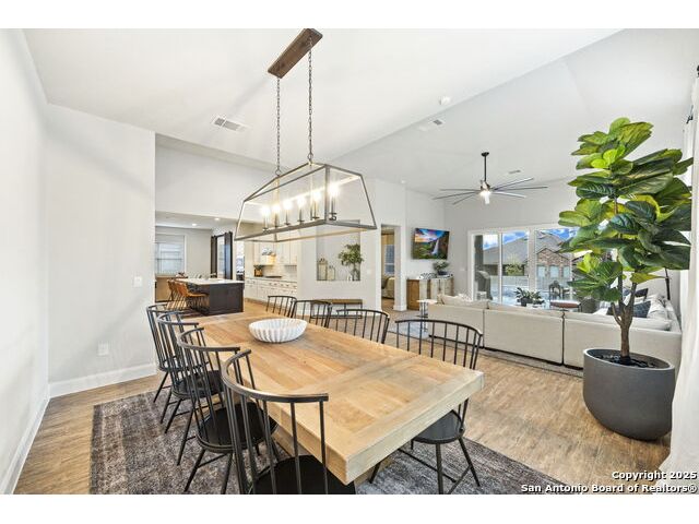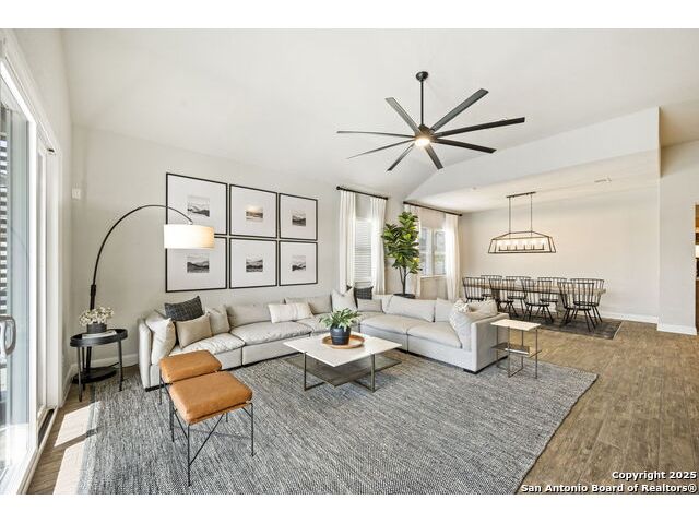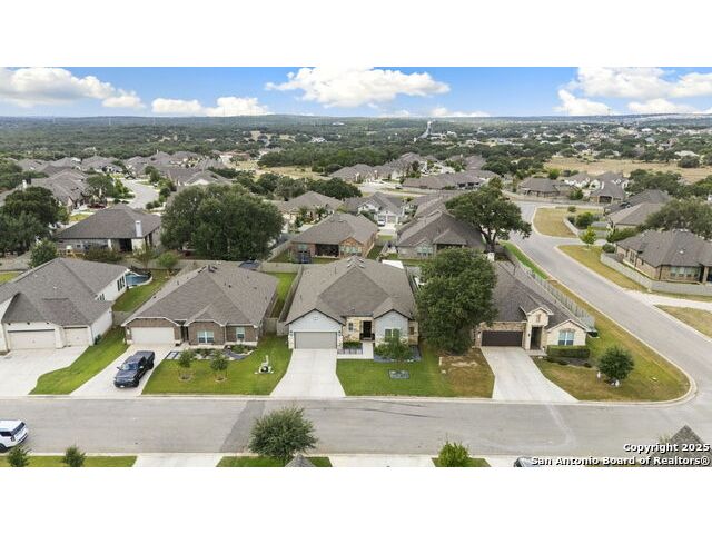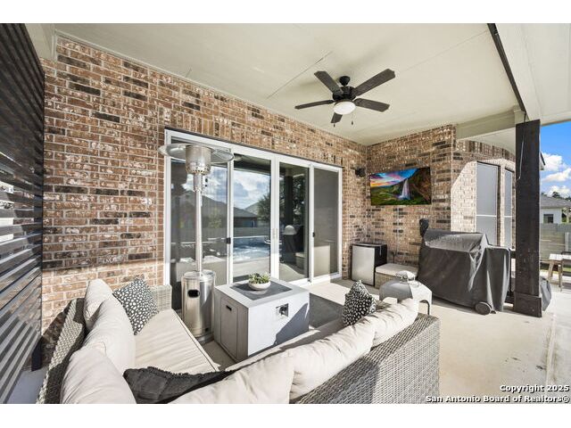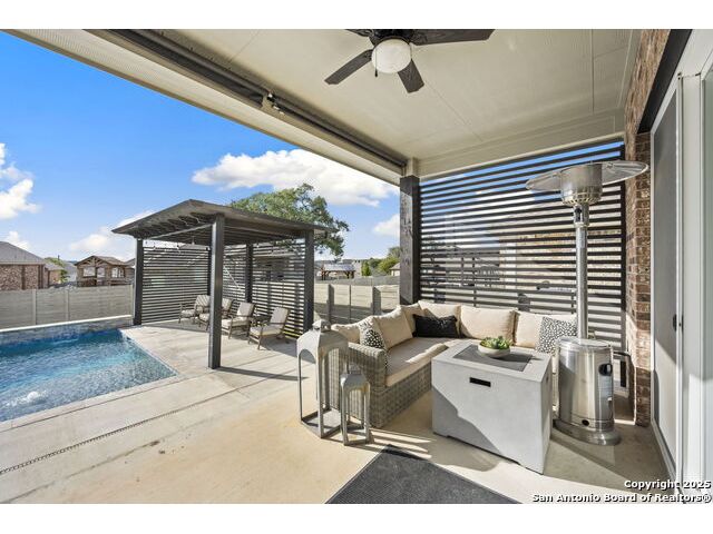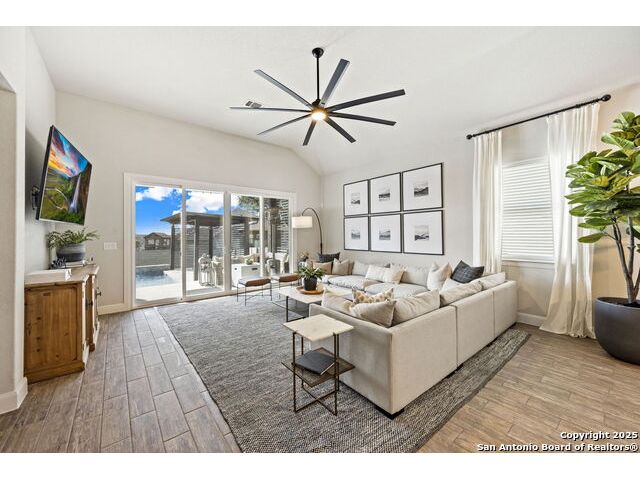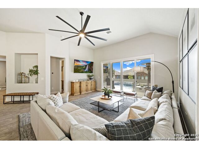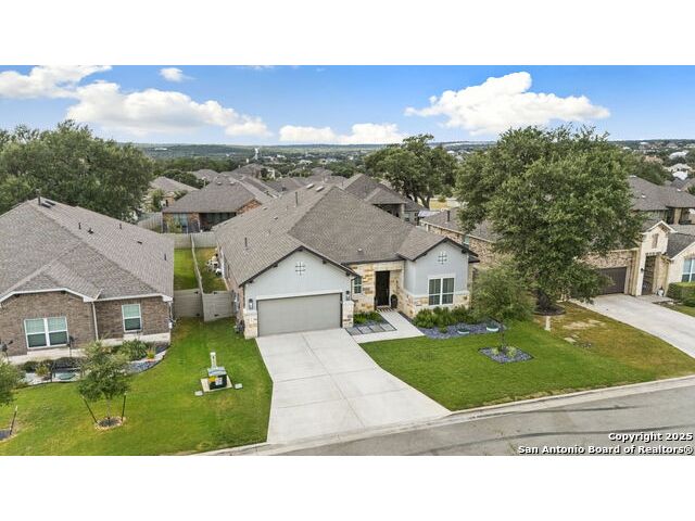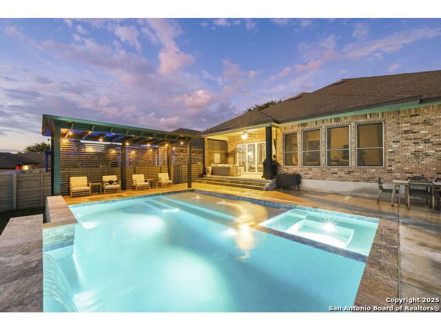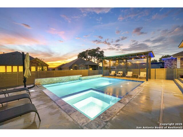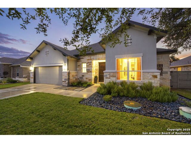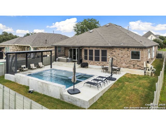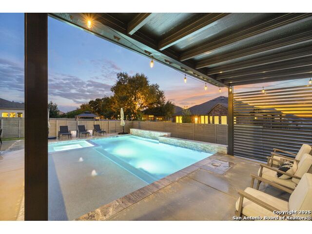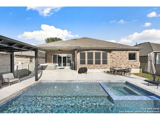 Experience effortless Hill Country living in this stunning single-story home nestled in The Grove at Vintage Oaks-one of New Braunfels' most sought-after communities. Spanning 2,935 square feet, this 4-bedroom, 3.5-bath residence features an open, light-filled floor plan designed for both comfort and connection. The expansive family room with soaring ceilings flows seamlessly into a chef-inspired kitchen and breakfast nook, while a separate dining area provides the perfect space for gatherings and celebrations. A dedicated office offers flexibility for work or creative pursuits, and every room reflects thoughtful craftsmanship and an inviting sense of space. Step outside to your private backyard oasis, where a heated pool, relaxing spa, and shaded pergola create the ultimate retreat for year-round enjoyment. Whether hosting friends or savoring quiet evenings under the stars, this home offers the ideal balance of luxury and leisure. Located in a world-class neighborhood renowned for its resort-style amenities-including multiple pools, a lazy river, fitness center, sports courts, trails, and community events-this residence blends everyday comfort with the best of Hill Country living. Welcome home to The Grove at Vintage Oaks, where style, serenity, and community come together beautifully.