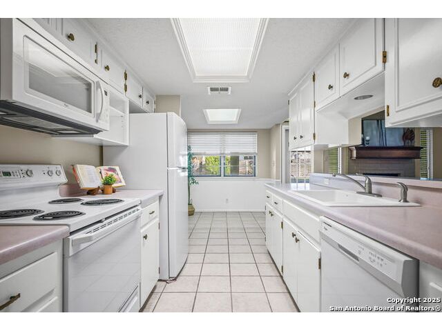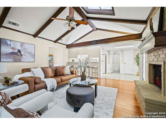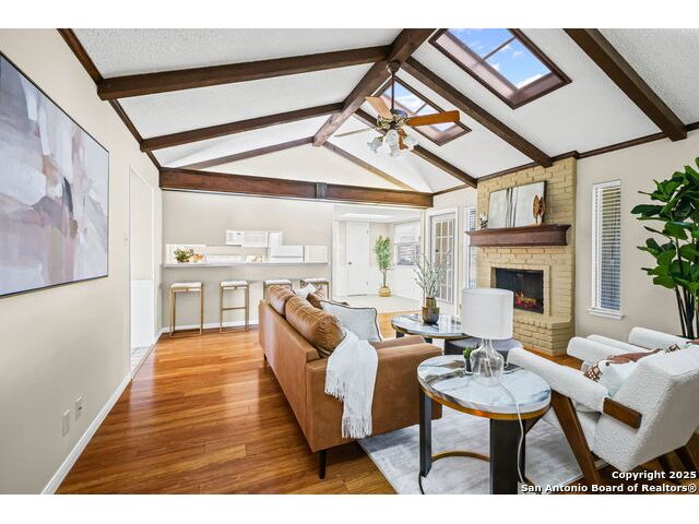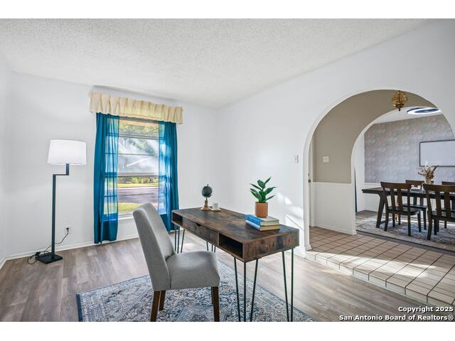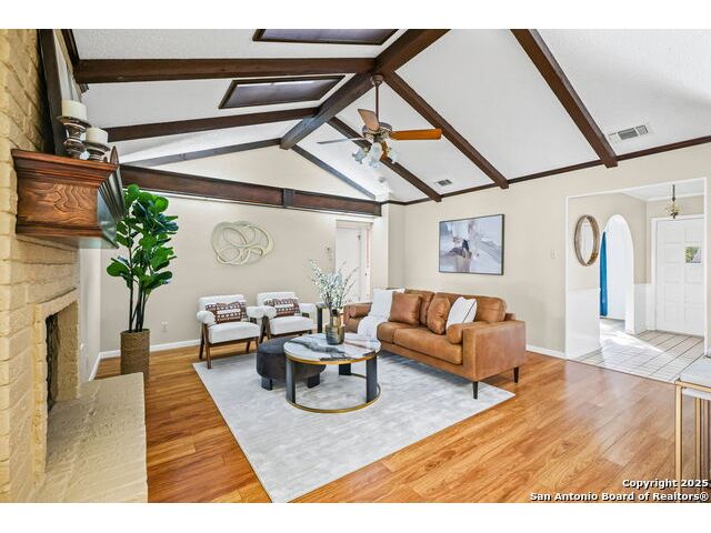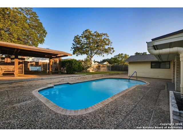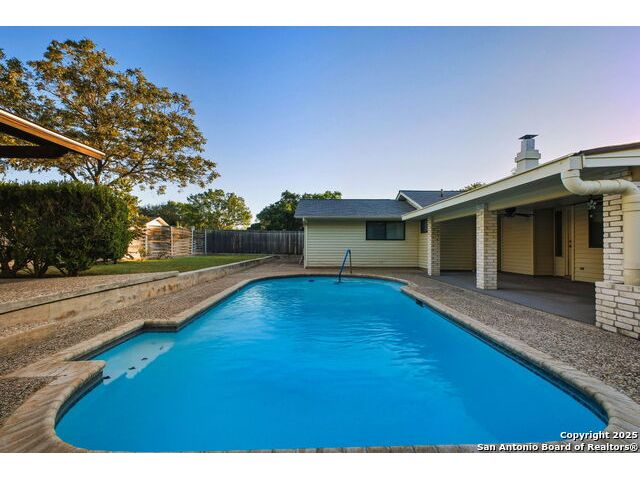 OPEN HOUSE: Saturday, Oct 18 * 1-4 PM and Sunday, Oct 19 * 12-3 PM This meticulously maintained single-story ranch sits on a spacious corner lot with a side-entry two-car garage and extra storage. Inside, you'll find four bedrooms, a large living room, and two dining areas-including a separate formal dining room. The vaulted living room with a cozy wood-burning fireplace is perfect for entertaining. Enjoy charming architectural details like wood beams and arched entryways leading to the dining room and private study/office both with new laminate flooring. Step out back to your own outdoor oasis featuring a gazebo next to a sparkling clean pool, sprinkler system, covered patio with new ceiling fans. If you're handy, you'll love the two sheds-one equipped with workbenches and power for your projects. You'll appreciate the fact that this has a diving POOL and NO HOA. Located in highly rated SCUCISD, and just minutes from JBSA Randolph and JBSA Fort Sam Houston, shopping, and dining. Don't miss it-schedule your showing today! Tons of potential here!