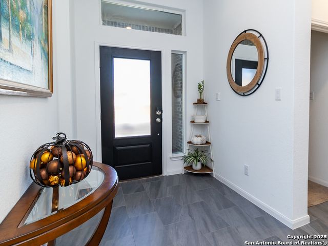 Welcome to this exceptional one-story home situated on a spacious quarter-acre corner lot in the highly desirable Hidden Trails community. Built in 2023, this 4-bedroom, 3-bath home offers the perfect blend of modern design, open-concept living, and everyday functionality. Step inside to soaring ceilings, elegant finishes, and a bright, inviting layout that makes you feel at home instantly. The heart of the home is the expansive island kitchen featuring gas cooking, stainless steel appliances, granite countertops, abundant cabinetry, and a breakfast bar that opens to the living and dining areas that are ideal for entertaining or relaxing with family. A private study provides a quiet space for remote work or reading, while three secondary bedrooms are thoughtfully positioned for comfort and privacy. The spacious primary suite offers a peaceful retreat with plenty of room for large furnishings, and includes an ensuite bath with a walk-in tiled shower, double vanity, and generous walk-in closet. Throughout the home, you'll find recently upgraded tile flooring that adds both style and durability, paired with fresh interior finishes that create a modern and inviting atmosphere. Additional highlights include a 3-car garage with extra driveway space, double-pane windows, ceiling fans, irrigation system, washer/dryer connections, pre-wiring for cable and internet and additional storage built into the attic space. Step outside to a covered patio and fully fenced backyard with room to add a pool, garden, or playscape-perfect for enjoying the outdoors. Residents of Hidden Trails enjoy top-tier amenities including resort-style pools, scenic walking trails, a fitness center, sports courts, clubhouse, playgrounds, and community events. Conveniently located just off HWY 281 and HWY 46 with easy access to San Antonio, New Braunfels, Gruene, Canyon Lake, and more. This is the one you've been waiting for! Schedule your private showing today!