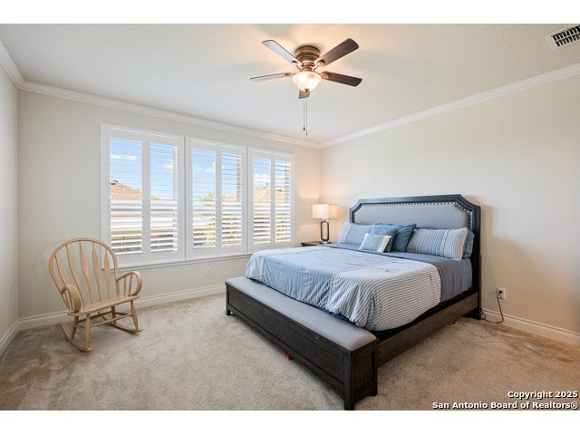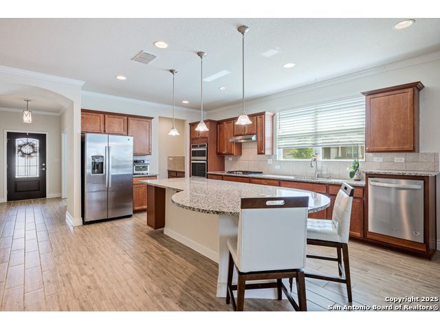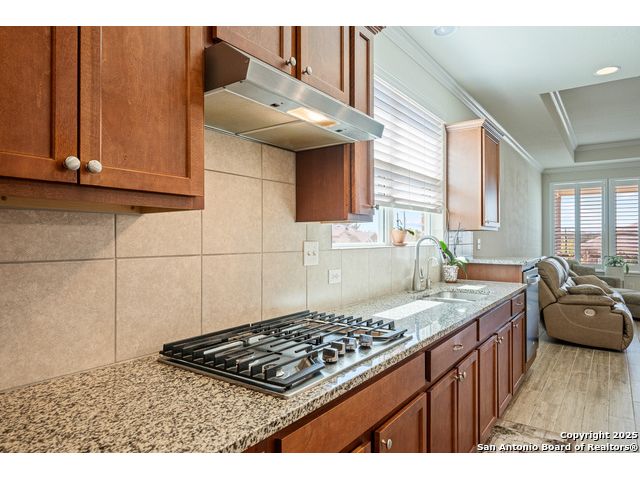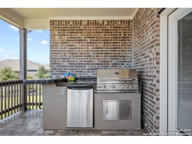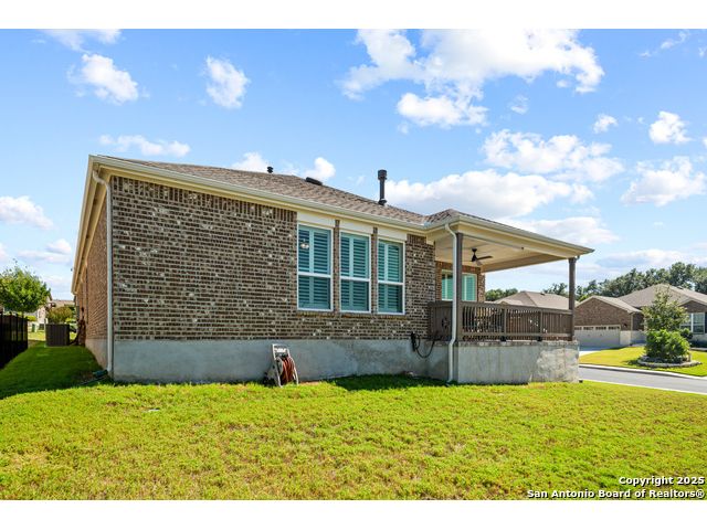 MOVE-IN READY beauty is a TRUE 3 bedroom w study has all the bells & whistles and sits on corner lot. Wood look tile flooring throughout except bedrms. Open kit. has granite counters, built-in SS appliances w/gas cooking. The massive island has plenty of seating room. Ceiling fans, beautiful chandelier in dining, crown molding. Huge walk-in pantry adjacent to butler area (perfect for wine or coffee bar). Plantation shutters across back. Fireplace has gas insert that turns on at flip of switch. Water softener, auto sprinklers. Outdoor kitchen will convey & has gas hookup or use propane and even has frig. Both front & back have non-slip tile flooring. Enjoy sunset views from porch as you have your evening dinner. Neighborhood has 28,000 sf resort with multiple pools (1 indoor), hot tubs, billiards, library, exercise room, and tons of activities and clubs. Plus, miles of beautiful walking trails throughout the community.