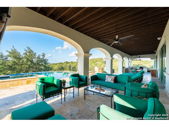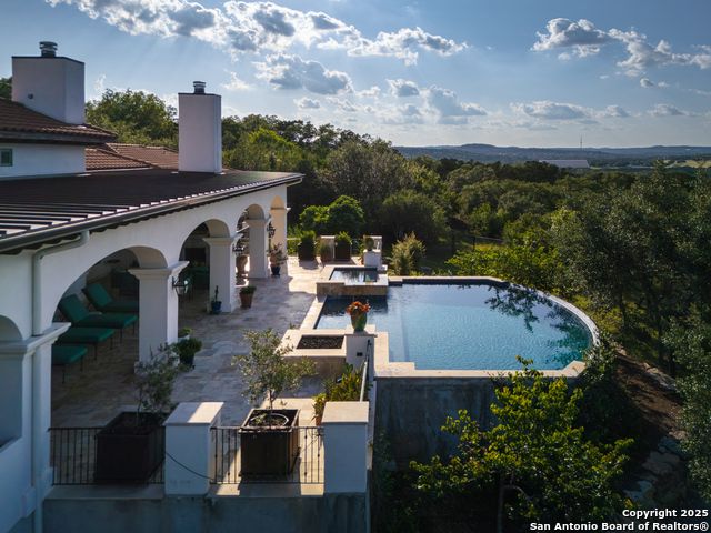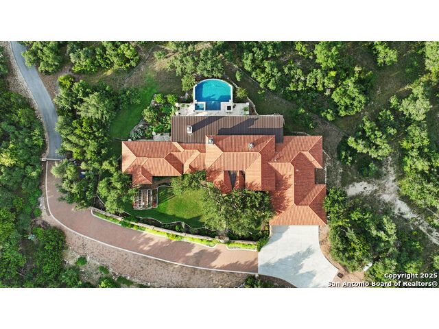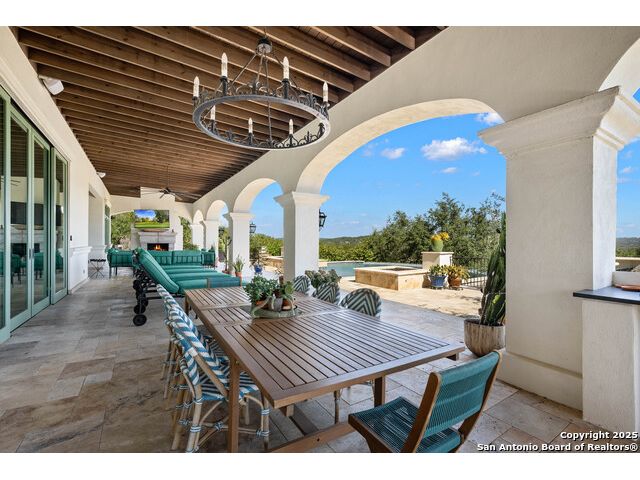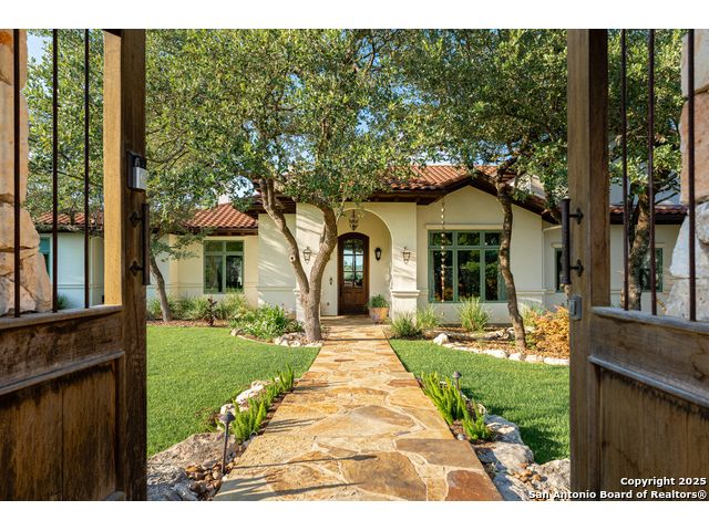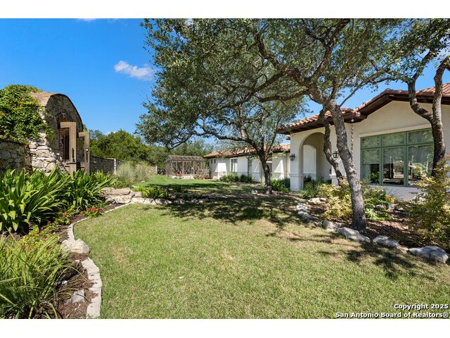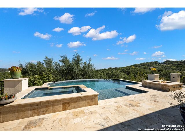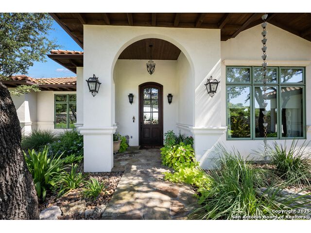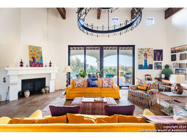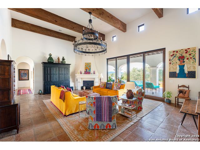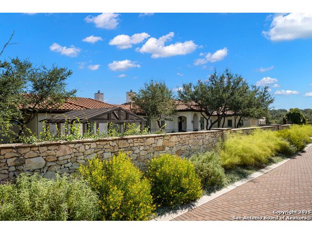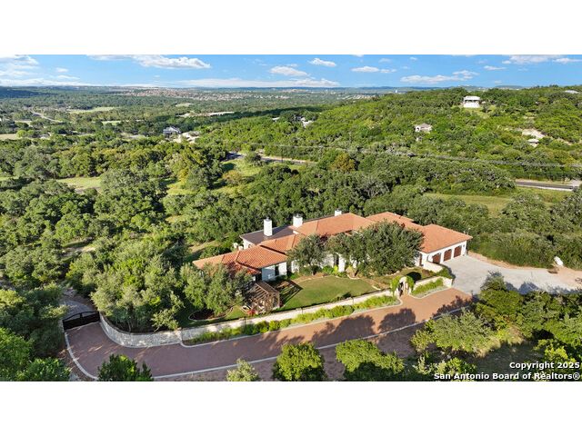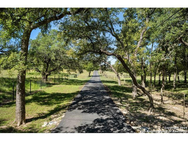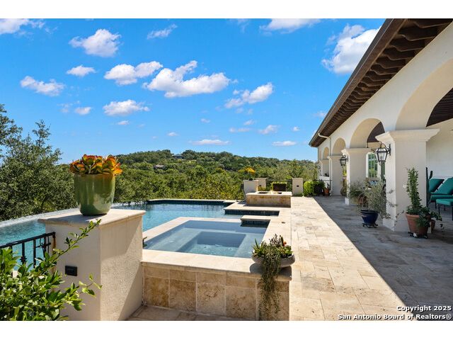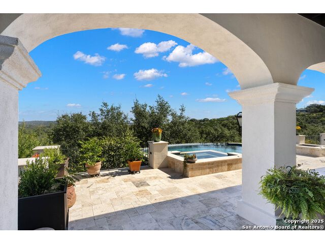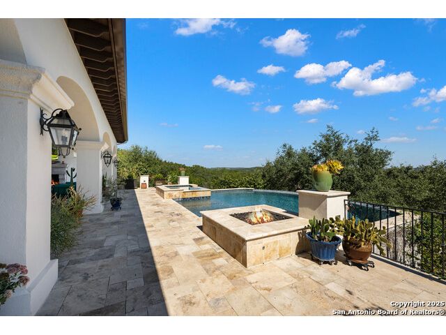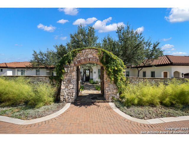 This truly one-of-a-kind property offers exclusive privacy and breathtaking views from every room. Nestled on over 10 AG exempt acres, it combines the luxury of peaceful, rural living with the convenience of being just 10 minutes from La Cantera, The Rim & I10. This home offers an unparalleled living experience in a private, scenic setting. Coming up the drive you are welcomed with a stunning hand-stacked rock wall which leads you to a spacious brick driveway with ample parking. From the moment you arrive, the thoughtful design and attention to detail are evident, setting the tone for the unique and unexpected experience this home has to offer. The home boasts soaring 18-foot ceilings in the main living areas, yet maintains a cozy, welcoming atmosphere. The large living room features one of the home's three fireplaces, with substantial cedar wood-beams lining the ceilings and 8-foot sliding glass doors that open up to spectacular views of the pool and surrounding landscape. The entryway and kitchen area are adorned with gorgeous, hand-troweled, groin-vaulted ceilings, adding timeless architecture. Off the kitchen and family room, you'll find another fireplace surrounded by stacked rock, creating a warm and inviting space. The dining room is has handmade, 1 of a kind, cement tiles. The expansive kitchen is perfect for entertaining, with top-of-the-line appliances, a prep pantry, and a private bar area. The primary suite is a true retreat, featuring coveted dual bathrooms and closets, each designed to offer unmatched privacy. Both spaces are bathed in natural light and offer serene views of the property. It features beautiful tile that exudes a softness, inspired by the elegant charm of the Marais Rue des Rosiers. Off the primary suite, you'll find a charming study, complete with custom built-in cabinets and a beautifully crafted wood-beamed ceiling. On the other side of the home, there are three additional bedrooms, each with ensuite bathrooms and continuous views. Step outside to discover the incredible 1,200+ square-foot patio with an outdoor living area, fireplace and featuring a sparkling pool with an adjoining spa and a fantastic outdoor kitchen-perfect for dining, entertaining, and savoring the peaceful, picturesque surroundings. Tucked away off the patio is a true gardener's highlight, a private garden room & protected exterior garden house. Inviting, understated, and truly one of a kind, this property will be one that you will want to see.
