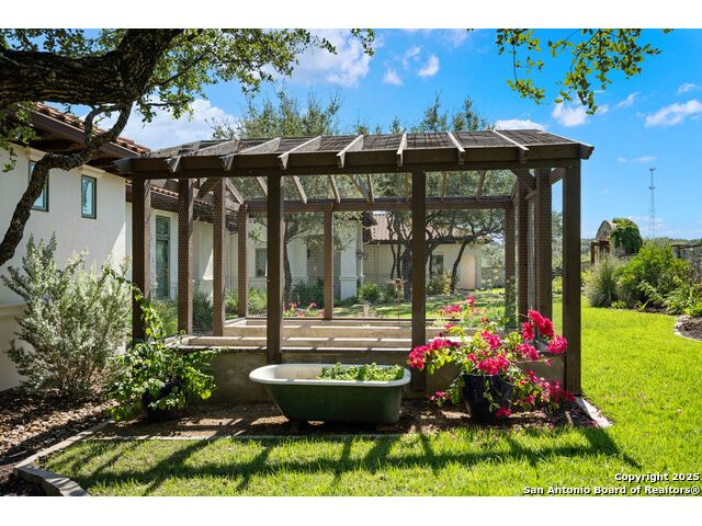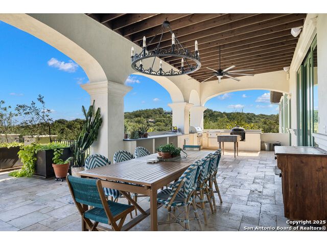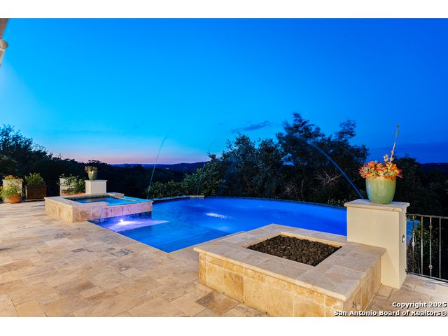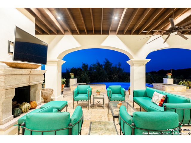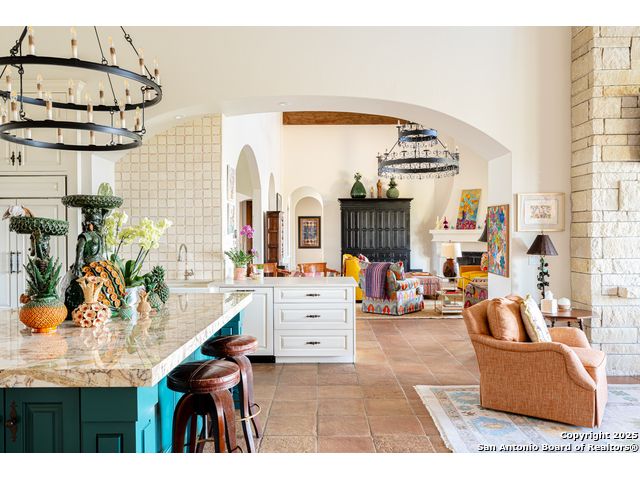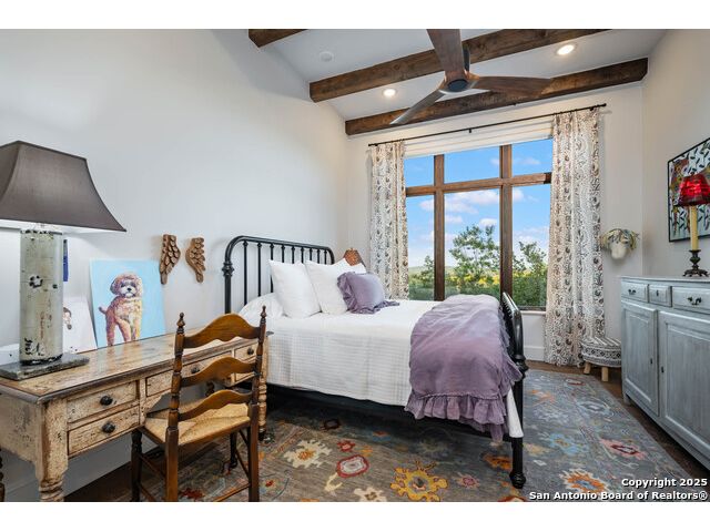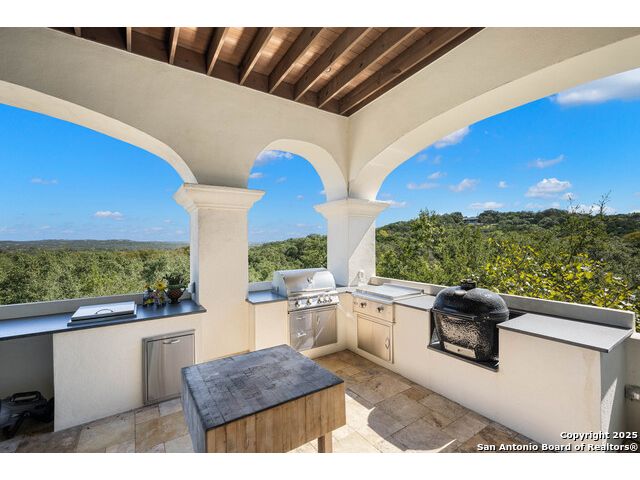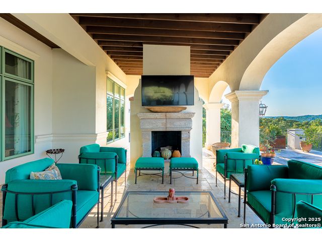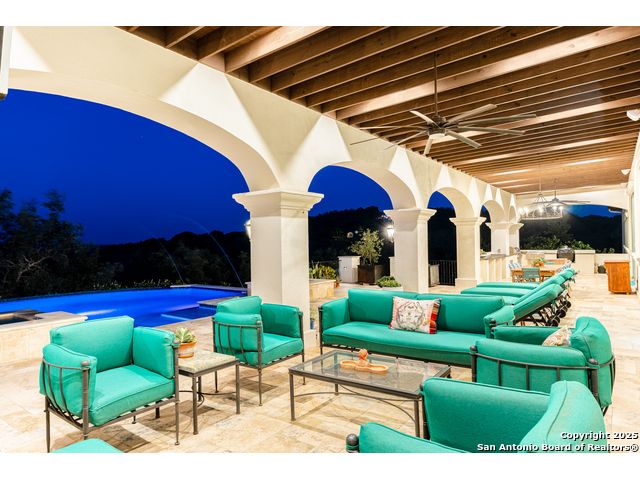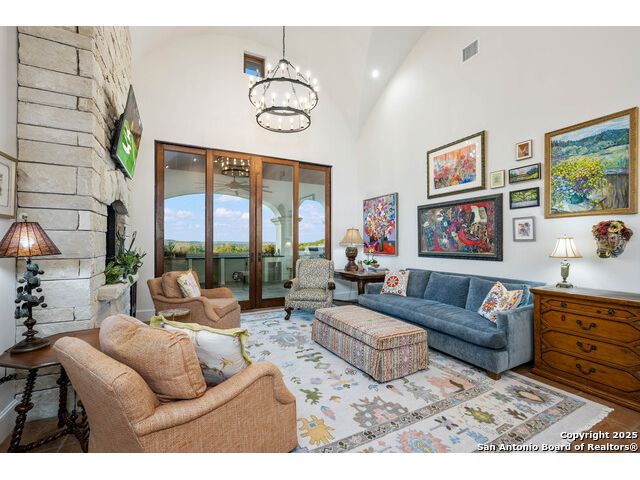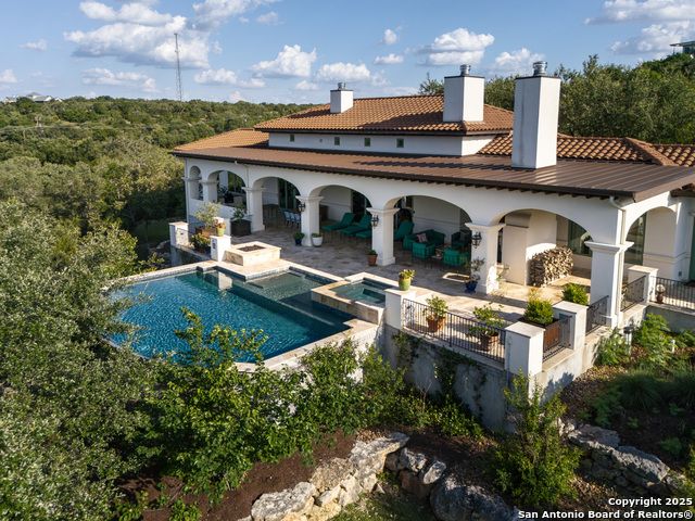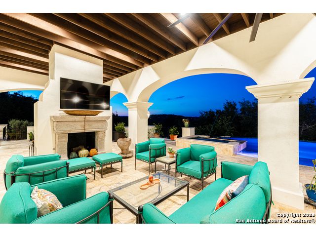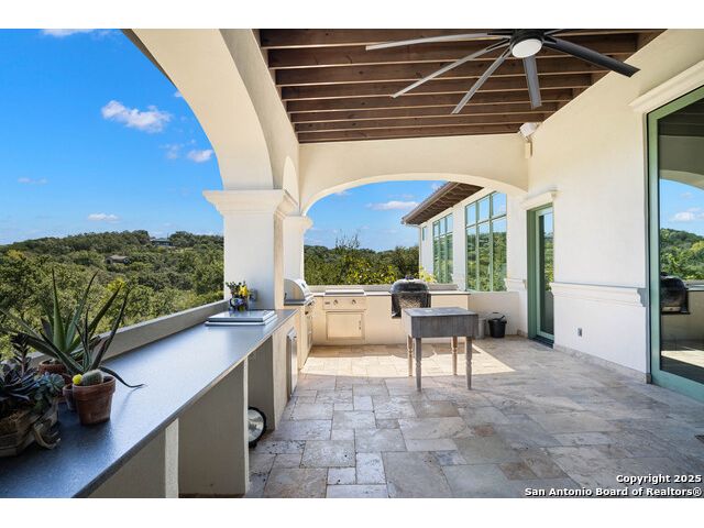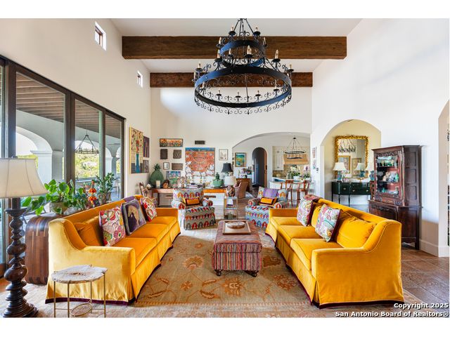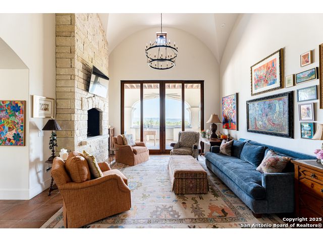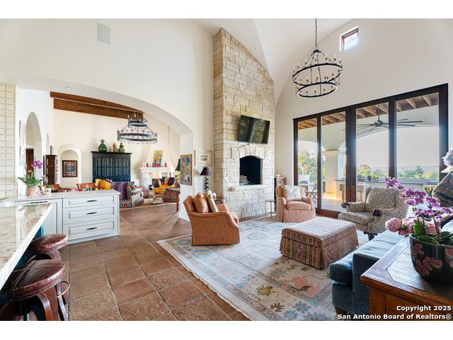 This truly one-of-a-kind property offers exclusive privacy and breathtaking views from every room. Nestled on over 10 AG exempt acres, it combines the luxury of peaceful, rural living with the convenience of being just 10 minutes from La Cantera, The Rim & I10. This home offers an unparalleled living experience in a private, scenic setting. Coming up the drive you are welcomed with a stunning hand-stacked rock wall which leads you to a spacious brick driveway with ample parking. From the moment you arrive, the thoughtful design and attention to detail are evident, setting the tone for the unique and unexpected experience this home has to offer. The home boasts soaring 18-foot ceilings in the main living areas, yet maintains a cozy, welcoming atmosphere. The large living room features one of the home's three fireplaces, with substantial cedar wood-beams lining the ceilings and 8-foot sliding glass doors that open up to spectacular views of the pool and surrounding landscape. The entryway and kitchen area are adorned with gorgeous, hand-troweled, groin-vaulted ceilings, adding timeless architecture. Off the kitchen and family room, you'll find another fireplace surrounded by stacked rock, creating a warm and inviting space. The dining room is has handmade, 1 of a kind, cement tiles. The expansive kitchen is perfect for entertaining, with top-of-the-line appliances, a prep pantry, and a private bar area. The primary suite is a true retreat, featuring coveted dual bathrooms and closets, each designed to offer unmatched privacy. Both spaces are bathed in natural light and offer serene views of the property. It features beautiful tile that exudes a softness, inspired by the elegant charm of the Marais Rue des Rosiers. Off the primary suite, you'll find a charming study, complete with custom built-in cabinets and a beautifully crafted wood-beamed ceiling. On the other side of the home, there are three additional bedrooms, each with ensuite bathrooms and continuous views. Step outside to discover the incredible 1,200+ square-foot patio with an outdoor living area, fireplace and featuring a sparkling pool with an adjoining spa and a fantastic outdoor kitchen-perfect for dining, entertaining, and savoring the peaceful, picturesque surroundings. Tucked away off the patio is a true gardener's highlight, a private garden room & protected exterior garden house. Inviting, understated, and truly one of a kind, this property will be one that you will want to see.