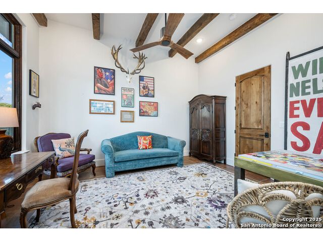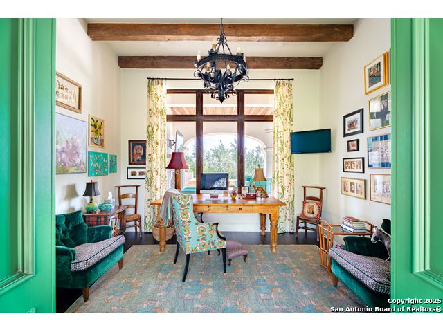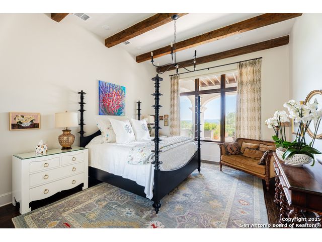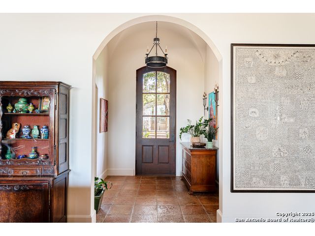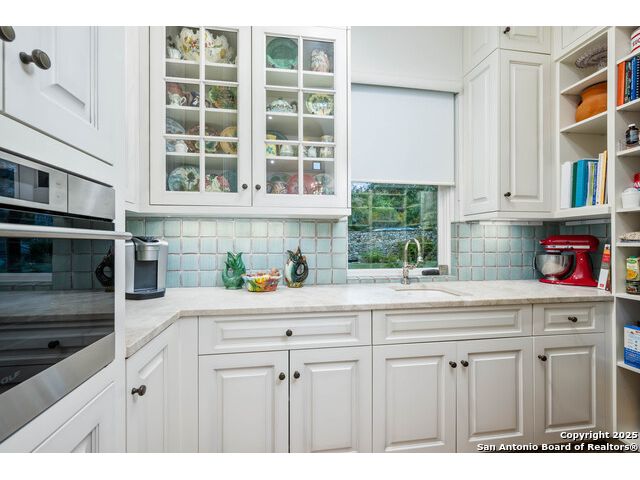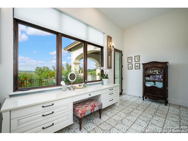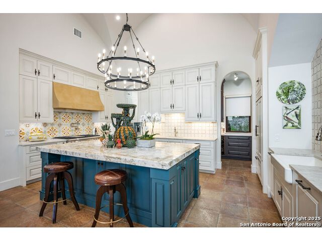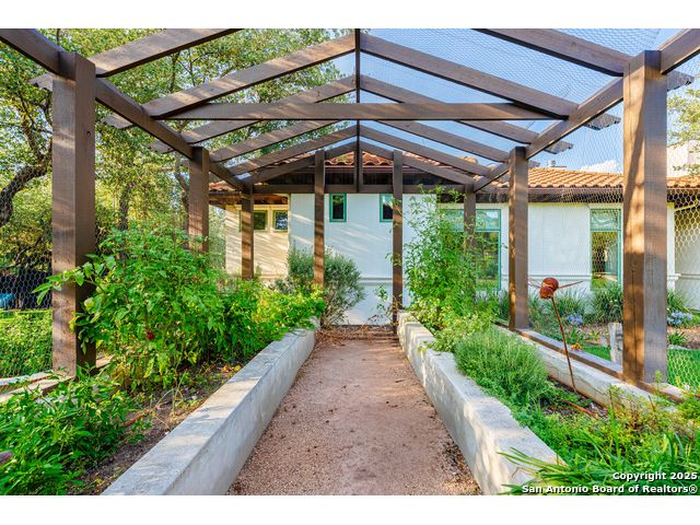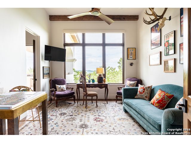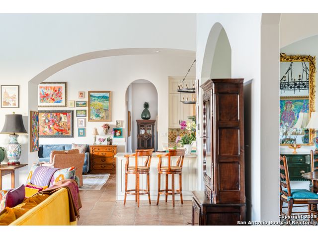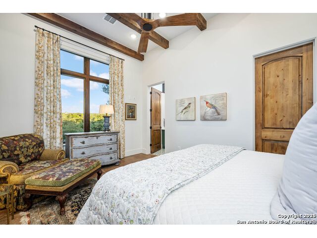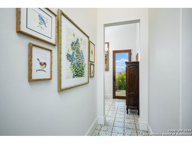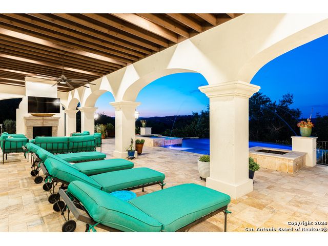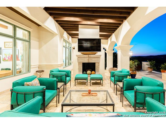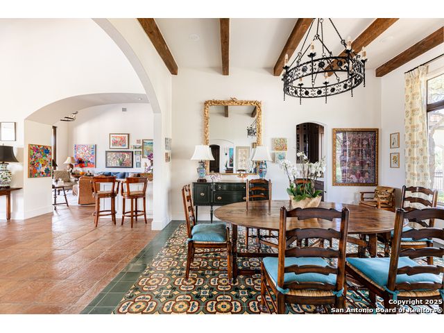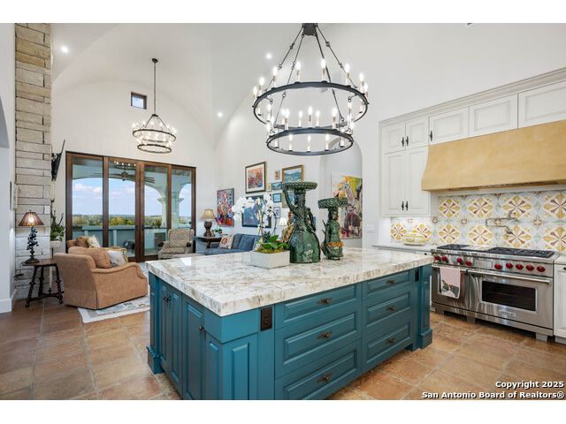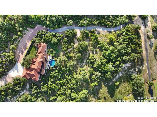 This truly one-of-a-kind property offers exclusive privacy and breathtaking views from every room. Nestled on over 10 AG exempt acres, it combines the luxury of peaceful, rural living with the convenience of being just 10 minutes from La Cantera, The Rim & I10. This home offers an unparalleled living experience in a private, scenic setting. Coming up the drive you are welcomed with a stunning hand-stacked rock wall which leads you to a spacious brick driveway with ample parking. From the moment you arrive, the thoughtful design and attention to detail are evident, setting the tone for the unique and unexpected experience this home has to offer. The home boasts soaring 18-foot ceilings in the main living areas, yet maintains a cozy, welcoming atmosphere. The large living room features one of the home's three fireplaces, with substantial cedar wood-beams lining the ceilings and 8-foot sliding glass doors that open up to spectacular views of the pool and surrounding landscape. The entryway and kitchen area are adorned with gorgeous, hand-troweled, groin-vaulted ceilings, adding timeless architecture. Off the kitchen and family room, you'll find another fireplace surrounded by stacked rock, creating a warm and inviting space. The dining room is has handmade, 1 of a kind, cement tiles. The expansive kitchen is perfect for entertaining, with top-of-the-line appliances, a prep pantry, and a private bar area. The primary suite is a true retreat, featuring coveted dual bathrooms and closets, each designed to offer unmatched privacy. Both spaces are bathed in natural light and offer serene views of the property. It features beautiful tile that exudes a softness, inspired by the elegant charm of the Marais Rue des Rosiers. Off the primary suite, you'll find a charming study, complete with custom built-in cabinets and a beautifully crafted wood-beamed ceiling. On the other side of the home, there are three additional bedrooms, each with ensuite bathrooms and continuous views. Step outside to discover the incredible 1,200+ square-foot patio with an outdoor living area, fireplace and featuring a sparkling pool with an adjoining spa and a fantastic outdoor kitchen-perfect for dining, entertaining, and savoring the peaceful, picturesque surroundings. Tucked away off the patio is a true gardener's highlight, a private garden room & protected exterior garden house. Inviting, understated, and truly one of a kind, this property will be one that you will want to see.
