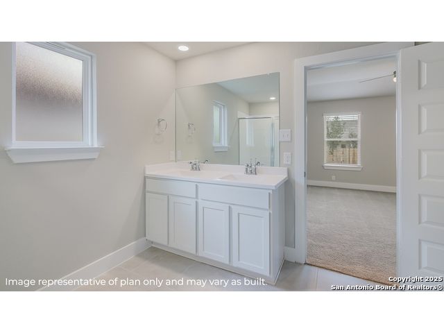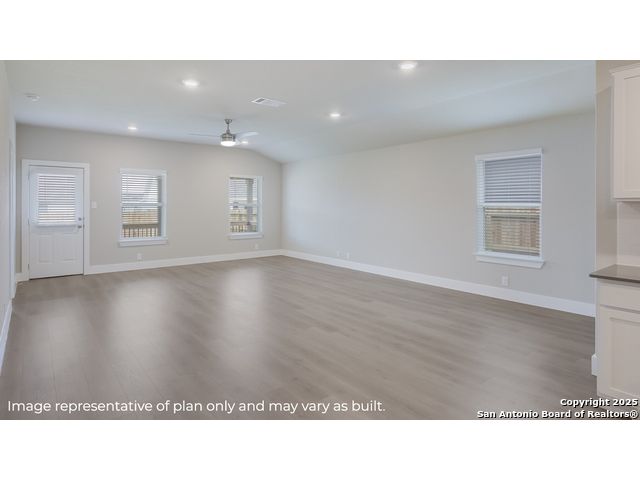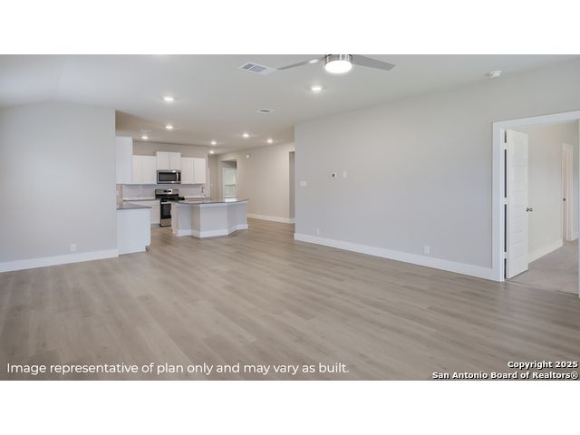 Step into The Kingston floor plan at Riverstone at Westpointe located in San Antonio, TX, a single story home offering 4 bedrooms and 2 bathrooms. This home also features 2 classic front exteriors, a 2-car garage and 2024 square feet of comfortable living. The Kingston features and open-concept layout that blends together to form the perfect space for everyday living. An inviting foyer welcomes you into the kitchen, complete with a natural gas cooking range, stainless steel appliances, subjway tile backsplash, quartz countertops and shaker style cabinets. The kitchen island faces the dining area and living room and offers a deep, single bowl sink and extra countertop space, perfect for bar seating. The private main bedroom suite is located off the living room towards the back of the home and features quality carpet, large windows and a ceiling fan. Your connected bathroom is an oasis, complete with dual vanity sinks, cultured marble countertops, a tiled walk-in shower, shaker style cabinets and a separate room for the toilet. You'll have all the space you need to get ready in the morning with a large walk-in closet. You'll find quality carpet and closets in all of your secondary bedrooms, which can also be used as offices, play rooms or other bonus rooms. Head out the back door located off the living room to find the rear covered patio (per plan) and full yard landscaping & irrigation. Additional features of The Kingston include hard surface flooring at entry, downstairs, halls, living room, kitchen, and dining/breakfast area, tile in all bathrooms and utility room, pre-plumb for water softener loop and faux wood window blinds throughout the home. This home also includes our HOME IS CONNECTED base package. Using one central hub that talks to all the devices in your home, you can control the lights, thermostat and locks, all from your cellular device.