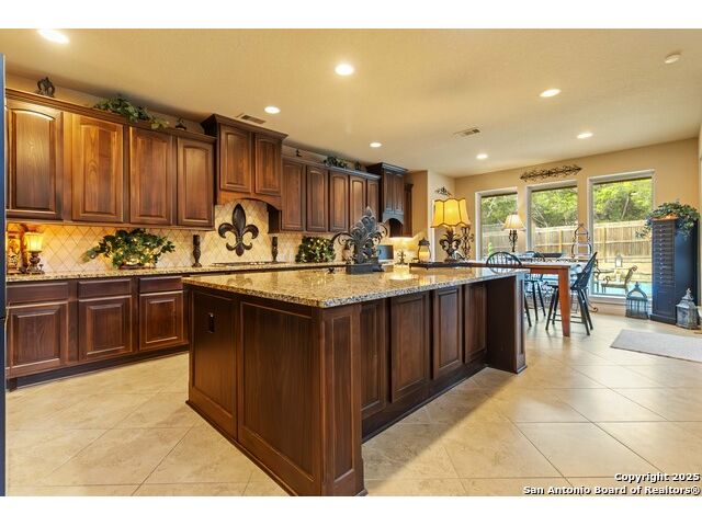 Welcome to River Rock Ranch - Luxury Living in a Gated Hill Country Community Discover this stunning 5-bedroom, 4.5-bath home nestled in the highly sought-after River Rock Ranch community. Boasting 4,187 square feet of thoughtfully designed living space, this home is the perfect blend of elegance, comfort, and entertainment-ready amenities. Step through the grand two-story entryway with 18-foot ceilings, flanked by a formal dining room and a private library with elegant French doors-ideal for remote work or a quiet retreat. The open-concept floor plan is anchored by rich travertine and wood flooring, seamlessly connecting the spacious living areas. At the heart of the home, you'll find a two-story family room filled with natural light from a wall of windows and centered around a cozy corner fireplace. The chef's island kitchen is a culinary dream, featuring built-in seating, Butler's pantry, walk-in pantry, and an inviting morning area overlooking the backyard. Retreat to your private master suite, tucked away on the main floor, where a curved wall of windows offers peaceful views. The luxurious master bath includes a garden tub, glass-enclosed shower, dual vanities, and two oversized walk-in closets. Perfect for multigenerational living or guests, a secondary bedroom with its own private bath is also located on the main level, along with a powder bath for visitors. Upstairs, the entertainment continues with a spacious game room, a fully enclosed media room, three additional guest bedrooms, and two full baths-providing ample space for family and friends. Step outside to your personal oasis: a sparkling pool and spa, all shaded under a huge covered patio-an entertainer's paradise for year-round enjoyment. Additional highlights include an oversized 3-car garage and access to River Rock Ranch's resort-style amenities. Conveniently located near La Cantera, The Rim, H-E-B, and top-rated schools, this home offers the perfect balance of privacy, luxury, and everyday convenience.