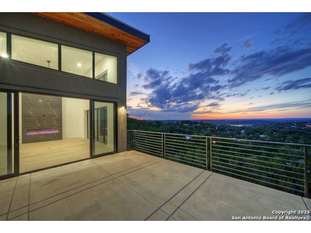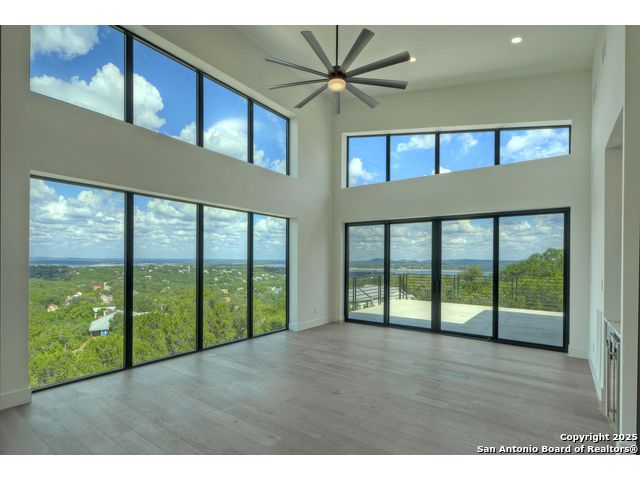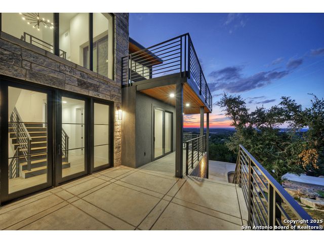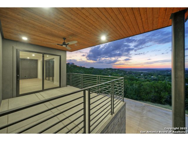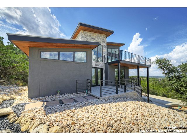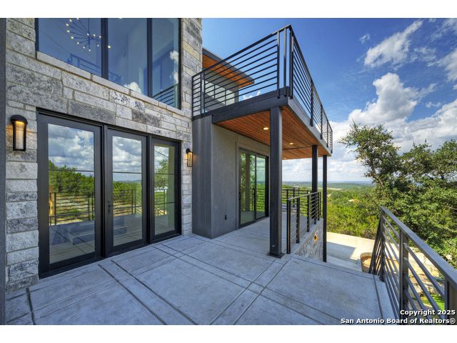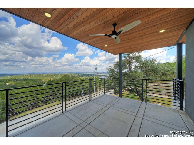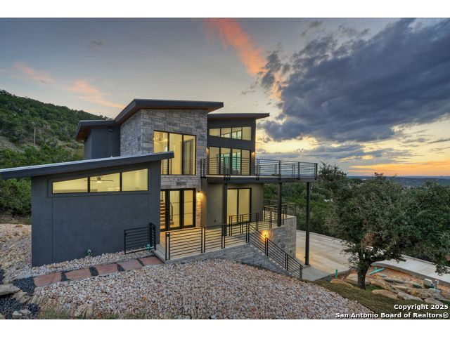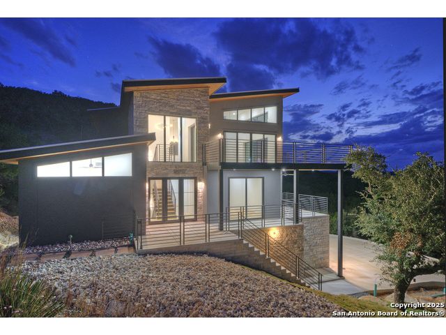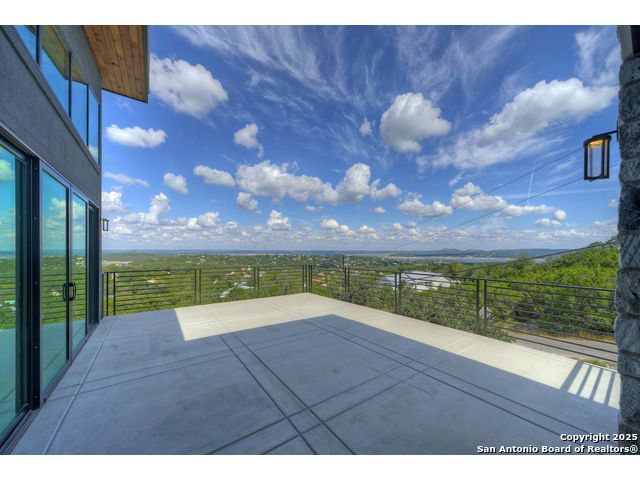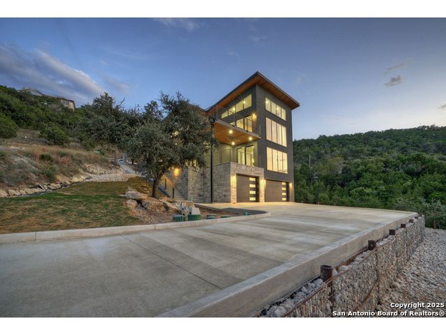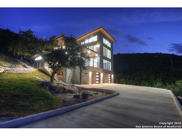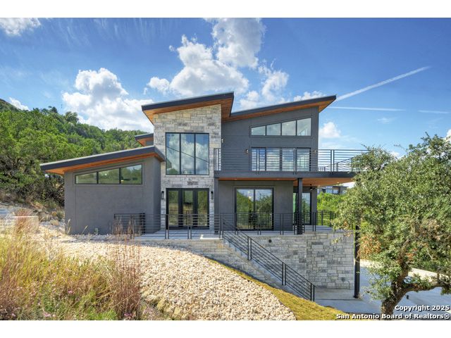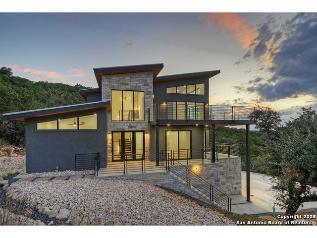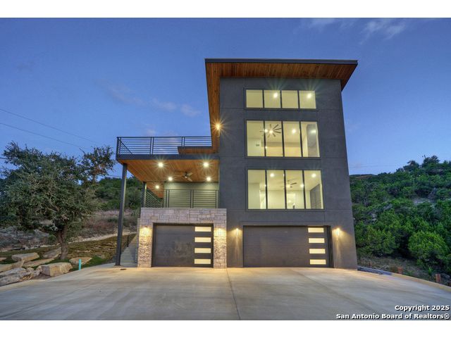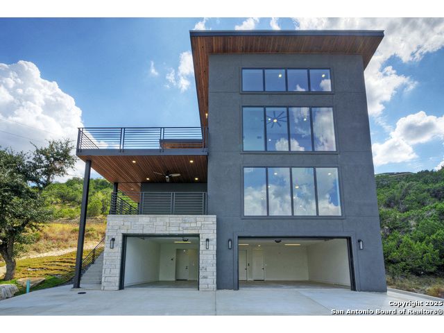 Soaring high above the Texas Hill Country, this 4,000+ square foot custom estate offers breathtaking panoramic views of Canyon Lake from nearly every room. Built for luxury and designed to showcase the stunning natural surroundings, the property provides an exceptional blend of elegant indoor living and spectacular outdoor entertaining. The house is built with insulated concrete forms (ICF), which combines the strength of steel-reinforced concrete with the energy efficiency of foam insulation. A grand-scale, open-concept living area with soaring ceilings, fireplace, and a wall of floor-to-ceiling windows that perfectly frame the mesmerizing lake views. Wood floors flow throughout the main living spaces, reflecting the abundant natural light. Gourmet chef's kitchen featuring premium, professional-grade stainless steel appliances, custom cabinetry, and an oversized island with generous prep space and bar seating. The luxurious owner's retreat boasts floor-to-ceiling windows, a spa-style bathroom with a freestanding soaking tub and rainfall shower, walk-in closet with direct access to the laundry room, and a private balcony overlooking the water. A residential elevator provides effortless access to all levels of the expansive floor plan. Flexible bonus spaces that can be used as a home theater, a fitness room, safe room, wine cellar, or a dedicated home office, providing a customized experience for the discerning homeowner. Multiple expansive outdoor decks offer spectacular 360-degree vistas of the lake and rolling hills.