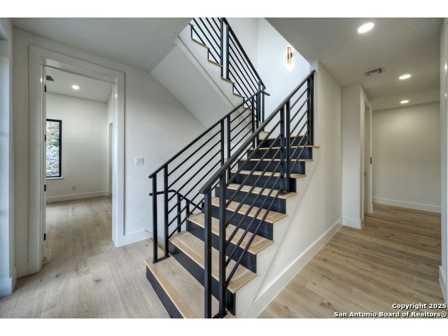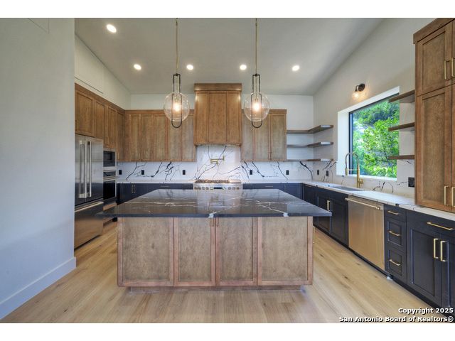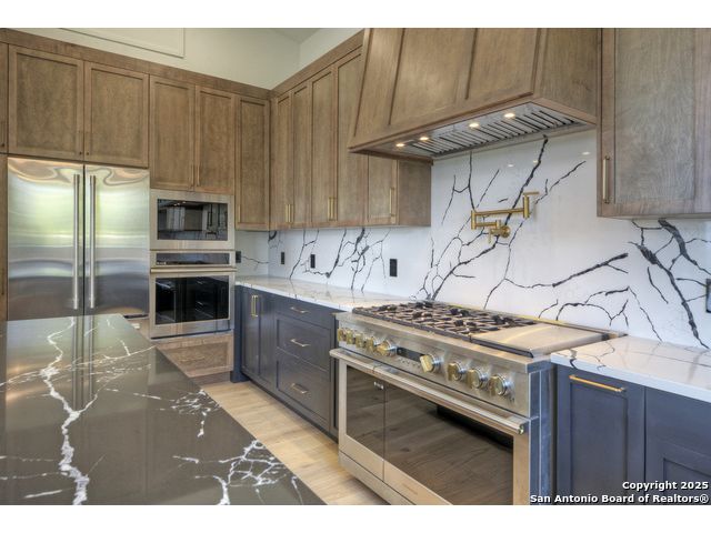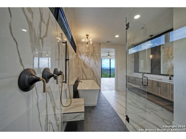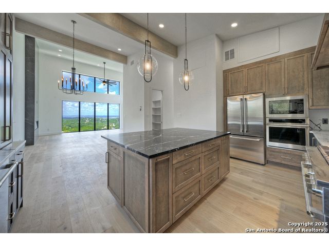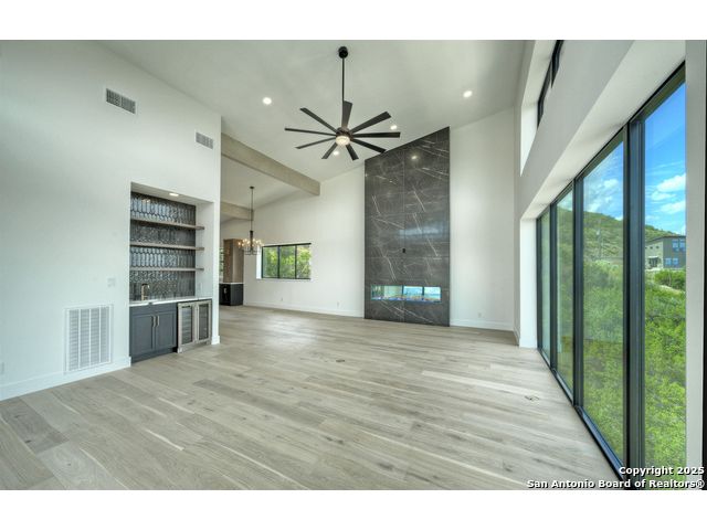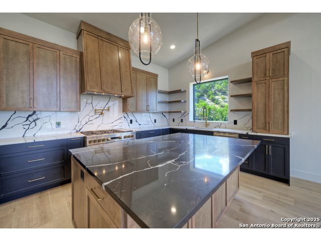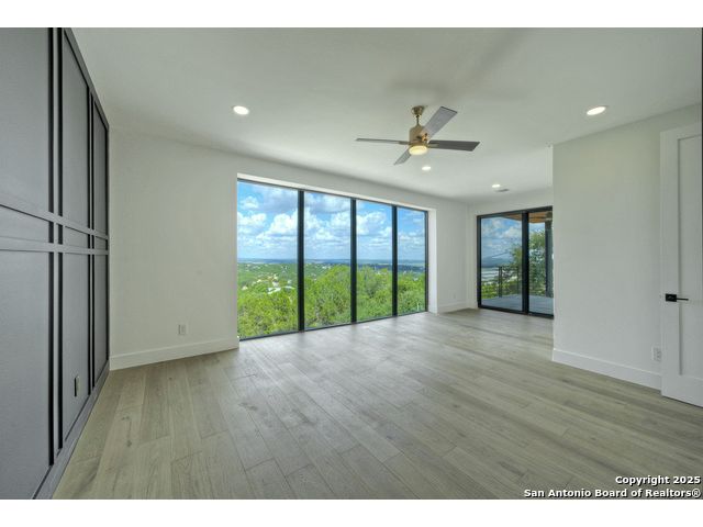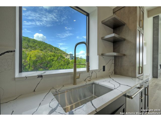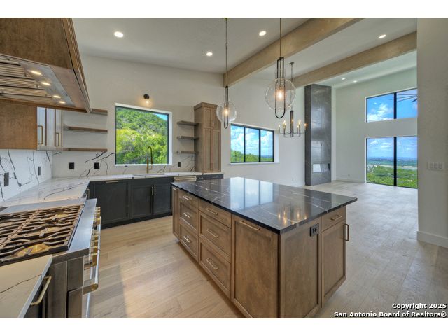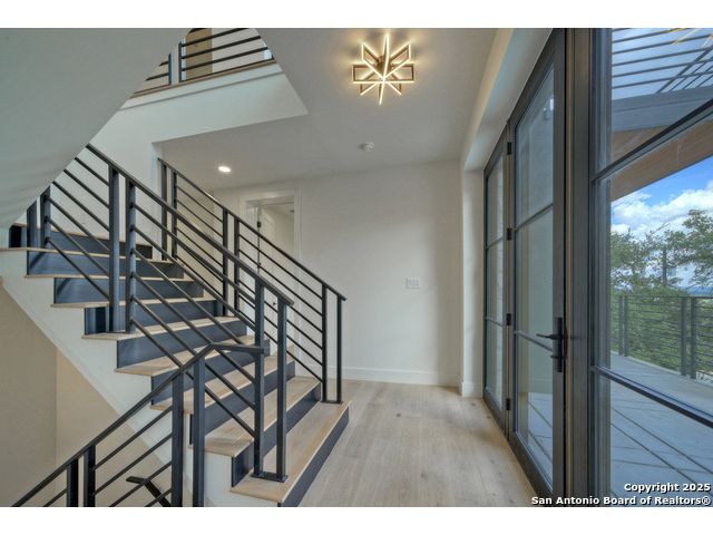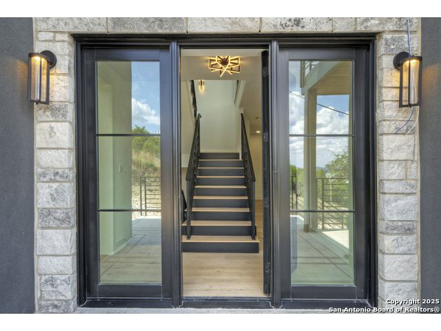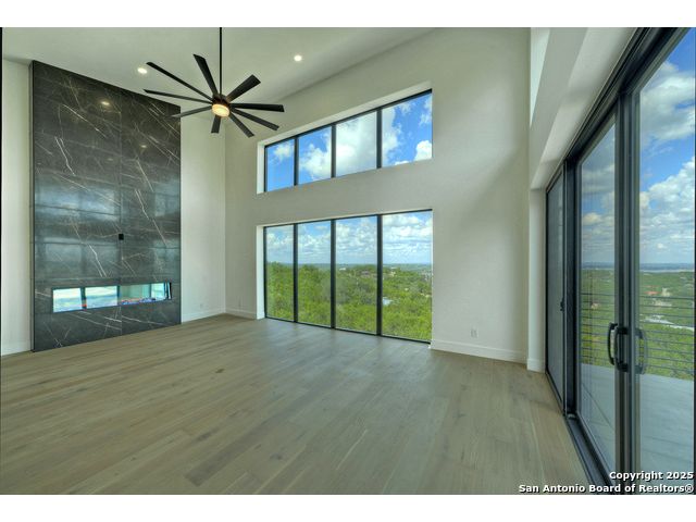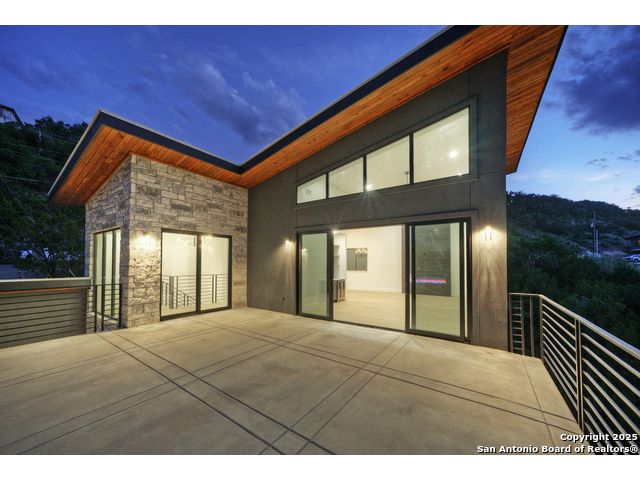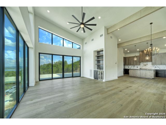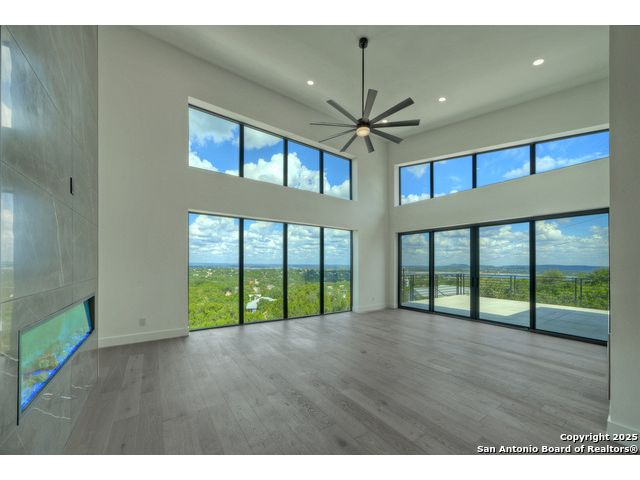Soaring high above the Texas Hill Country, this 4,000+ square foot custom estate offers breathtaking panoramic views of Canyon Lake from nearly every room. Built for luxury and designed to showcase the stunning natural surroundings, the property provides an exceptional blend of elegant indoor living and spectacular outdoor entertaining. The house is built with insulated concrete forms (ICF), which combines the strength of steel-reinforced concrete with the energy efficiency of foam insulation. A grand-scale, open-concept living area with soaring ceilings, fireplace, and a wall of floor-to-ceiling windows that perfectly frame the mesmerizing lake views. Wood floors flow throughout the main living spaces, reflecting the abundant natural light. Gourmet chef's kitchen featuring premium, professional-grade stainless steel appliances, custom cabinetry, and an oversized island with generous prep space and bar seating. The luxurious owner's retreat boasts floor-to-ceiling windows, a spa-style bathroom with a freestanding soaking tub and rainfall shower, walk-in closet with direct access to the laundry room, and a private balcony overlooking the water. A residential elevator provides effortless access to all levels of the expansive floor plan. Flexible bonus spaces that can be used as a home theater, a fitness room, safe room, wine cellar, or a dedicated home office, providing a customized experience for the discerning homeowner. Multiple expansive outdoor decks offer spectacular 360-degree vistas of the lake and rolling hills.