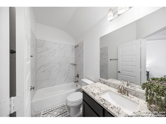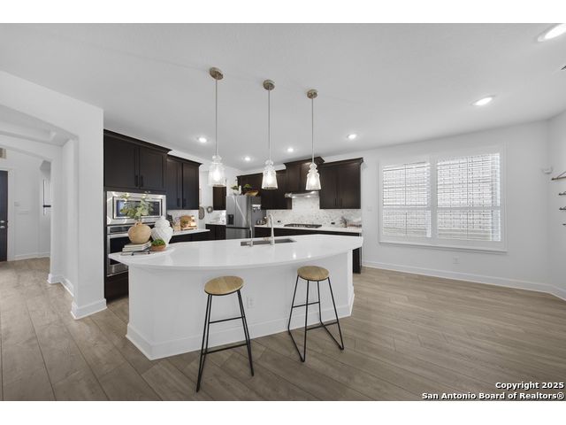 PRICED BELOW MARKET VALUE! This stunning home is move-in ready! Barely two years old and like new, this residence offers a modern touch with an open floor plan, four spacious bedrooms, three bathrooms, high-end finishes, high ceilings, luxury vinyl plank flooring, and builder upgrades. The home features elegant plantation shutters that enhance the windows, allowing for both natural light and privacy. The spacious two-car garage includes high ceilings and an installed garage door screen for added convenience that is unique. Downstairs, you'll find a private study/office with double French doors, a gorgeous kitchen with espresso cabinets, a large island, white Vicostone quartz countertops, and an elegant backsplash. Notably three bedrooms and two full bathrooms on this level. Upstairs, a spacious media room/loft, along with a fourth bedroom and a full bathroom, creates a perfect space for guests or a private retreat. The luxurious primary suite boasts a mudset shower and a freestanding tub, providing a spa-like experience at home. Outside, a covered patio offers an ideal spot for relaxation or entertaining. Located in a fantastic community with a pool and recreation center, this home is conveniently close to Boerne, New Braunfels, and San Antonio, with easy access to shopping, dining, golf courses, and highly desired Comal ISD schools. Come view this property and step into your dream lifestyle with this one-of-a-kind home. Now's your chance to make it yours!