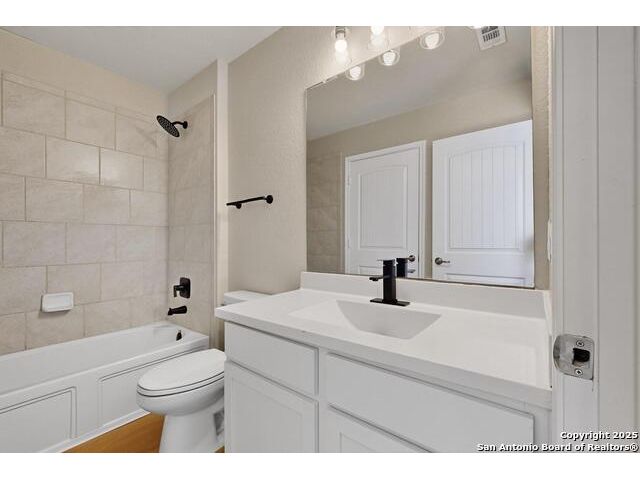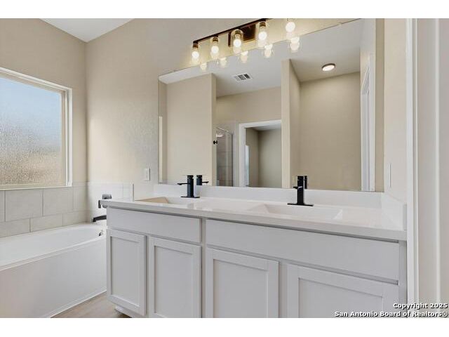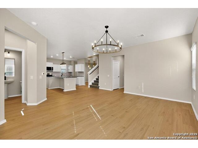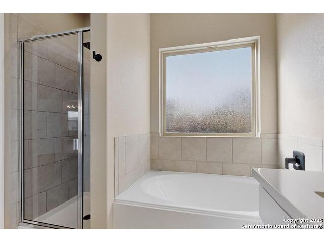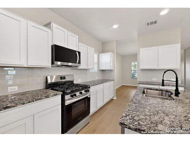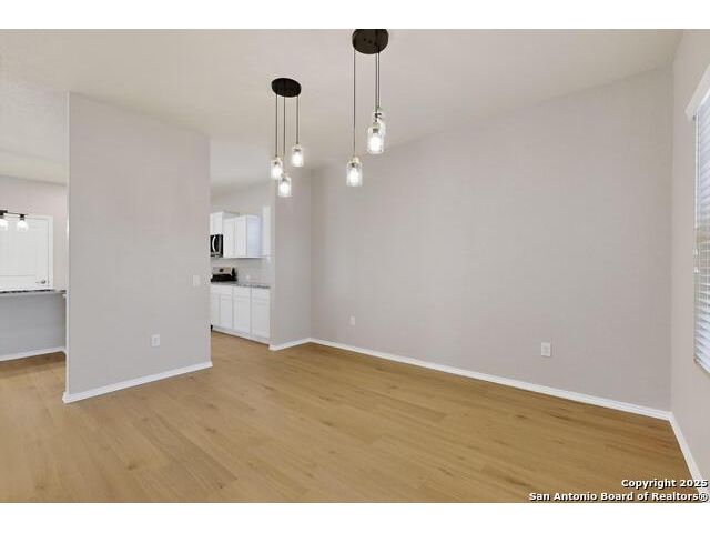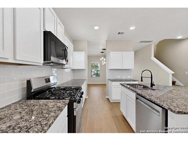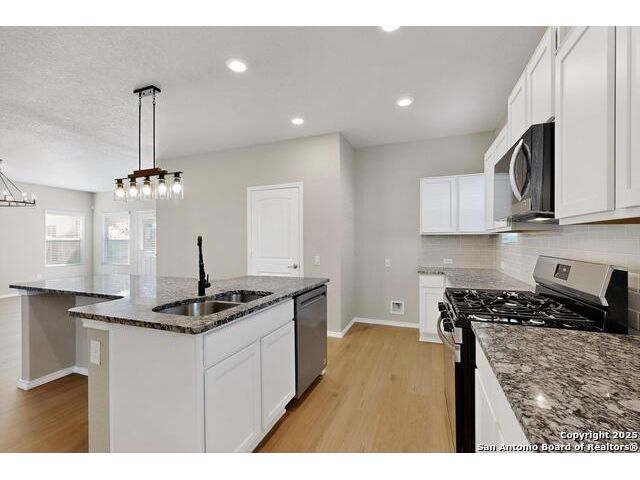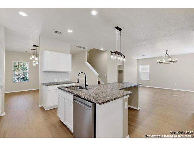 Move in ready home that has nice curb appeal, with that has been updated and has a lot to offer for the family! Updates include recent paint, updated light/plumbing fixtures, new door hardware, vinyl plank and new carpet for flooring. Near the entry has a flex area that could be extra dining or an office. Elegant modern kitchen with granite counters, stainless steel appliances, gas cooking, tiled backsplash and updated cabinets. Primary bedroom is downstairs with full bath having double vanity with separate garden tub and shower. Game room areas with large secondary bedrooms. Nice sized backyard for relaxing. With all the space this homes has to offer with a primary bedroom downstairs, makes this a great choice for you! Conveniently located near I-37, Loop 410, and TX-281, providing easy access to downtown San Antonio, shopping, and dining.