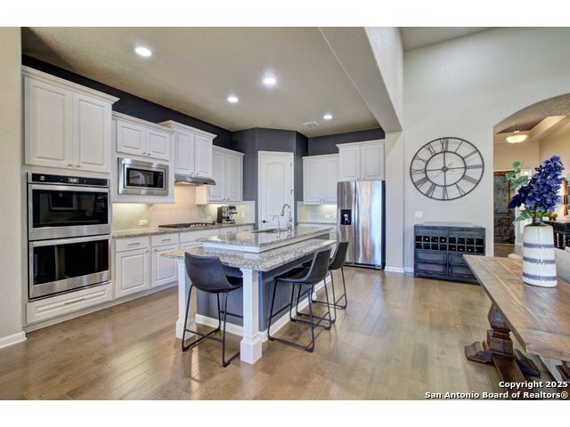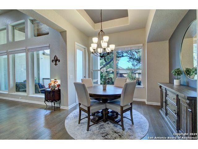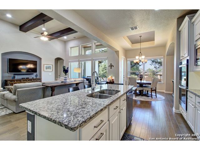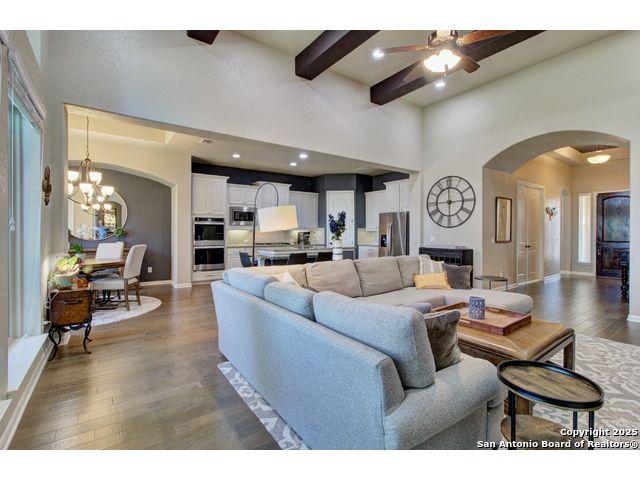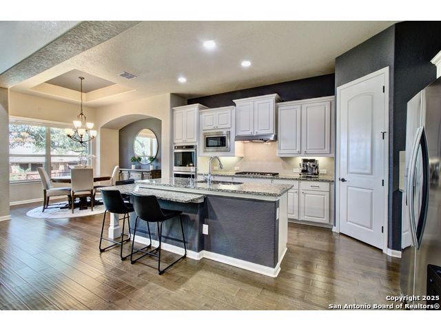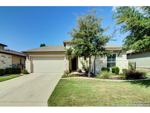 Beautifully maintained Sitterle 3BR/2BA single-story "lock and leave" home combining comfort, style, and convenience. Enjoy rich wood floors and a chef's kitchen with gas cooktop, double ovens, and built-in microwave. The split-level island invites gatherings, extending seamlessly to the dining and living areas for easy entertaining. Abundant cabinetry, a roomy pantry, and extra storage rooms keep everything neatly organized. The versatile third bedroom is ideal for an office or playroom. Step outside to a recently added stamped-concrete patio and spacious covered area-perfect for relaxing or hosting friends. Refrigerator, washer, and dryer convey. Yard mowing and front-bed mulching are included in the quarterly HOA fee, leaving you more time to enjoy home. Come see us today!