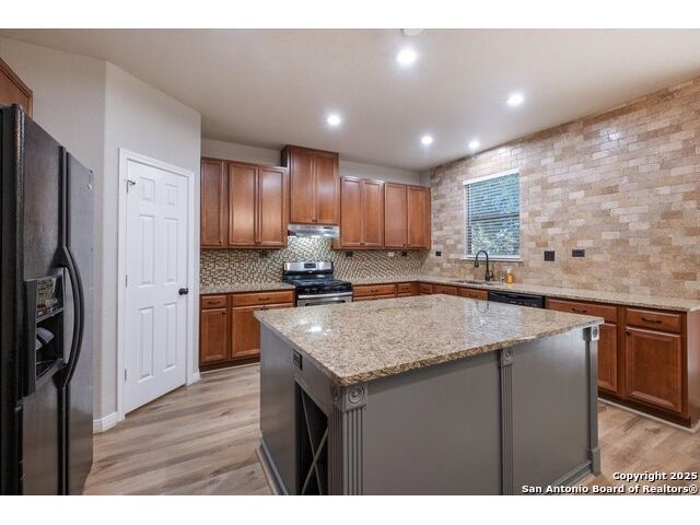 A Must See! Stunning Kitchen & Dream Backyard! This beautiful 3/2 home is most desirable model. Huge upstairs. game room/loft, gorgeous entry w/ paneled wainscoting & lam. wd. floors, spacious FR w/ custom built ins & mock FP, stunning kit. complete w/ lam. wd. floors, gas stove, wine cooler, walk in pantry, custom cabs. & island w/ granite, glass tile backsplash, tumbled stone walls, & under cab. lighting. Dream backyard w/ covered porch, flagstone patio, outdoor Fireplace & outdoor kitchen w/ granite. H2O