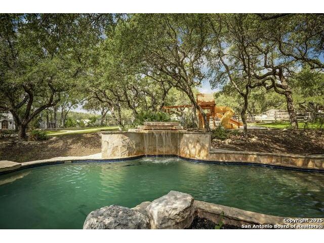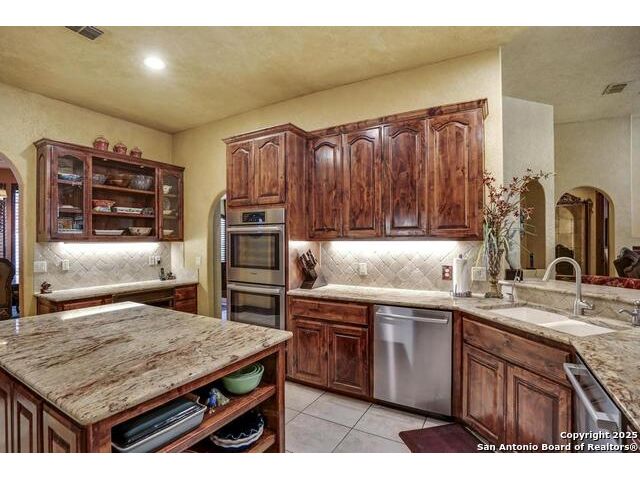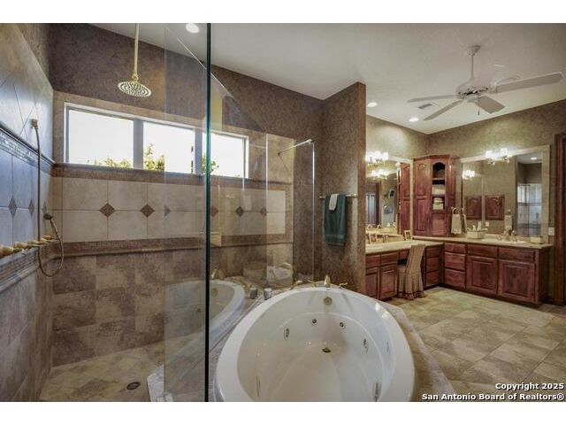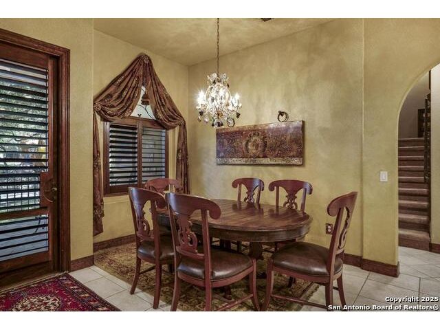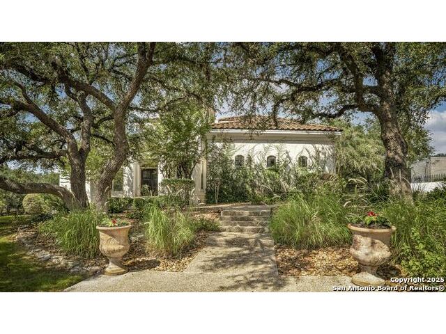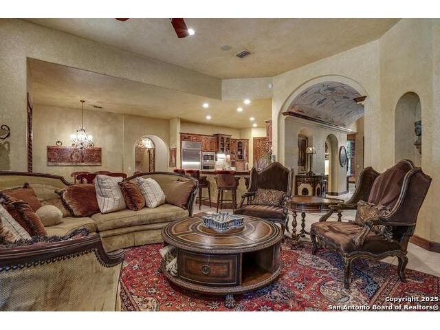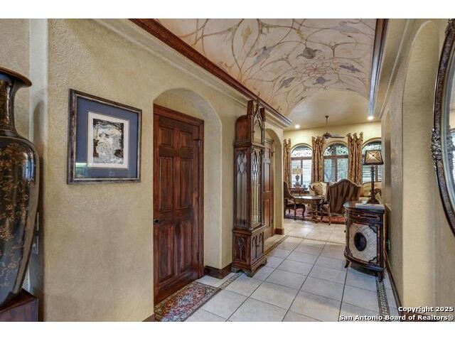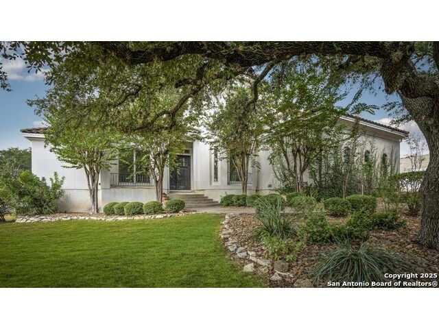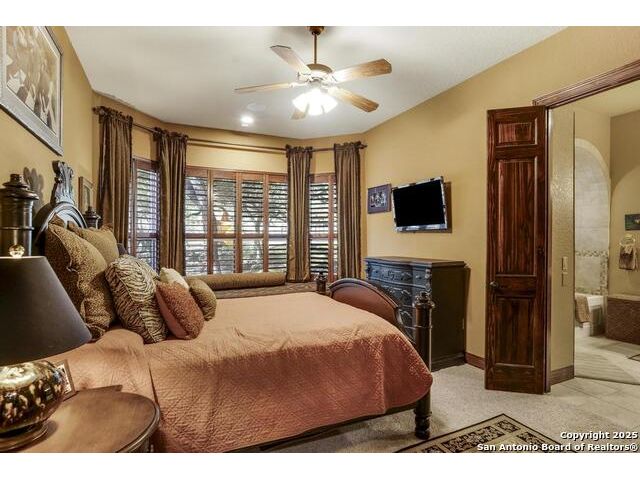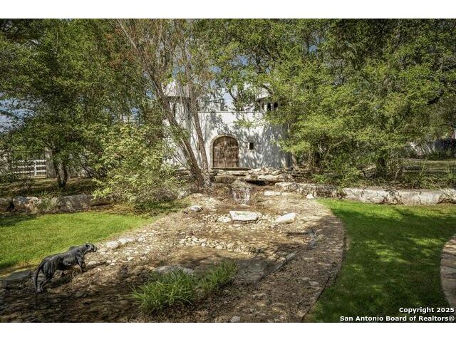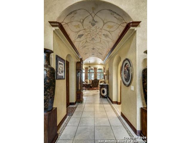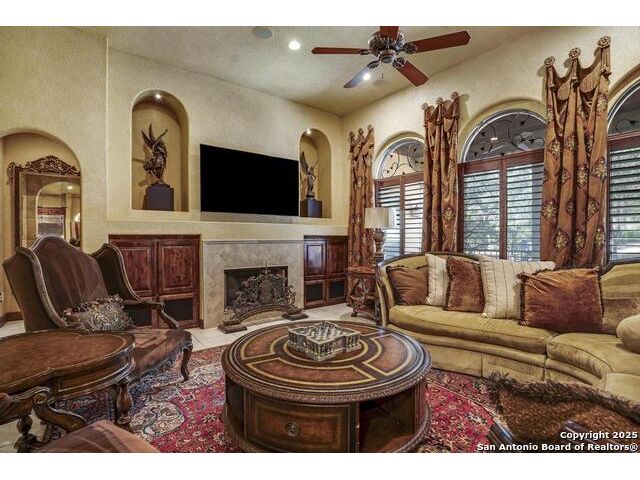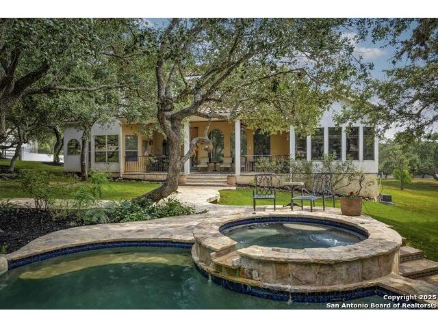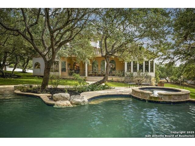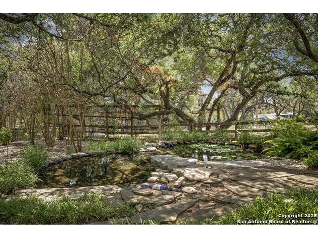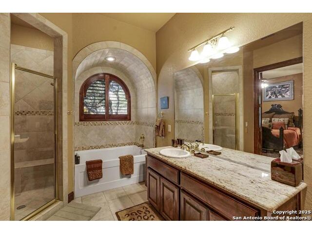 A masterful blend of elegance and comfort, this custom-designed home offers a spacious, thoughtfully crafted layout with elevated finishes throughout. Arched openings, custom lighting, plantation shutters, and fresco-accented ceilings bring timeless character to every room. Dual primary suites on the main level, one with patio access create a versatile floor plan, while upstairs offers two additional bedrooms and baths, a media room, and a game room. The main primary suite is a serene retreat with a sitting area, private patio access, and a spa-inspired bath featuring dual vanities, a freestanding tub, a glass enclosed walk-in shower, and two custom closets. The chef's kitchen impresses with a five-burner gas cooktop, granite counters, double ovens, dual dishwashers, a warming drawer, and a walk-in pantry, complemented by a wine room with additional chiller. Additional features include a hidden room, built-in vacuum system, surround sound inside and out, and a fully gated property with three access points. Outdoors, the home transforms into a private resort with a pool, spa, waterfall bench, beach entry, outdoor kitchen, children's playscape, basketball court, and koi ponds connected by natural streams. The extended covered patio includes ceiling fans and a misting system for year-round comfort. An oversized three-car garage with built-in shelving adds ample storage. Set behind private gates in a small community near top-rated schools and major thoroughfares, this home delivers the perfect balance of sophistication, functionality, and resort-style living.
