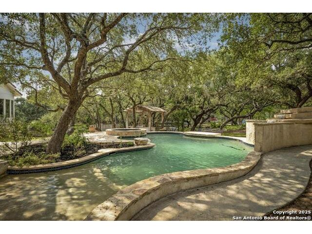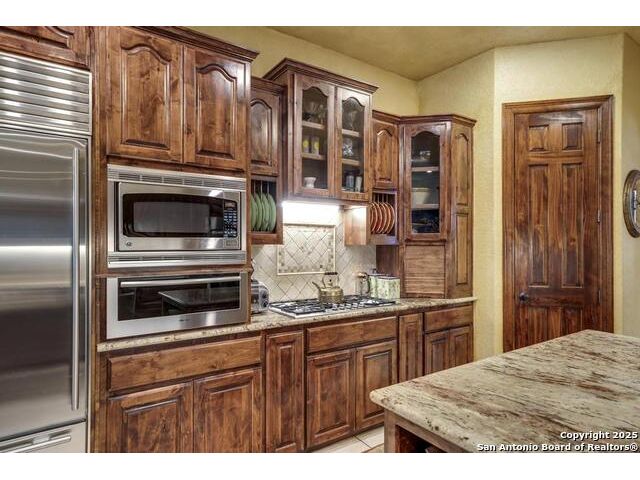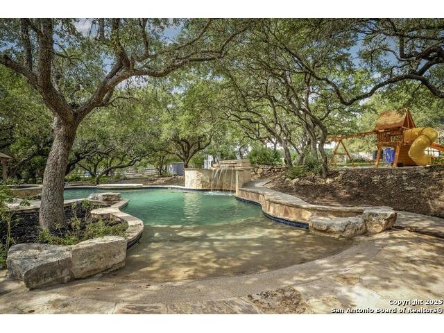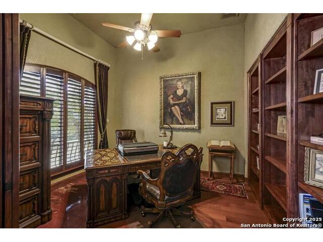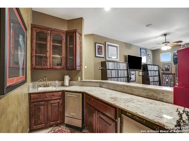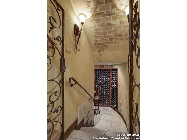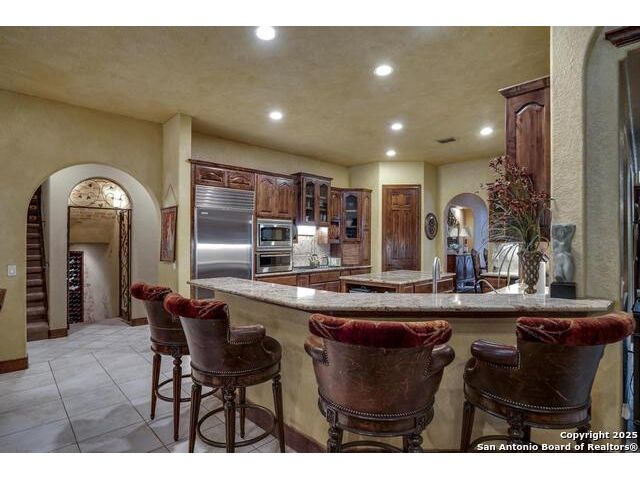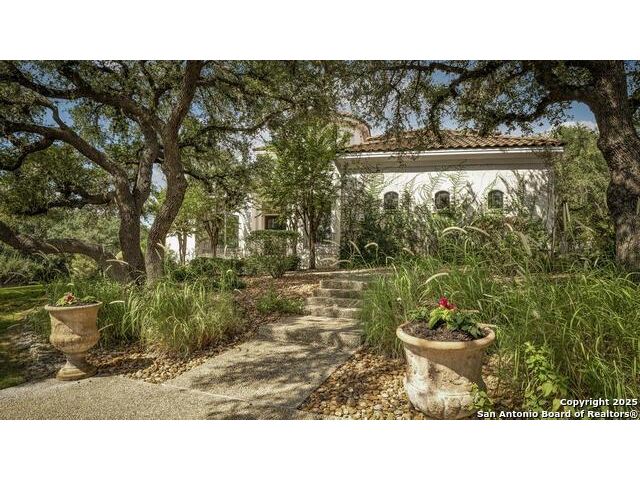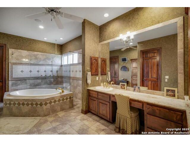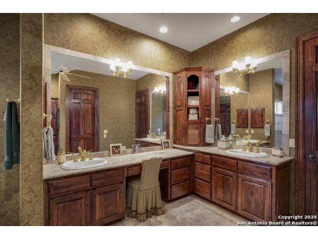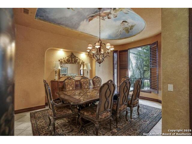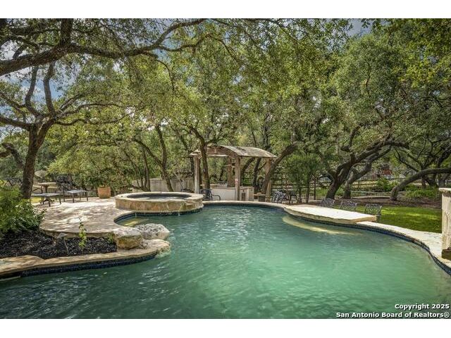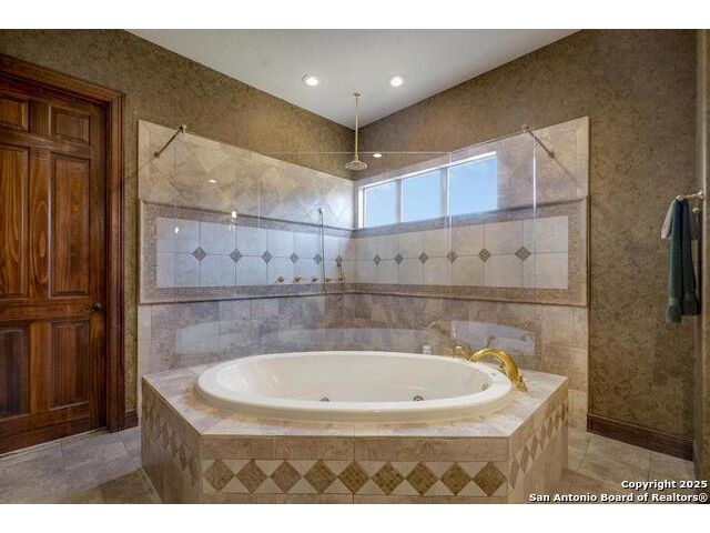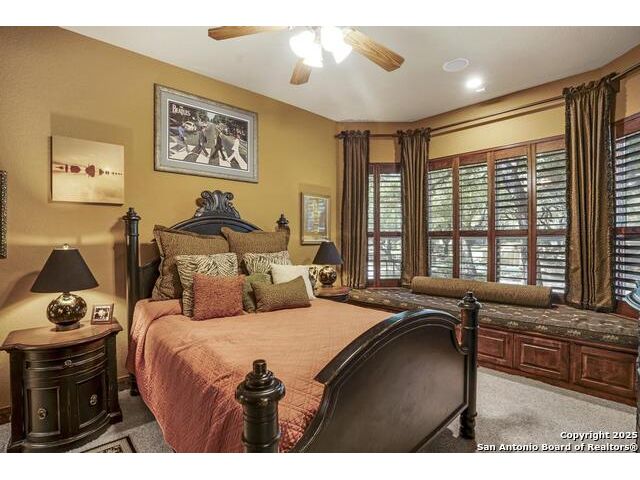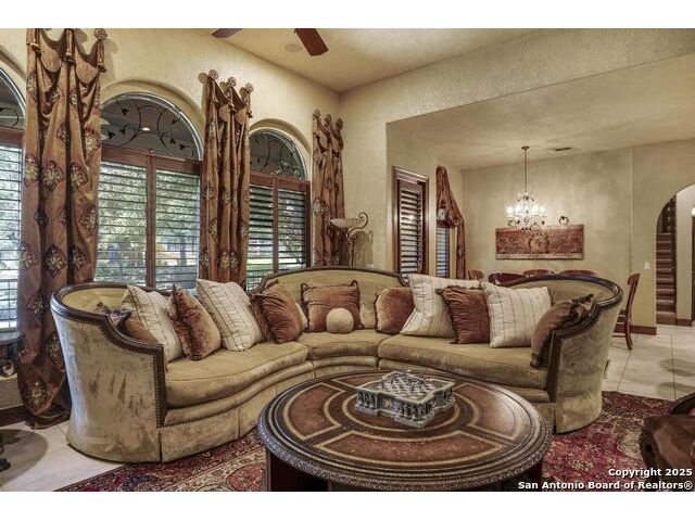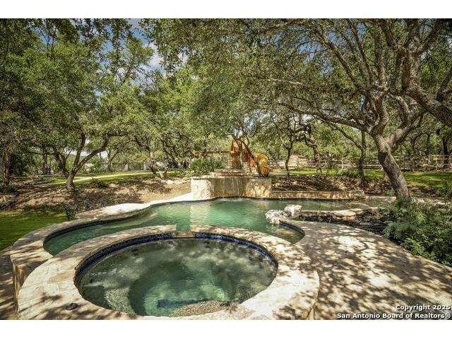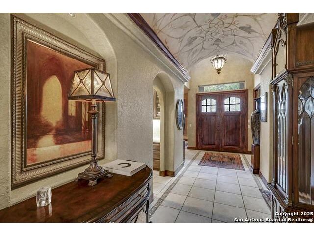 A masterful blend of elegance and comfort, this custom-designed home offers a spacious, thoughtfully crafted layout with elevated finishes throughout. Arched openings, custom lighting, plantation shutters, and fresco-accented ceilings bring timeless character to every room. Dual primary suites on the main level, one with patio access create a versatile floor plan, while upstairs offers two additional bedrooms and baths, a media room, and a game room. The main primary suite is a serene retreat with a sitting area, private patio access, and a spa-inspired bath featuring dual vanities, a freestanding tub, a glass enclosed walk-in shower, and two custom closets. The chef's kitchen impresses with a five-burner gas cooktop, granite counters, double ovens, dual dishwashers, a warming drawer, and a walk-in pantry, complemented by a wine room with additional chiller. Additional features include a hidden room, built-in vacuum system, surround sound inside and out, and a fully gated property with three access points. Outdoors, the home transforms into a private resort with a pool, spa, waterfall bench, beach entry, outdoor kitchen, children's playscape, basketball court, and koi ponds connected by natural streams. The extended covered patio includes ceiling fans and a misting system for year-round comfort. An oversized three-car garage with built-in shelving adds ample storage. Set behind private gates in a small community near top-rated schools and major thoroughfares, this home delivers the perfect balance of sophistication, functionality, and resort-style living.