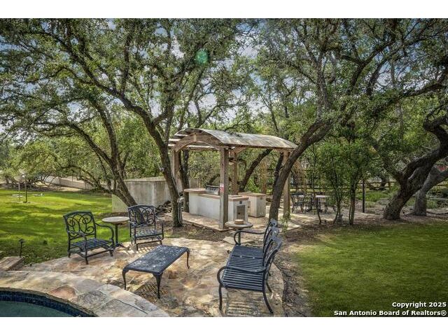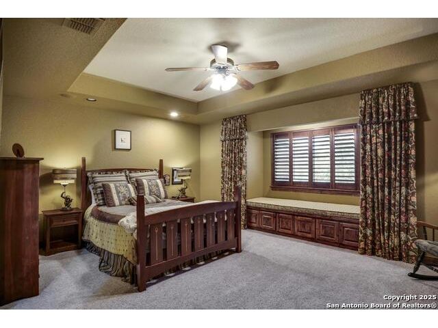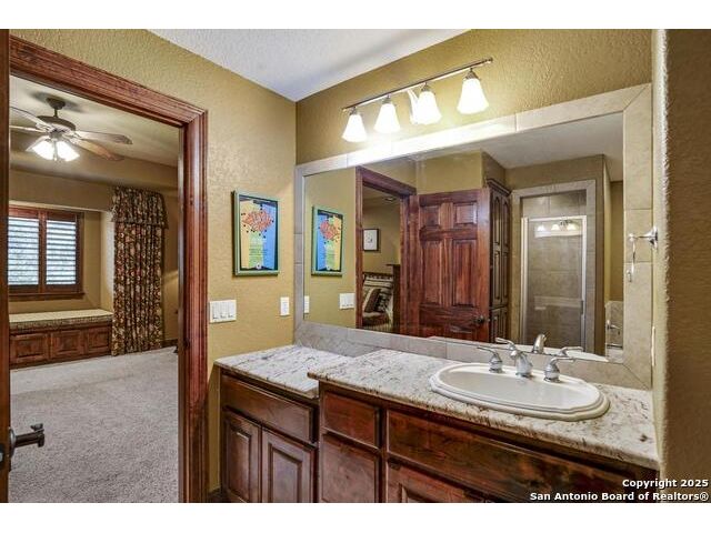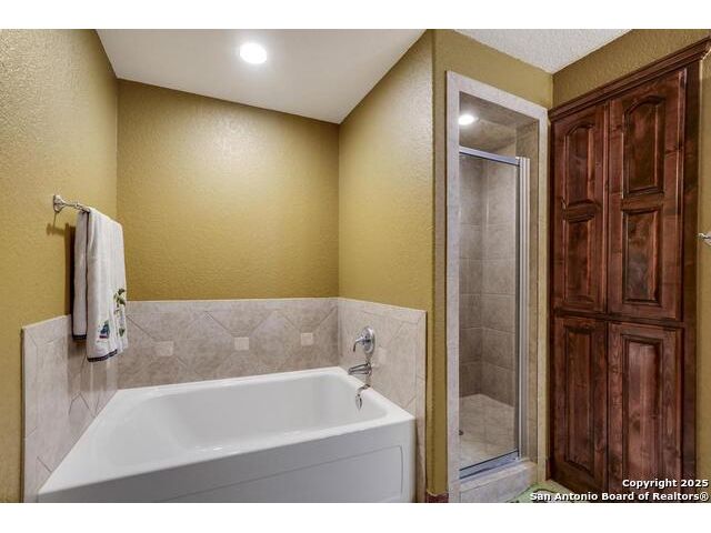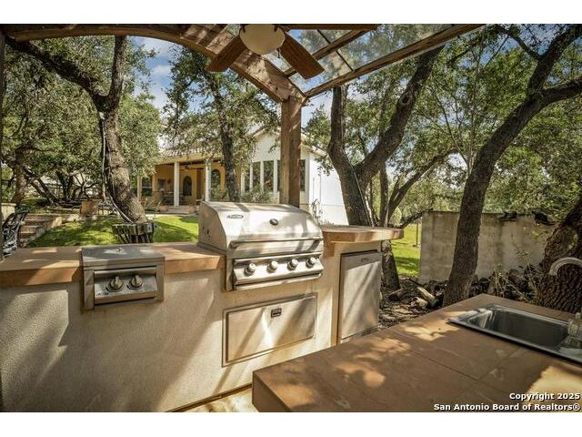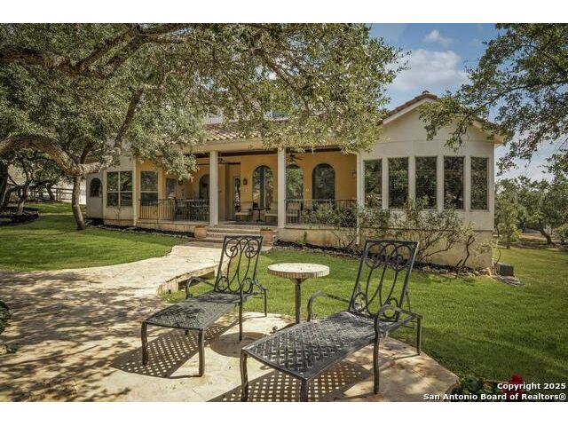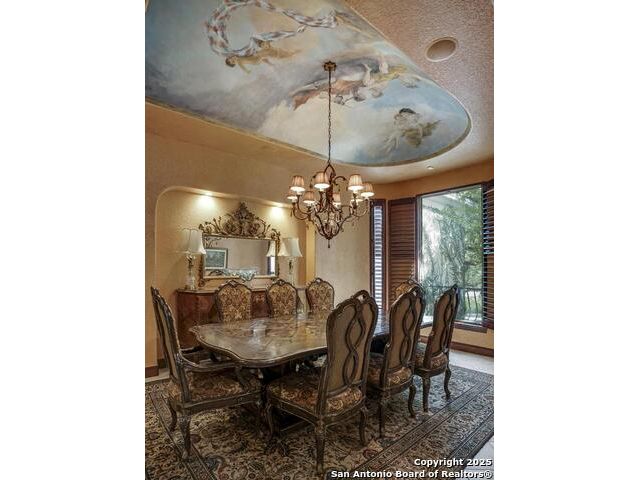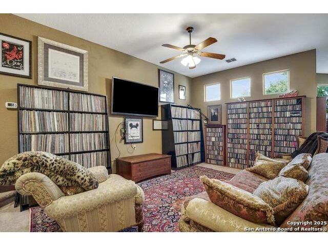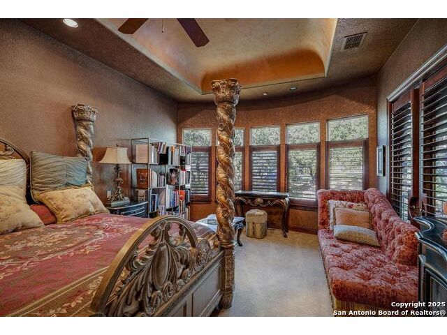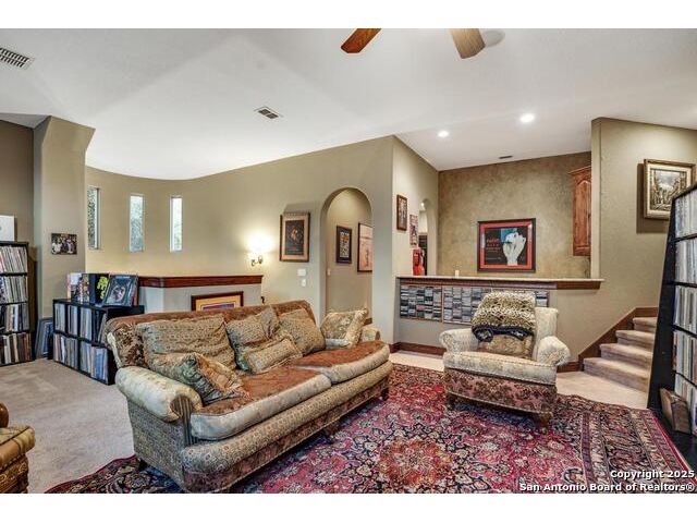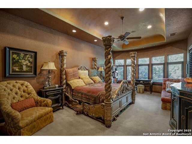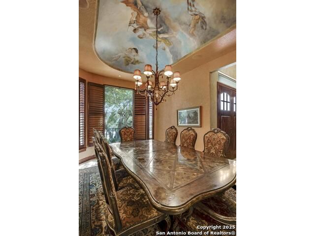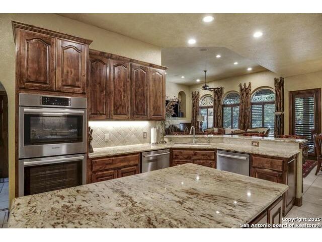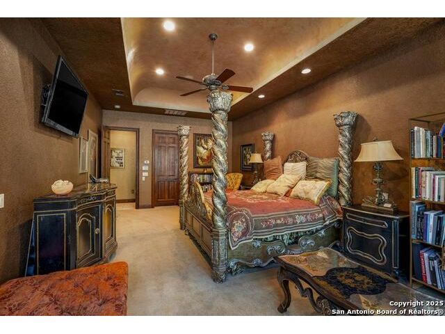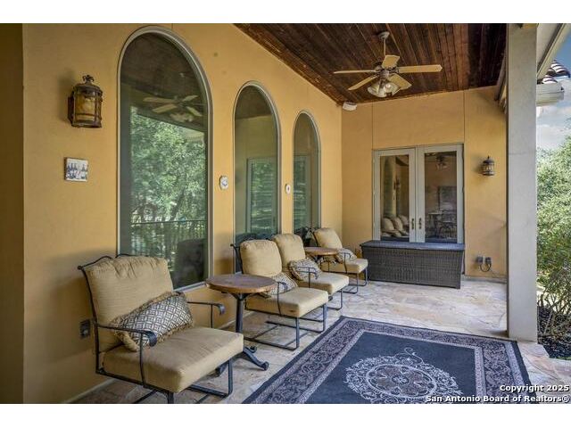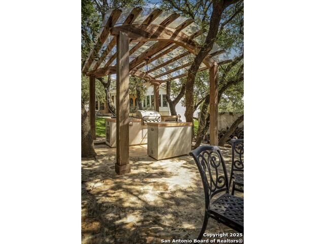 A masterful blend of elegance and comfort, this custom-designed home offers a spacious, thoughtfully crafted layout with elevated finishes throughout. Arched openings, custom lighting, plantation shutters, and fresco-accented ceilings bring timeless character to every room. Dual primary suites on the main level, one with patio access create a versatile floor plan, while upstairs offers two additional bedrooms and baths, a media room, and a game room. The main primary suite is a serene retreat with a sitting area, private patio access, and a spa-inspired bath featuring dual vanities, a freestanding tub, a glass enclosed walk-in shower, and two custom closets. The chef's kitchen impresses with a five-burner gas cooktop, granite counters, double ovens, dual dishwashers, a warming drawer, and a walk-in pantry, complemented by a wine room with additional chiller. Additional features include a hidden room, built-in vacuum system, surround sound inside and out, and a fully gated property with three access points. Outdoors, the home transforms into a private resort with a pool, spa, waterfall bench, beach entry, outdoor kitchen, children's playscape, basketball court, and koi ponds connected by natural streams. The extended covered patio includes ceiling fans and a misting system for year-round comfort. An oversized three-car garage with built-in shelving adds ample storage. Set behind private gates in a small community near top-rated schools and major thoroughfares, this home delivers the perfect balance of sophistication, functionality, and resort-style living.