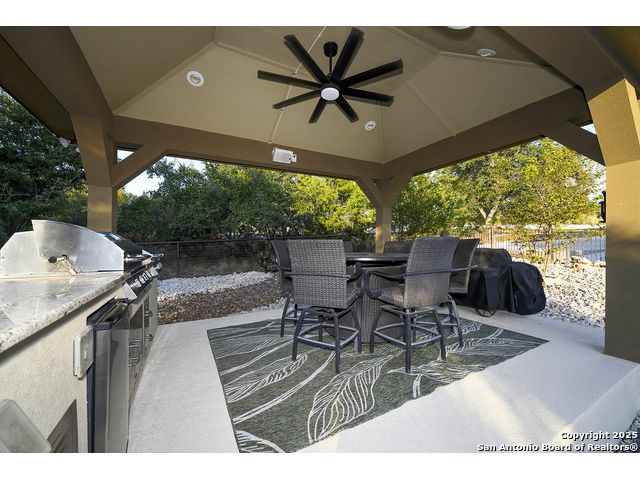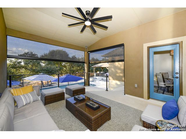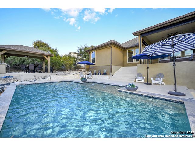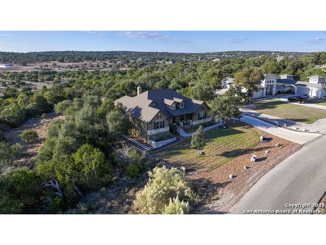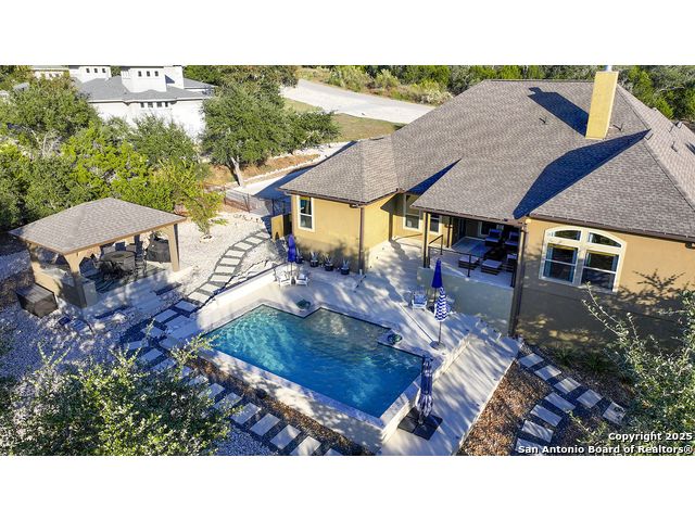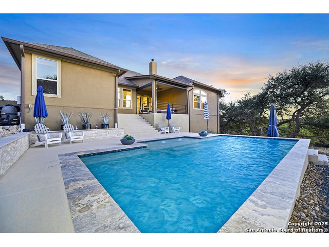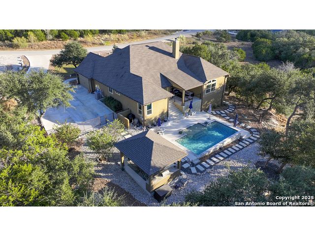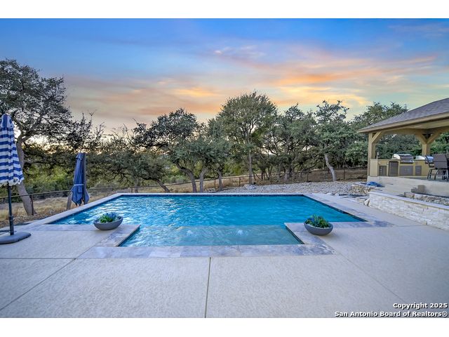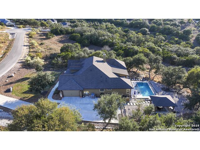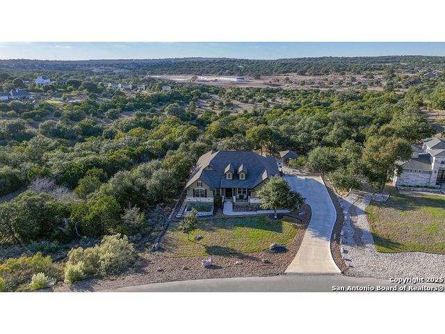 Discover the best of Hill Country living in this stunning 4-bedroom, 3.5-bath home nestled on a serene 1.01-acre cul-de-sac lot in the prestigious Vintage Oaks community. Built in 2017, this 3,038 sq. ft. residence blends timeless comfort with modern elegance, featuring newly installed carpet, upgraded modern lighting, and a flexible floor plan ideal for entertaining. This spacious interior home, includes a versatile flex room, open-concept living spaces, and a two-car garage with an extended tandem area outfitted with wall-to-wall storage cabinets and a custom workshop setup. Gorgeous mature oaks frame the property, enhancing the home's curb appeal and natural privacy. The outdoor space, offers your own private oasis, an entertainer's dream with a heated pool featuring ambient lighting, motorized drop shades, a fully equipped outdoor kitchen with lighting and mounted Bluetooth speakers, and breathtaking greenbelt views that capture the essence of Hill Country tranquility it's the ideal retreat for peaceful evenings or weekend gatherings. As a resident of Vintage Oaks, you'll have access to unmatched resort-style amenities including multiple pools with a lazy river, a beautifully designed Tuscan-style clubhouse, a state-of-the-art fitness center, sports courts, and scenic trails meandering throughout the community's rolling landscape. Experience serene luxury living with the convenience of being just minutes from downtown New Braunfels, Gruene, Canyon Lake, and major city destinations. This home offers the perfect balance of nature, sophistication, and community. Come love where you live in Vintage Oaks! **Please note that behind the cabinets, beneath the cooktop stove, the area is trimmed and configured for propane use.