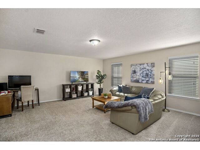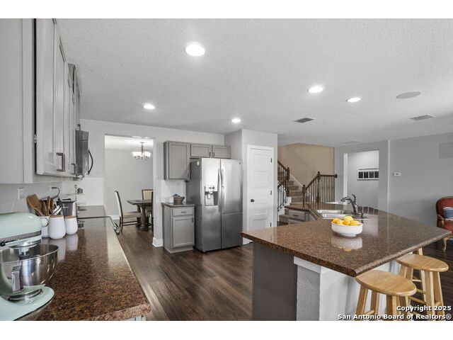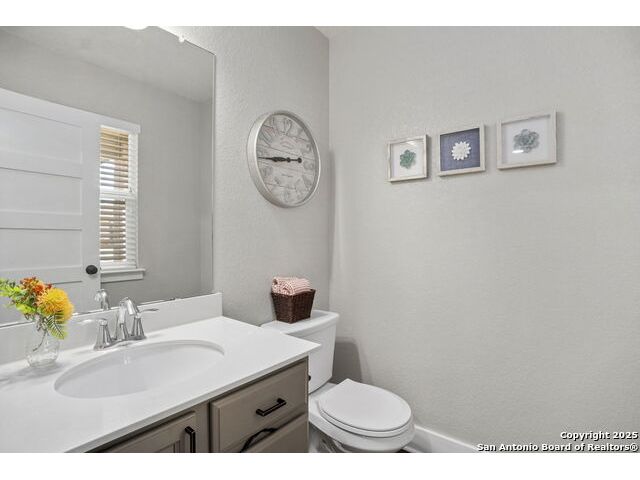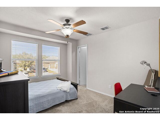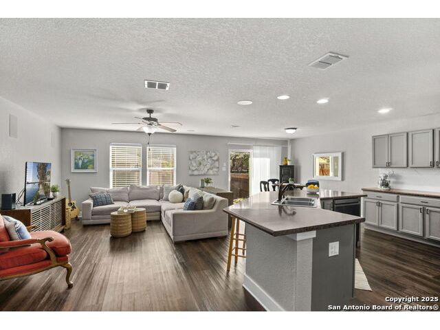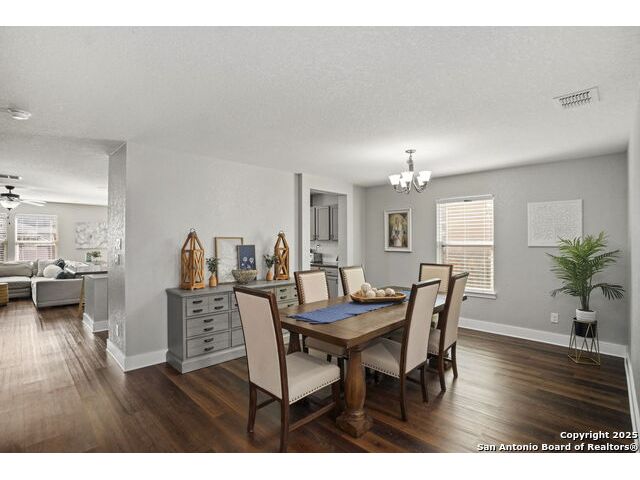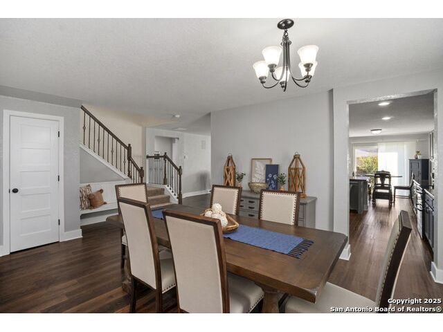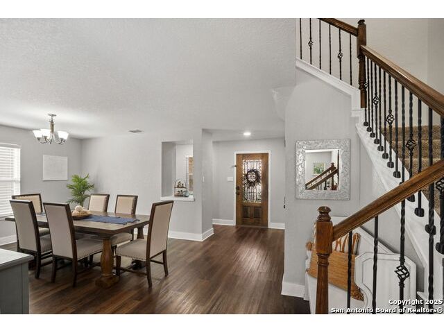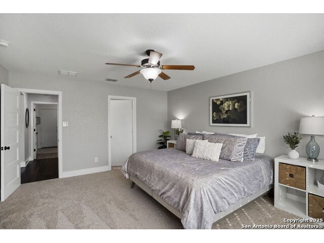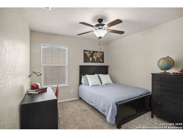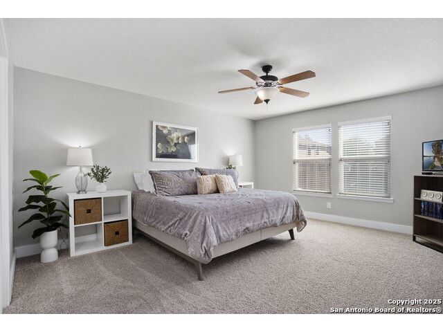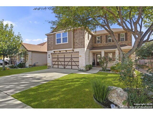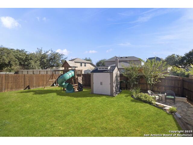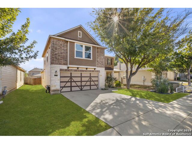 Most popular floor plan in the neighborhood with the primary bedroom downstairs. Home is in great condition and has been conscientiously maintained. Many recent upgrades to include interior paint, flooring in primary bedroom and bath and landscaping. Game room upstairs with secondary bedrooms, all with walk in closets. Additional features include ceiling fans throughout, wired for surround sound, and attic storage. Fully fenced backyard with play structure and shed that stays! Owner is offering a one year home warranty plan through Fidelity National Home Warranty. Community features include large neighborhood pool and splash pad, covered playground, basketball court, walking trail to Cibolo Nature Center and Boerne City Park. Home is walking distance to elementary and high schools.