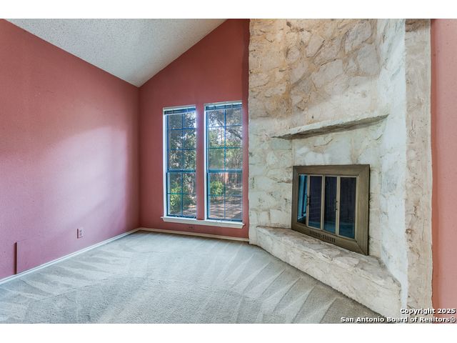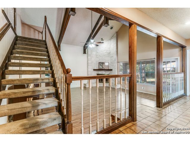 OPEN HOUSE - SUNDAY DEC. 7TH - 1:00 PM - 3:00 PM. Charming 2 story on a cul-de-sac lot. Unique floorplan with two large living areas, one up and one downstairs. All bedrooms are located on the main level. The downstairs living area has a cathedral ceiling and corner fireplace with a gas starter, accented with floor to ceiling limestone rock. The primary suite has a sitting area with a fireplace plus outside access. The primary bath has double vanity, walk-in closet and a spacious shower/tub. The upstairs living area is quite large with bead board ceiling. Kitchen has tile countertops, refrigerator, microwave, and a smooth cooktop range. Extended patio, overlooking the beautiful backyard, is perfect for your patio set and grill. Additional feature is a storage shed on a slab. Irregular shaped lot with over a quarter of an acre and mature trees. Top notch NEISD schools with the elementary and middle schools within walking distance.