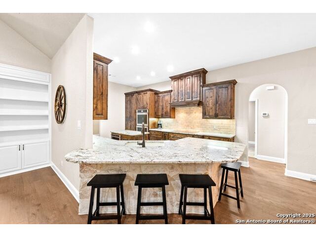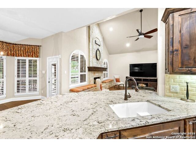Welcome to your next chapter of Homeownership, where this Impeccable Ranch Style Gem is truly a dream come true in the heart of TX, crafted to perfection with incredible upgrades and sitting on a spacious 1.39 acre lot in the sought-after Los Reyes Canyons, a gated community in Helotes, TX, this home is breathtaking throughout. Every inch has been thoughtfully updated with modern and timeless charm. Inside, you'll find an open concept layout filled with natural light and soaring ceilings, perfect for both everyday living and entertaining. The sleek remodeled kitchen is a chef's dream, boasting custom cabinetry- elegant wood, beautiful solid countertops and top of the line JennAir appliances, an induction cooktop and a convection oven, all opening up to the main living area for that seamless flow. The primary suite is a true retreat, featuring a luxury designed walk-in closet, spa inspired ensuite bathroom where you can indulge/relax in the freestanding soaking tub, oversized walk-in shower with custom tile work, dual vanities, and stylish mirrors that add both function and flair. As an added benefit, you will find a large living area upstairs that offers endless possibilities, it can be a media room, home office, exercise room, or even another bedroom as it has a closet- flawlessly customizable to suit your lifestyle. A highlight and quite possibly one of owners favorite parts of this stunning home is the not one, but two outdoor living spaces, you have the spacious screened-in back porch, perfect for year round enjoyment/relaxation and the massive main patio, truly an entertainer's dream overlooking the incredible views, heavily treed/ park-like backyard, with a peaceful, soothing and tranquil atmosphere, lush landscaping and a serene water feature all designed with you in mind, making these outdoor living spaces your own private retreat and transforming ordinary days into luxurious experiences. Ideally located just minutes from Downtown Helotes, this home offers convenient access to local shops, restaurants and major attractions like La Cantera and The Rim. Don't miss out, schedule your private showing TODAY.