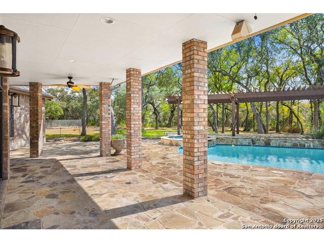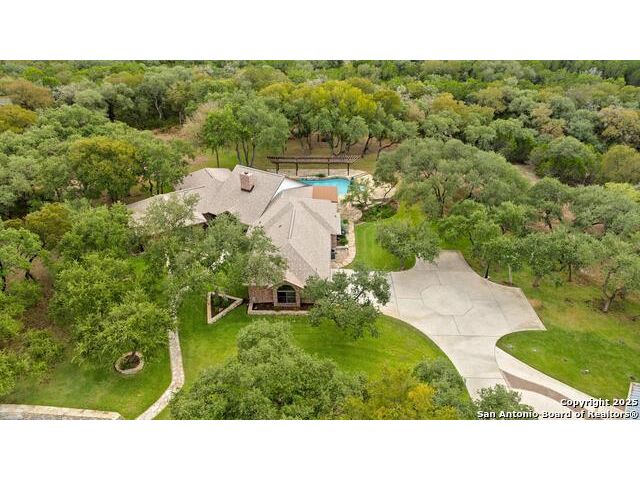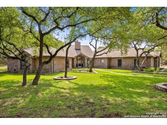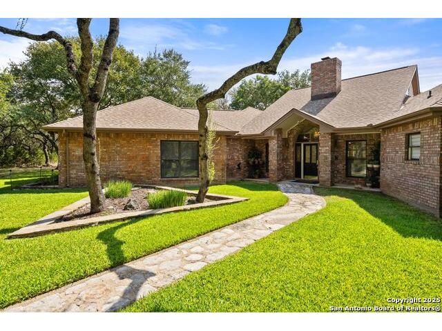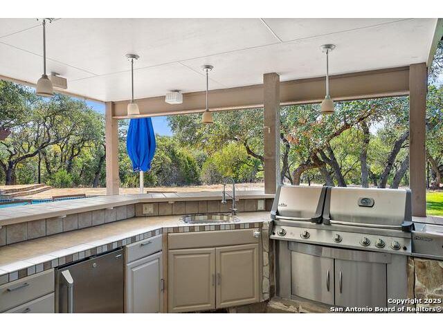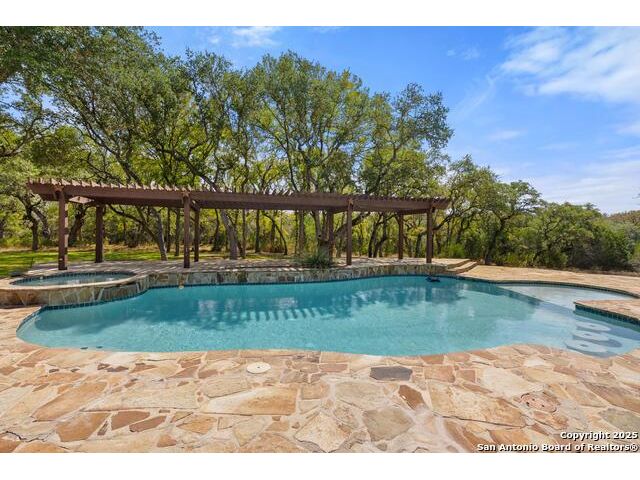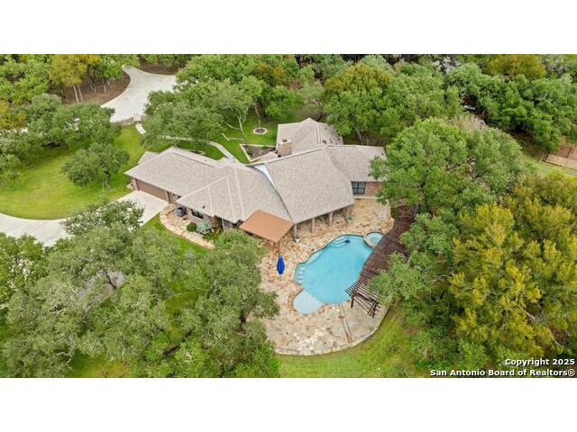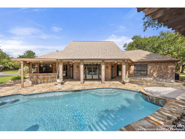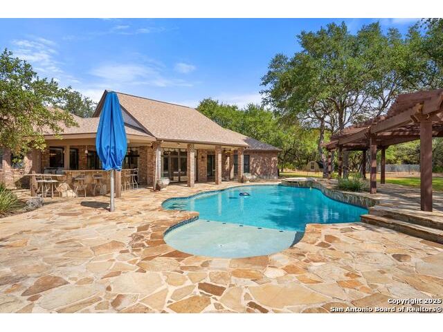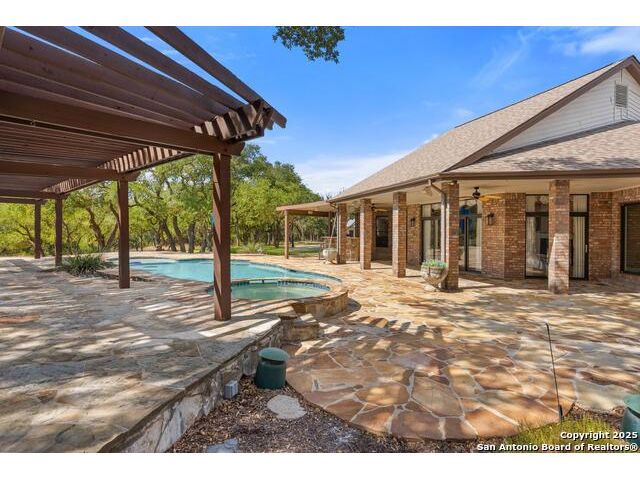 Tucked away on 5 acres surrounded by mature trees and native Hill Country beauty, this 2018-remodeled retreat perfectly balances everyday comfort with resort-style outdoor living. With a recently installed roof (Aug. 2025) and neighborhood access to the Guadalupe River for fishing, kayaking, and floating, it's designed for those who live life outdoors. Spend your days soaking in the pool's spa and splash pad, relaxing beneath the pergola, or firing up the grill in the fully equipped outdoor kitchen-every corner invites you to slow down and savor the moment. As evening falls, gather under twinkling lights while the sounds of nature set the tone. Inside, light fills an open layout designed for connection. The kitchen shines with quartz counters, built-in WOLF appliances, a Sub-Zero fridge, dual ovens and dishwashers, and a large island that draws everyone together. A formal dining room and wet bar make entertaining effortless, while the expansive living area flows through sliding doors onto the covered patio-creating a seamless indoor-outdoor experience. The owner's suite offers a peaceful escape with poolside access, dual vanities, a spa-inspired shower, and two walk-in closets. A generous guest suite with en suite bath, plus an additional bedroom and a private office nook, ensure everyone has a space to unwind. Just minutes from the Guadalupe River and historic Gruene, this property embodies Hill Country living-laid-back luxury and adventure rolled into one.