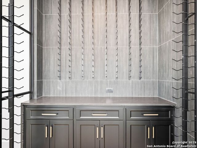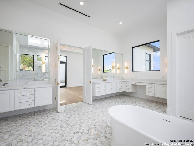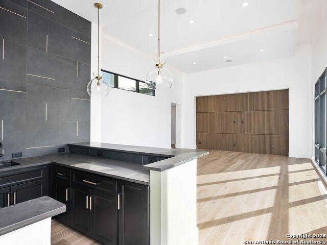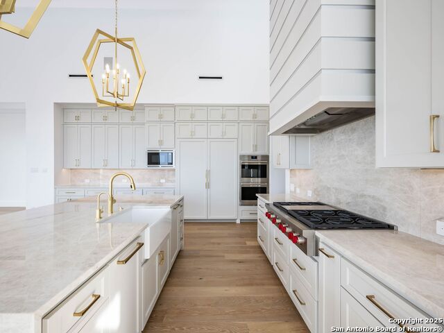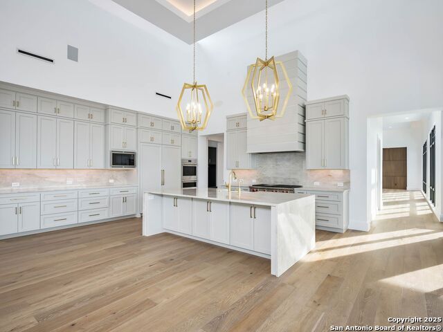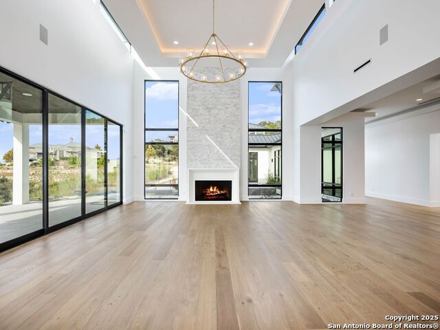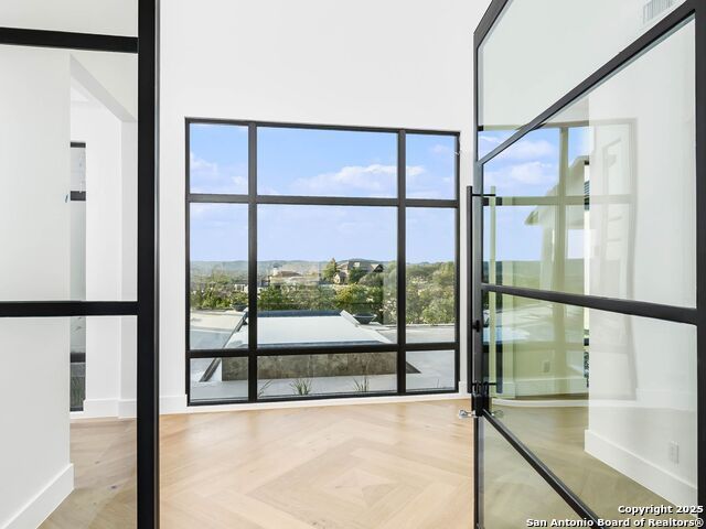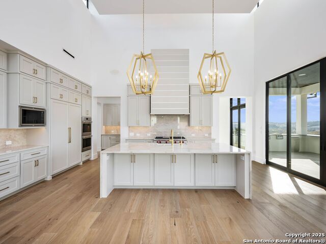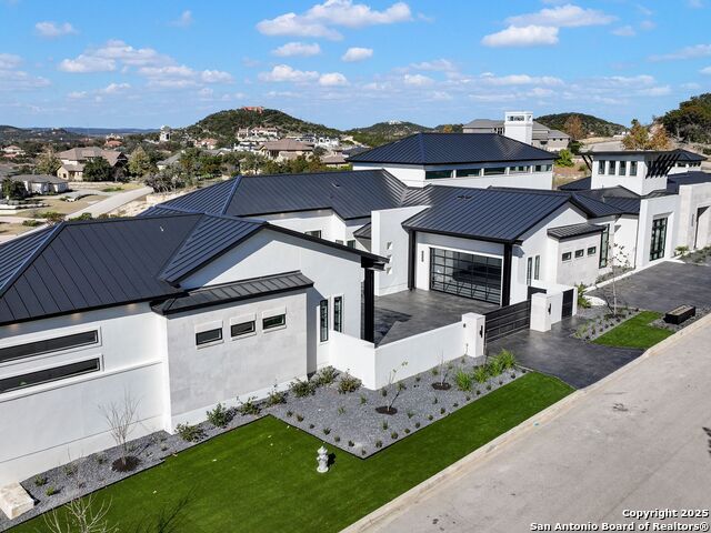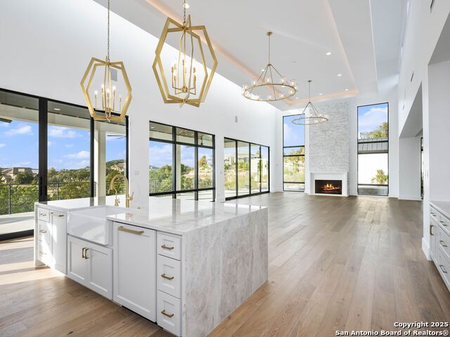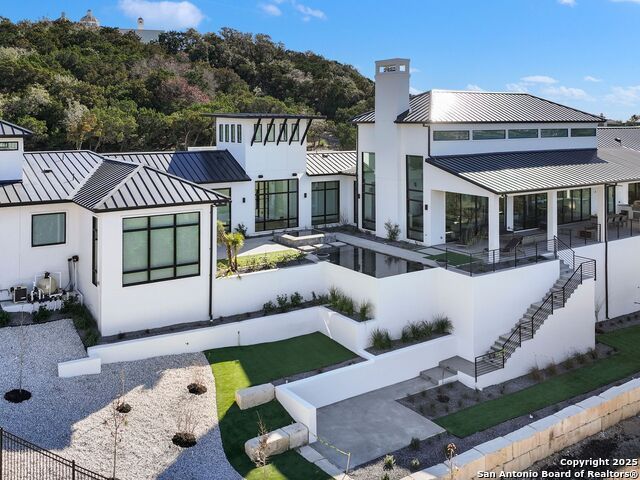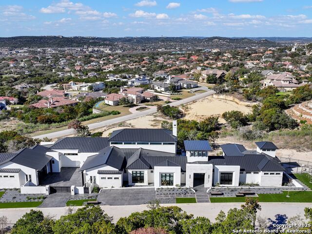 A striking transitional estate positioned along an exclusive cul-de-sac street within The Dominion, offering spectacular panoramic views and exceptional privacy. Walls of floor-to-ceiling glass fill the interiors with natural light, accentuating the home's remarkable craftsmanship and curated finishes. Designed on an impressive scale with soaring ceilings and verdant vistas, the interior showcases European white oak floors, smooth-finish walls, architectural ceiling details, designer lighting, and exquisite stone and marble selections throughout. The chef's kitchen features professional-grade stainless steel appliances and an oversized island that opens seamlessly to the family room, where soaring two-story ceilings and a stone-clad gas fireplace create an atmosphere of grandeur and warmth. The primary suite is a true sanctuary, offering patio access for morning coffee or evening relaxation, dual spa-like baths with separate vanities, and two custom-fitted closets with glass display cabinetry. Three spacious guest bedrooms each feature en-suite baths, while an expansive game room with a full wet bar provides an ideal setting for entertaining. Outdoors, a large covered patio with a full kitchen overlooks the resort-style pool and spa framed by sweeping Hill Country views. A four-car side-entry garage with epoxy-finished floors is complemented by an additional two-car garage and generous guest parking. Every element of this residence reflects thoughtful design and timeless luxury.