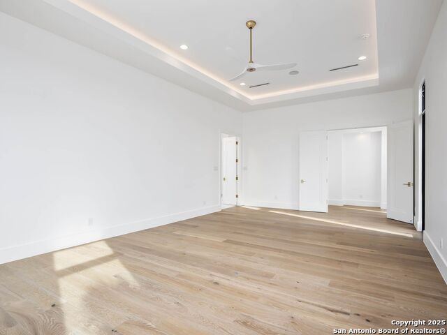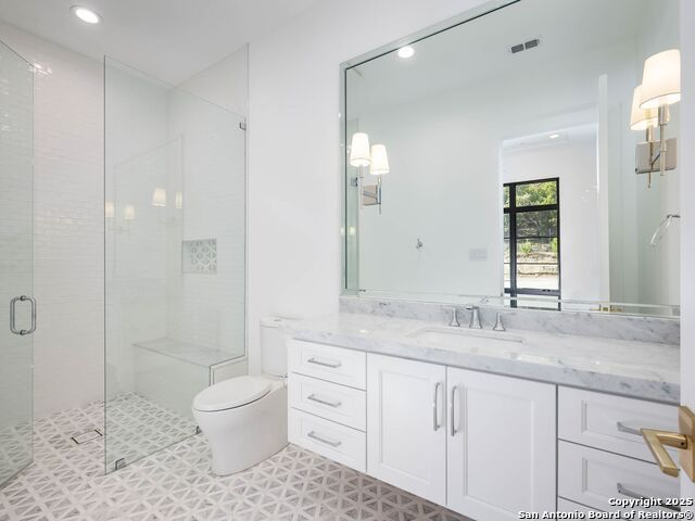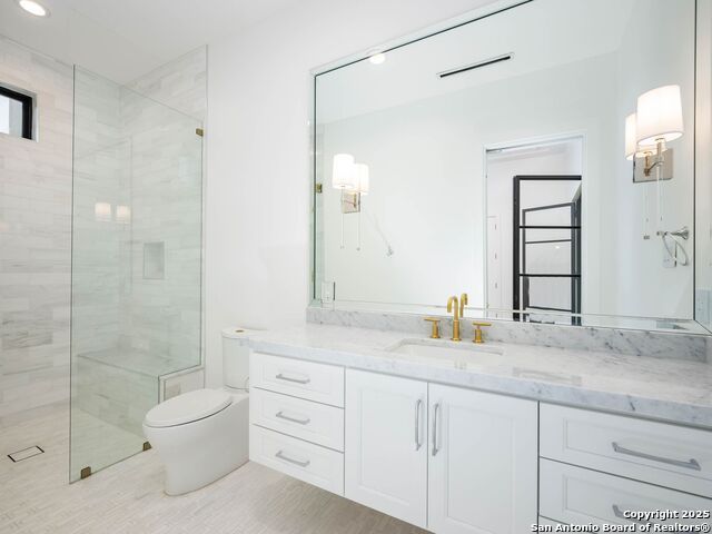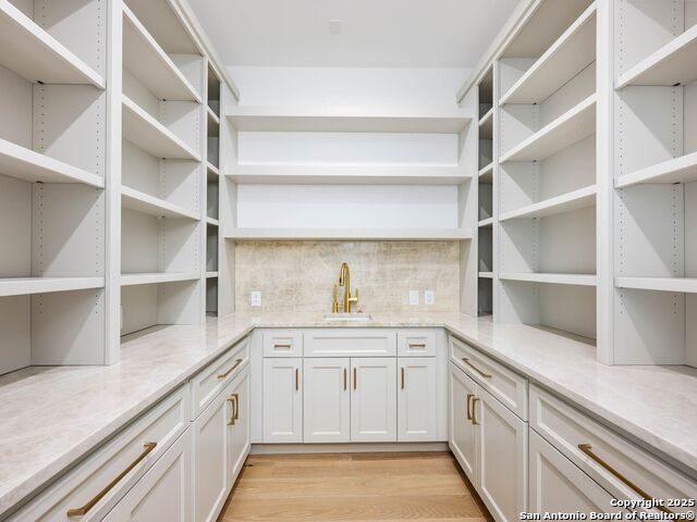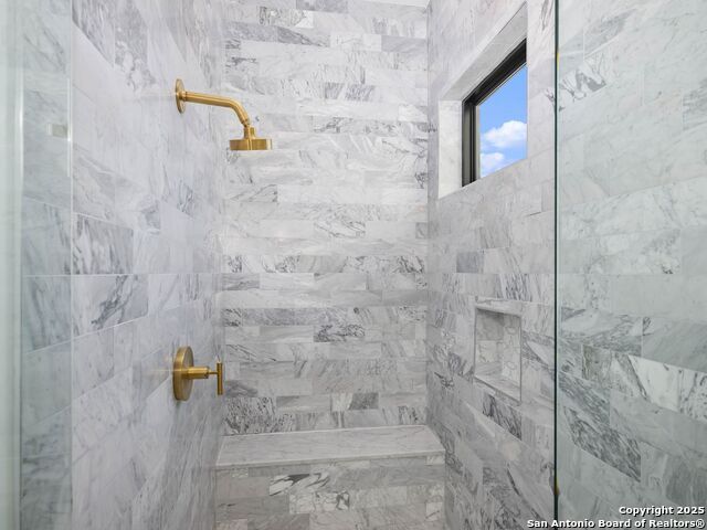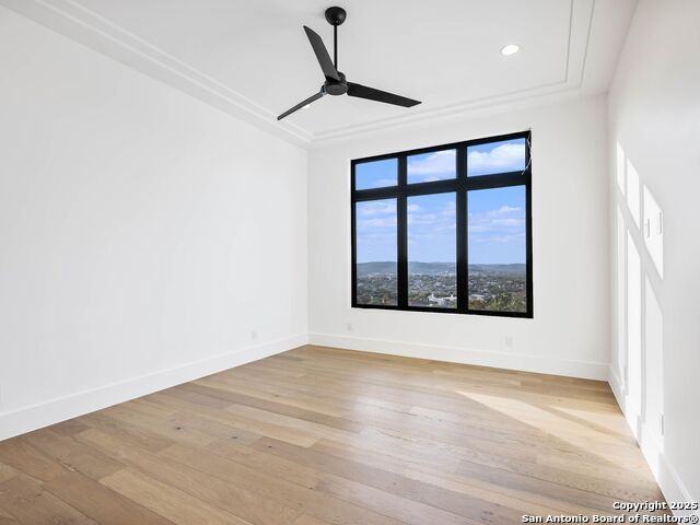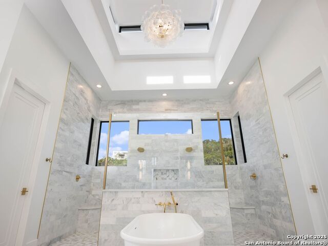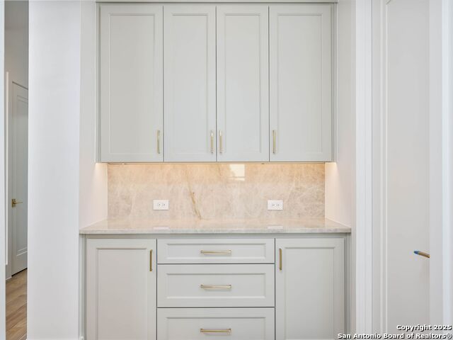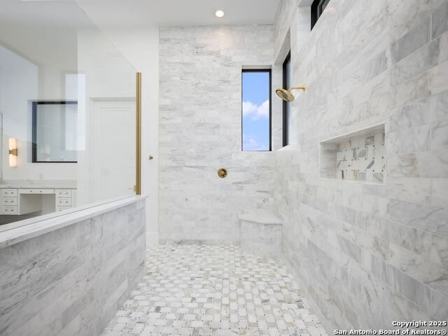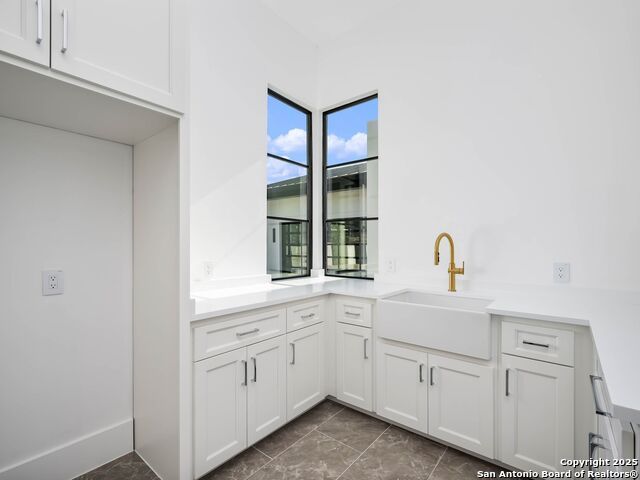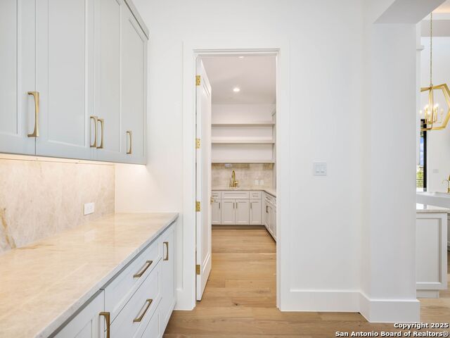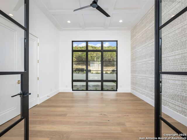 A striking transitional estate positioned along an exclusive cul-de-sac street within The Dominion, offering spectacular panoramic views and exceptional privacy. Walls of floor-to-ceiling glass fill the interiors with natural light, accentuating the home's remarkable craftsmanship and curated finishes. Designed on an impressive scale with soaring ceilings and verdant vistas, the interior showcases European white oak floors, smooth-finish walls, architectural ceiling details, designer lighting, and exquisite stone and marble selections throughout. The chef's kitchen features professional-grade stainless steel appliances and an oversized island that opens seamlessly to the family room, where soaring two-story ceilings and a stone-clad gas fireplace create an atmosphere of grandeur and warmth. The primary suite is a true sanctuary, offering patio access for morning coffee or evening relaxation, dual spa-like baths with separate vanities, and two custom-fitted closets with glass display cabinetry. Three spacious guest bedrooms each feature en-suite baths, while an expansive game room with a full wet bar provides an ideal setting for entertaining. Outdoors, a large covered patio with a full kitchen overlooks the resort-style pool and spa framed by sweeping Hill Country views. A four-car side-entry garage with epoxy-finished floors is complemented by an additional two-car garage and generous guest parking. Every element of this residence reflects thoughtful design and timeless luxury.